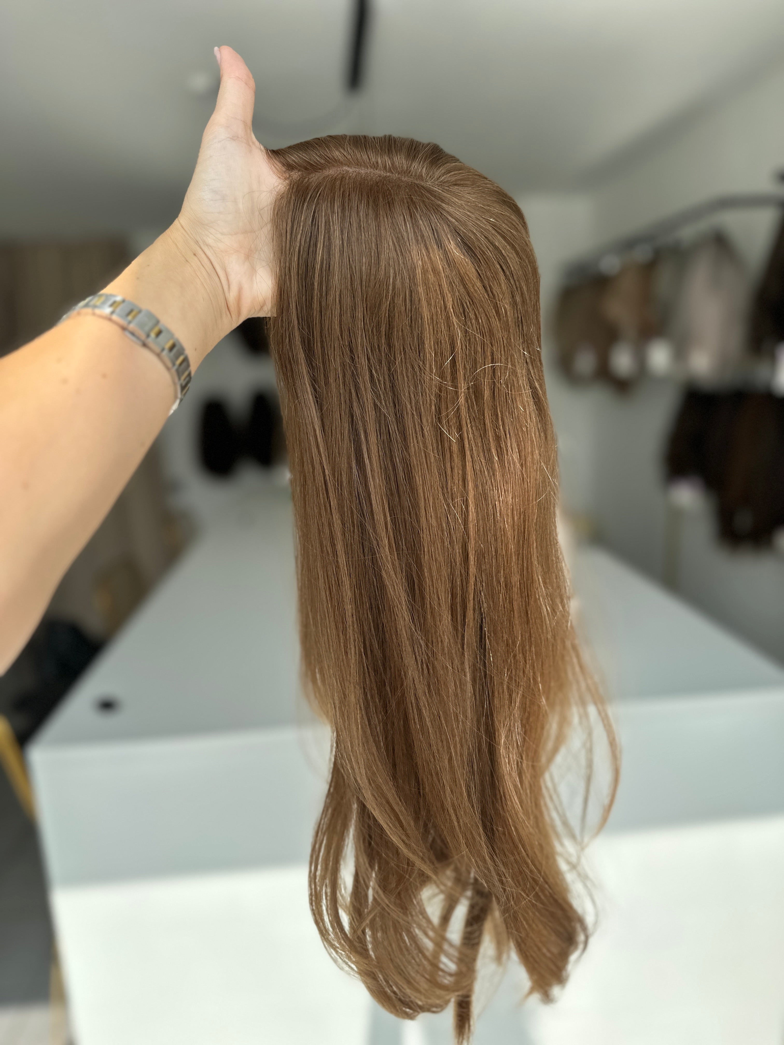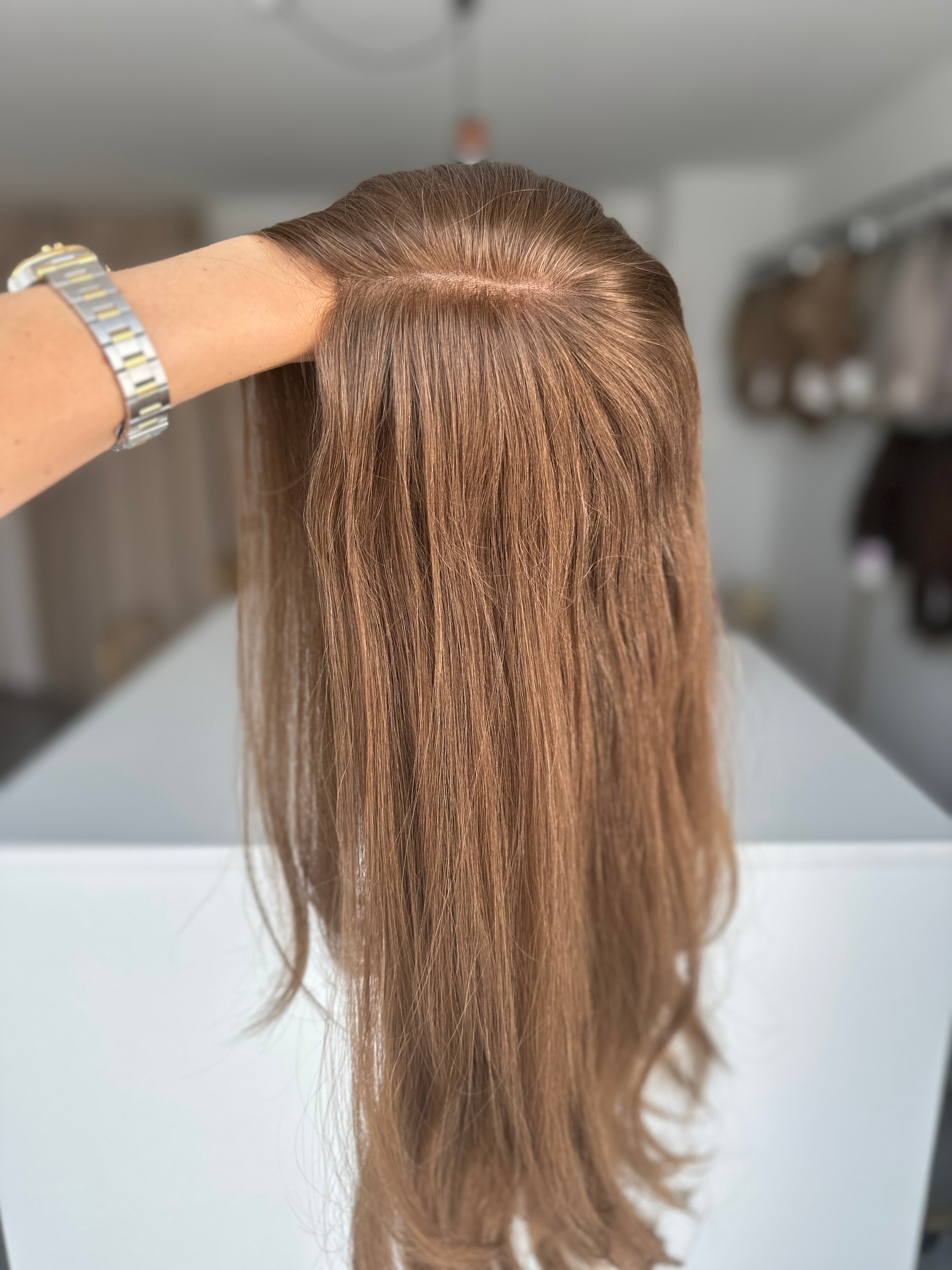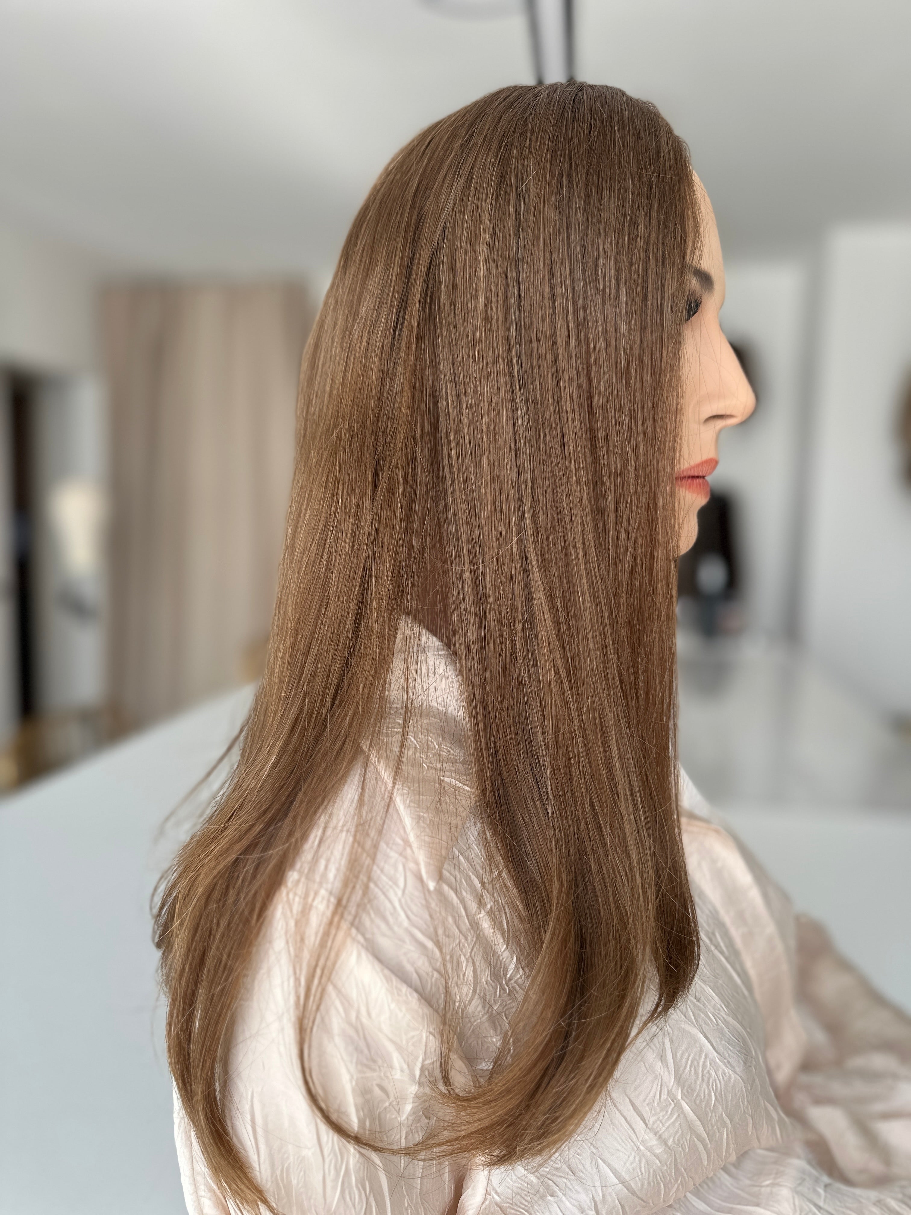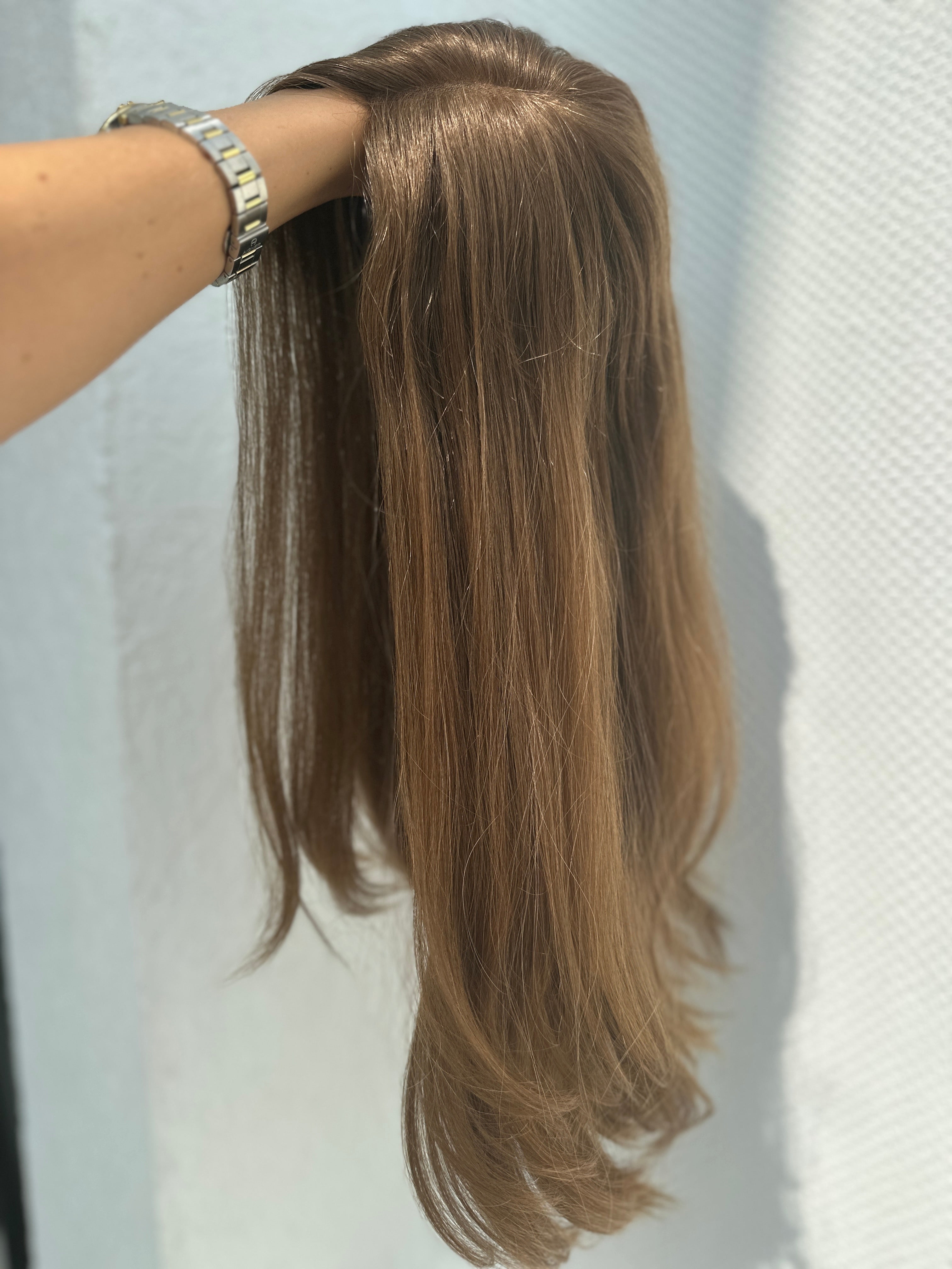 Abhängig von deinem Haarschnitt kann es sinnvoll sein, den Topper von deinem Friseur professionell anpassen zu lassen. So wird ein nahtloser und natürlicher Übergang gewährleistet, der das Gesamtbild harmonisch wirken lässt.