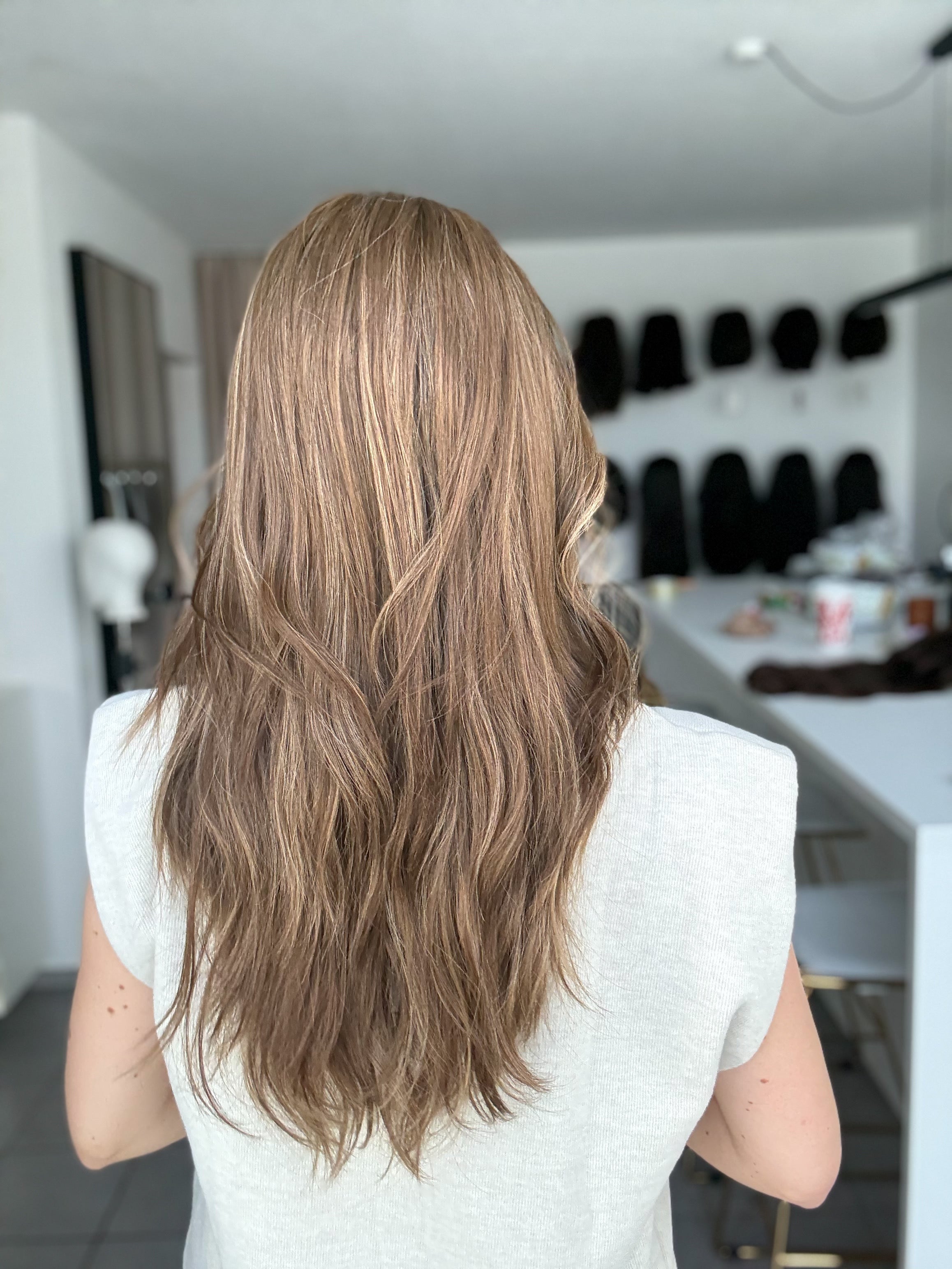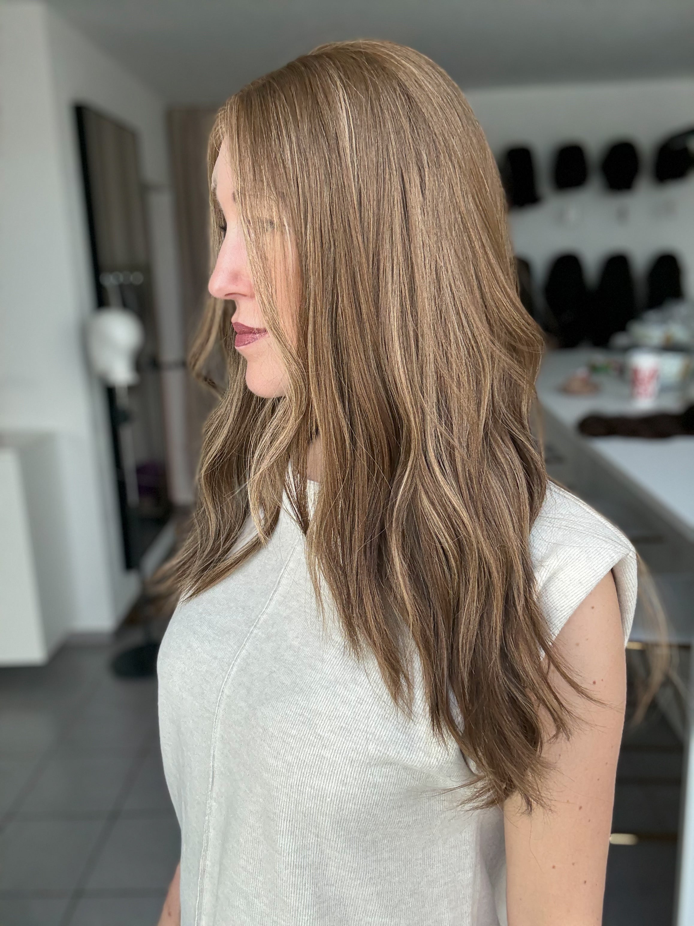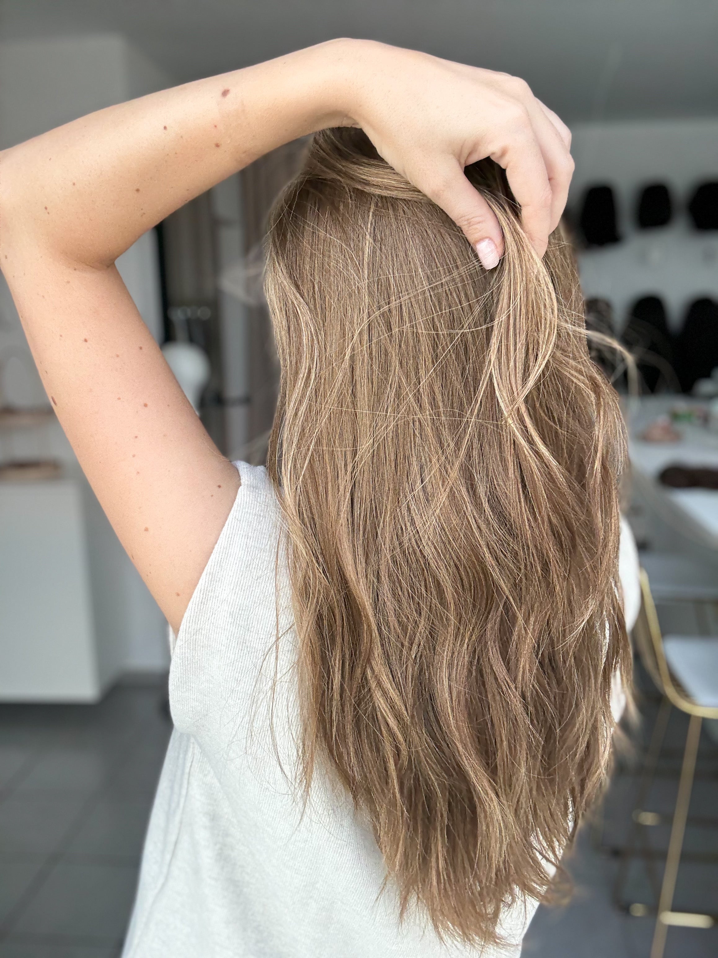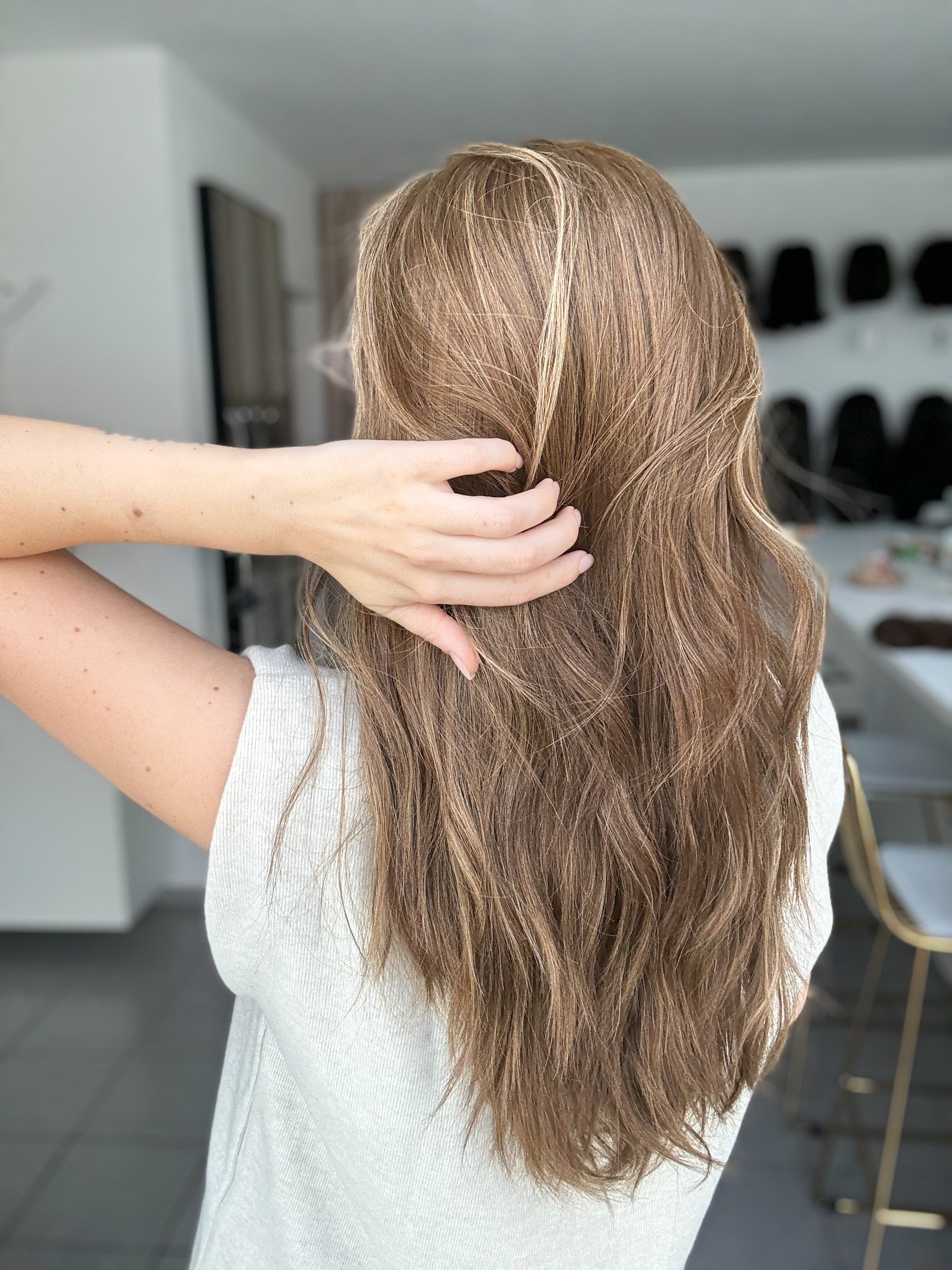 - Farbe: Hellbraun mit blonden Highlights (eher etwas warm als aschig)