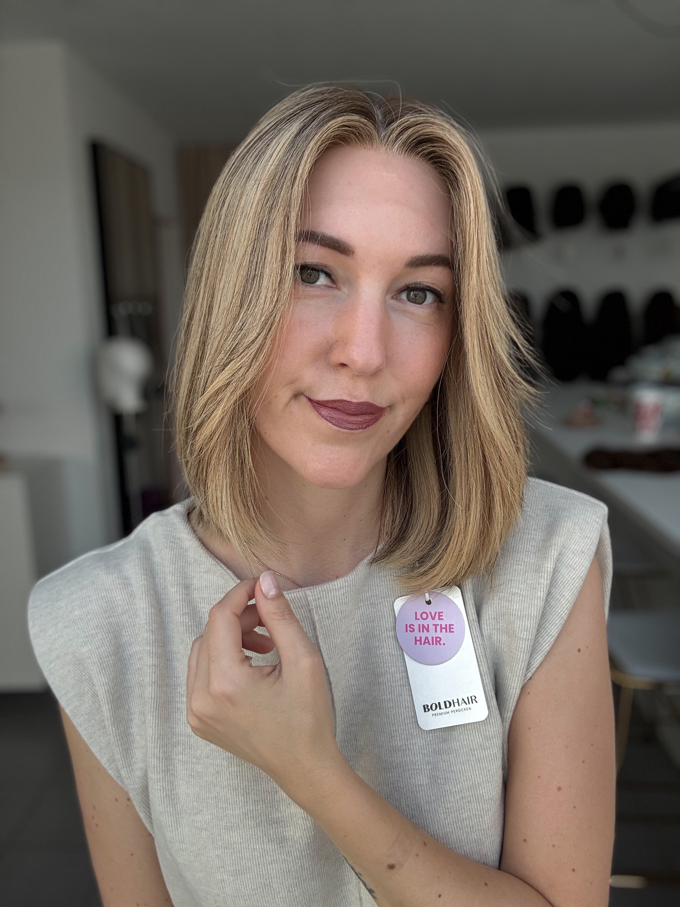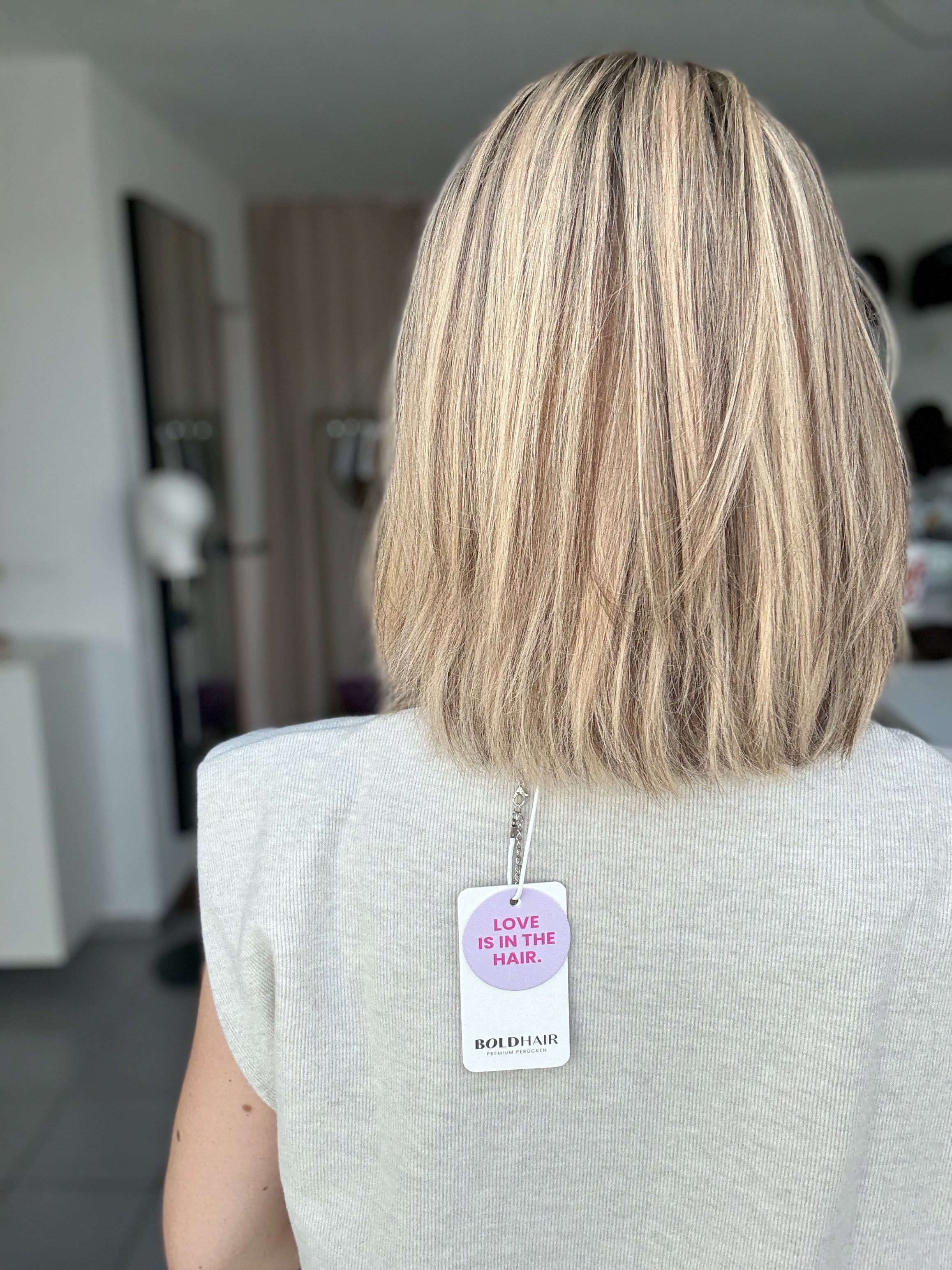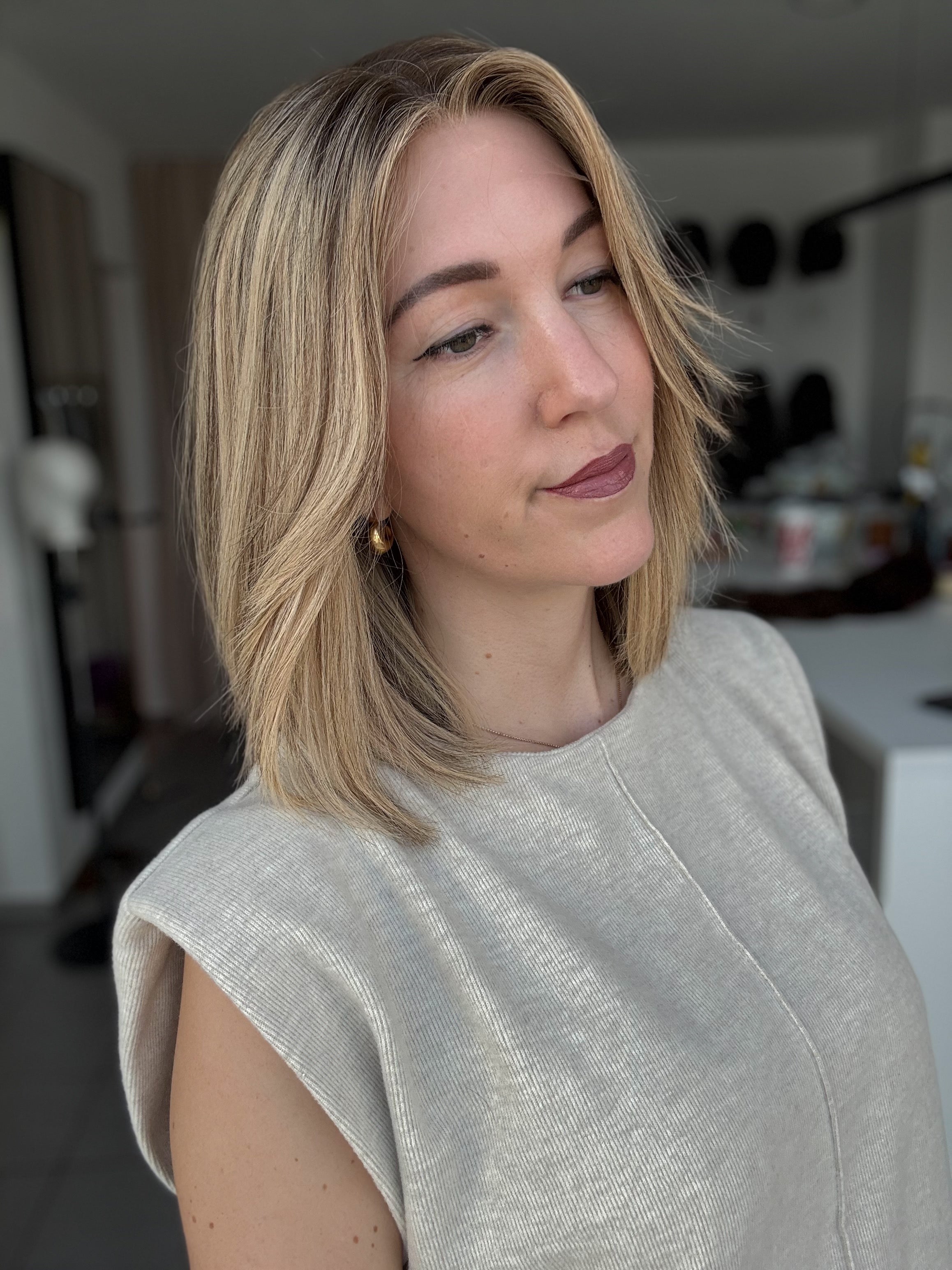 - Farbe: Blond mit High- und Lowlights und dunklem Rooting