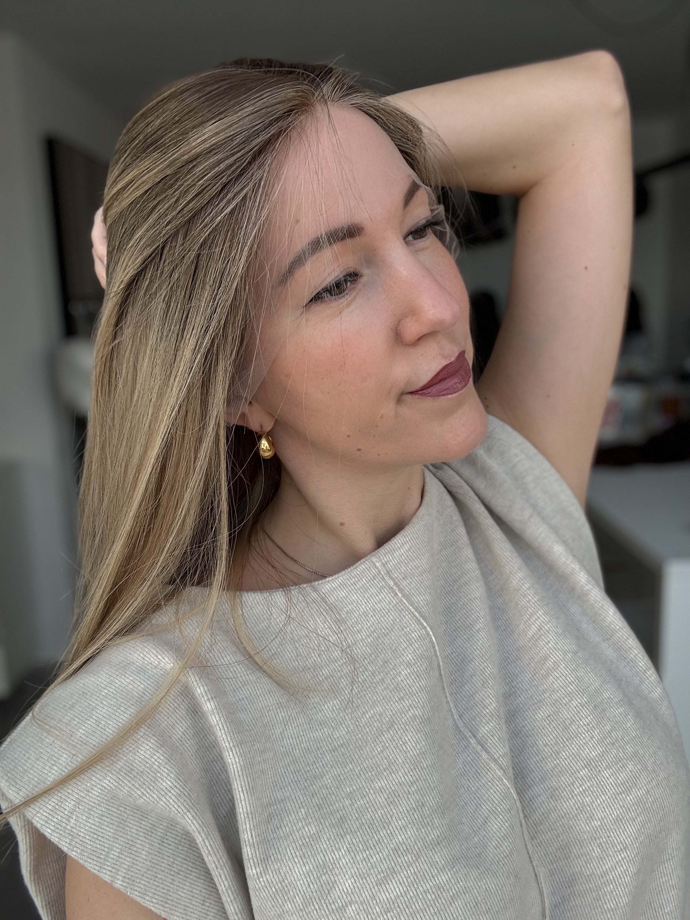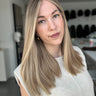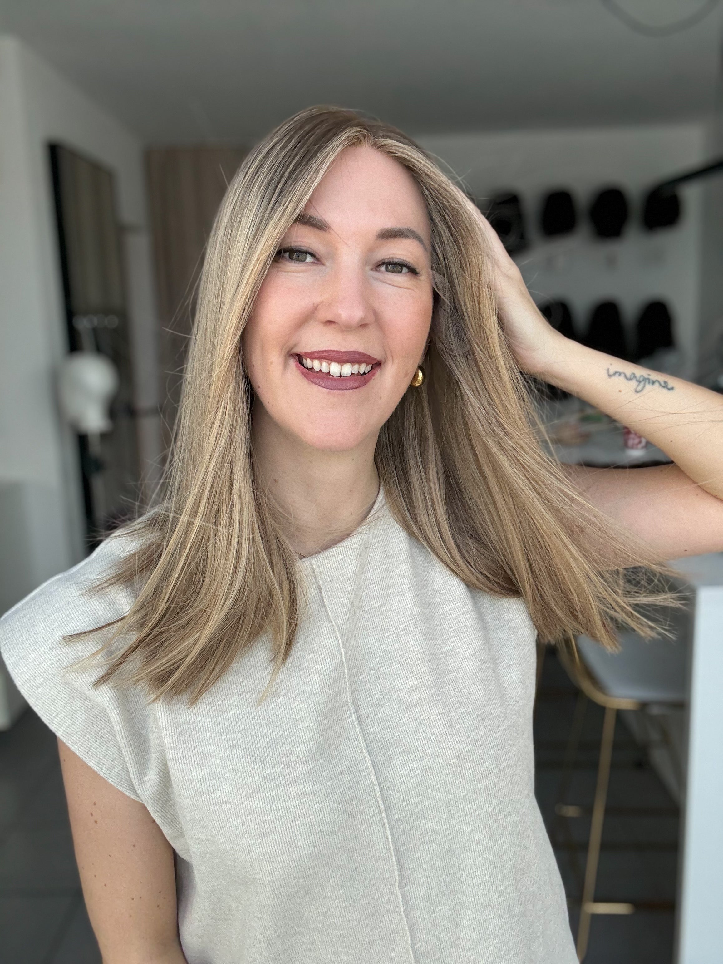 • Farbe: Dunkelblond mit vielen wärmeren und kühleren High- und Lowlights, dunkleres Rooting