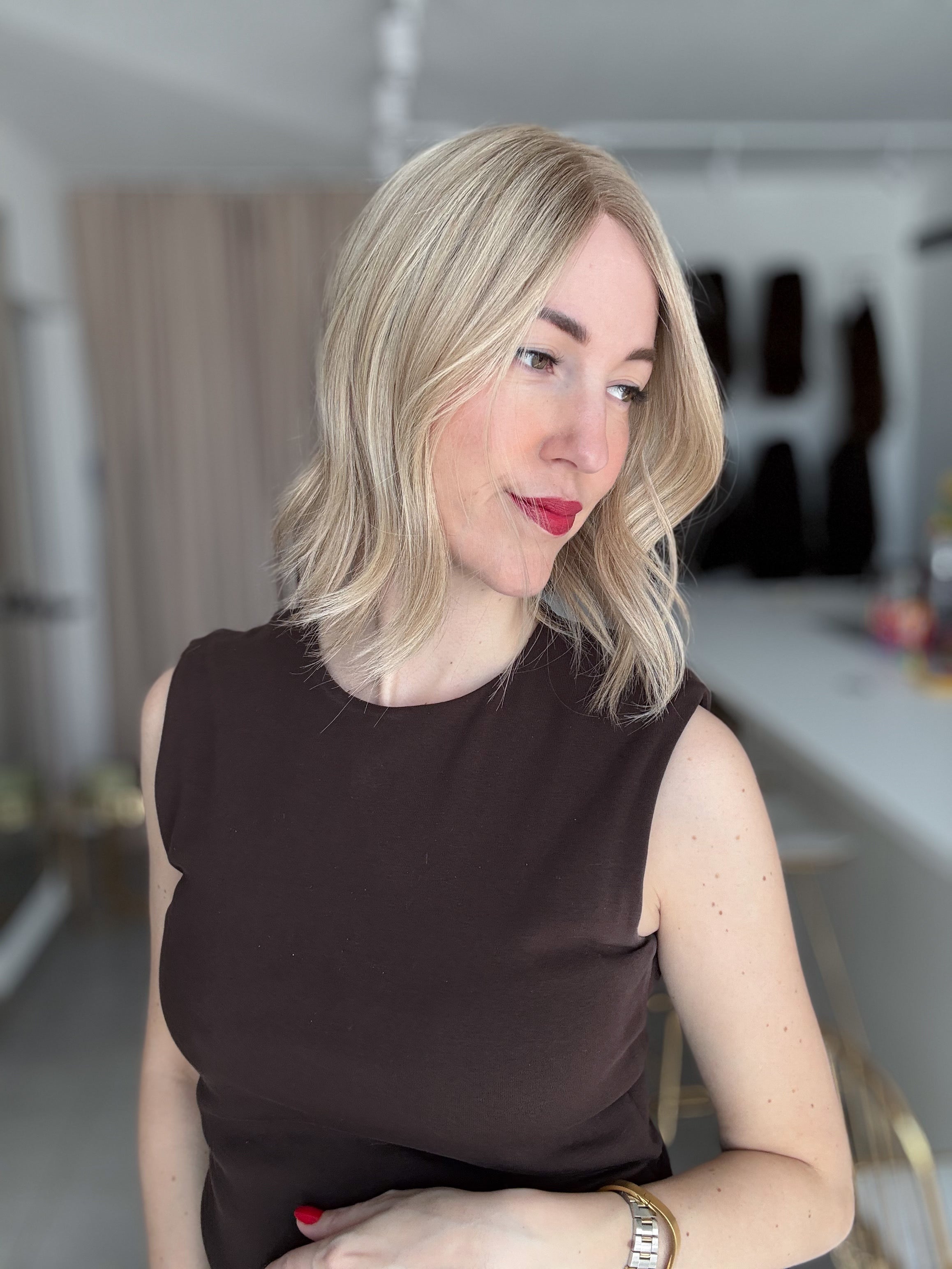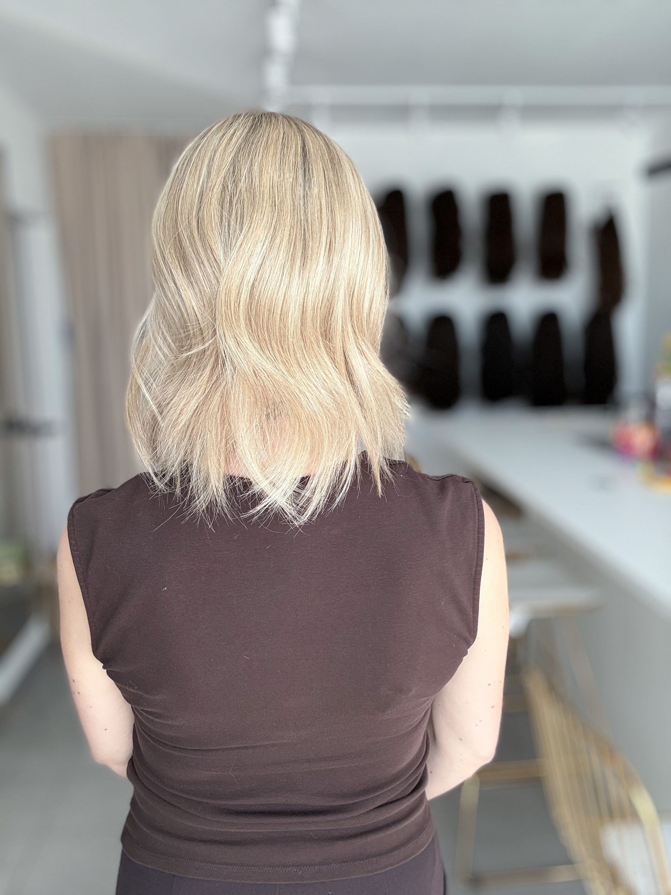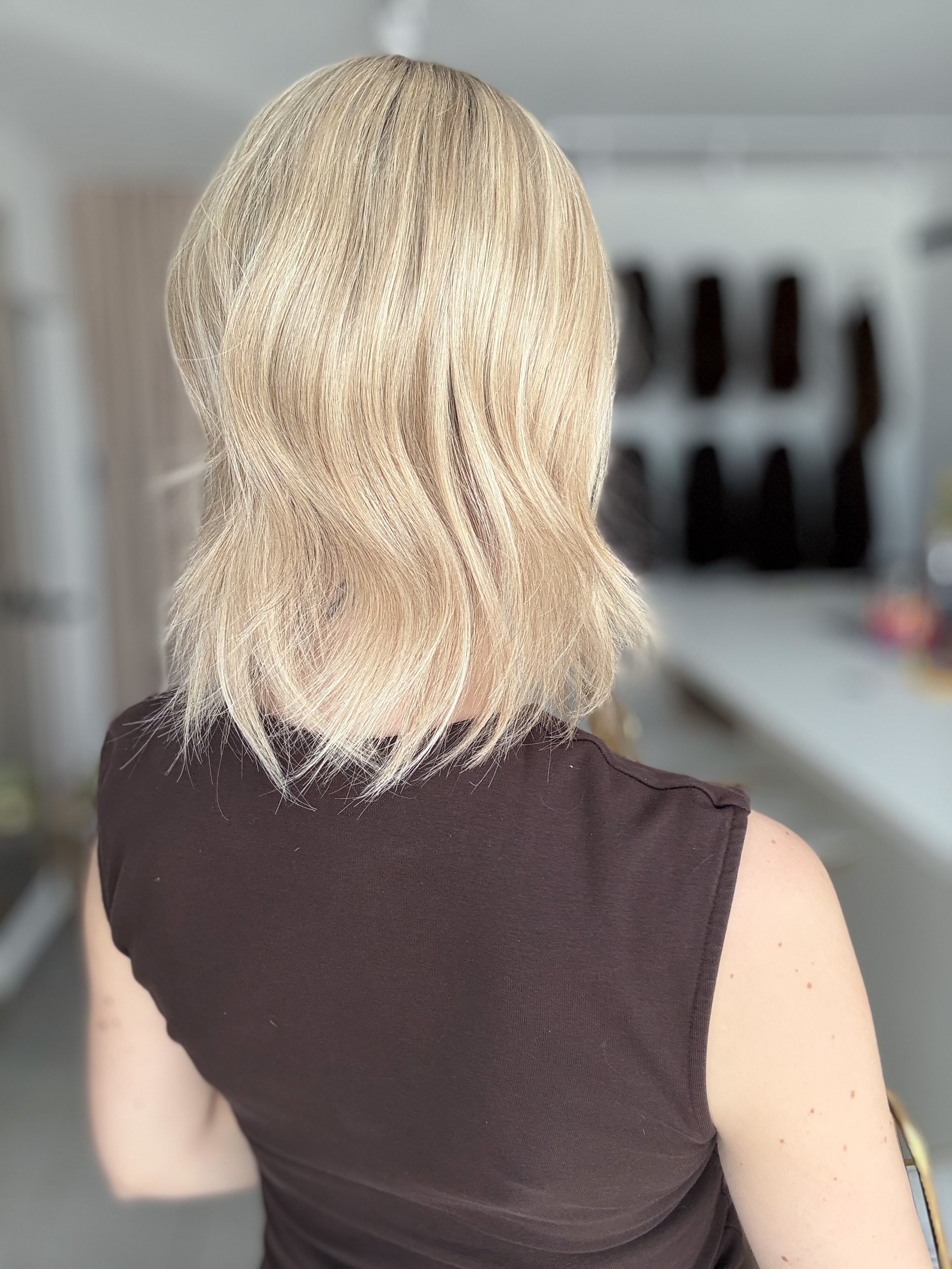- Farbe: Schwedenblond mit leichtem Shadowrooting und feinen Highlights