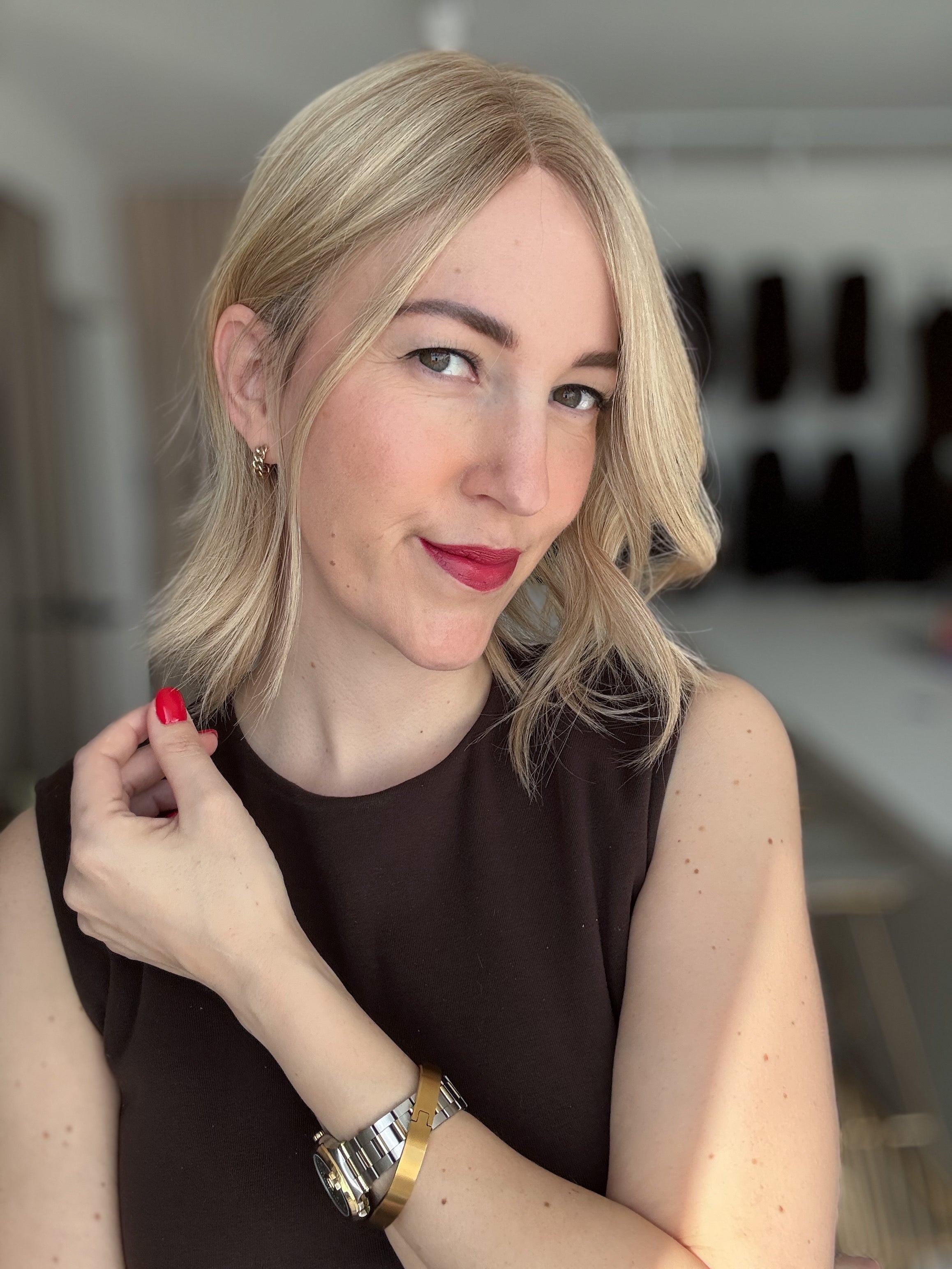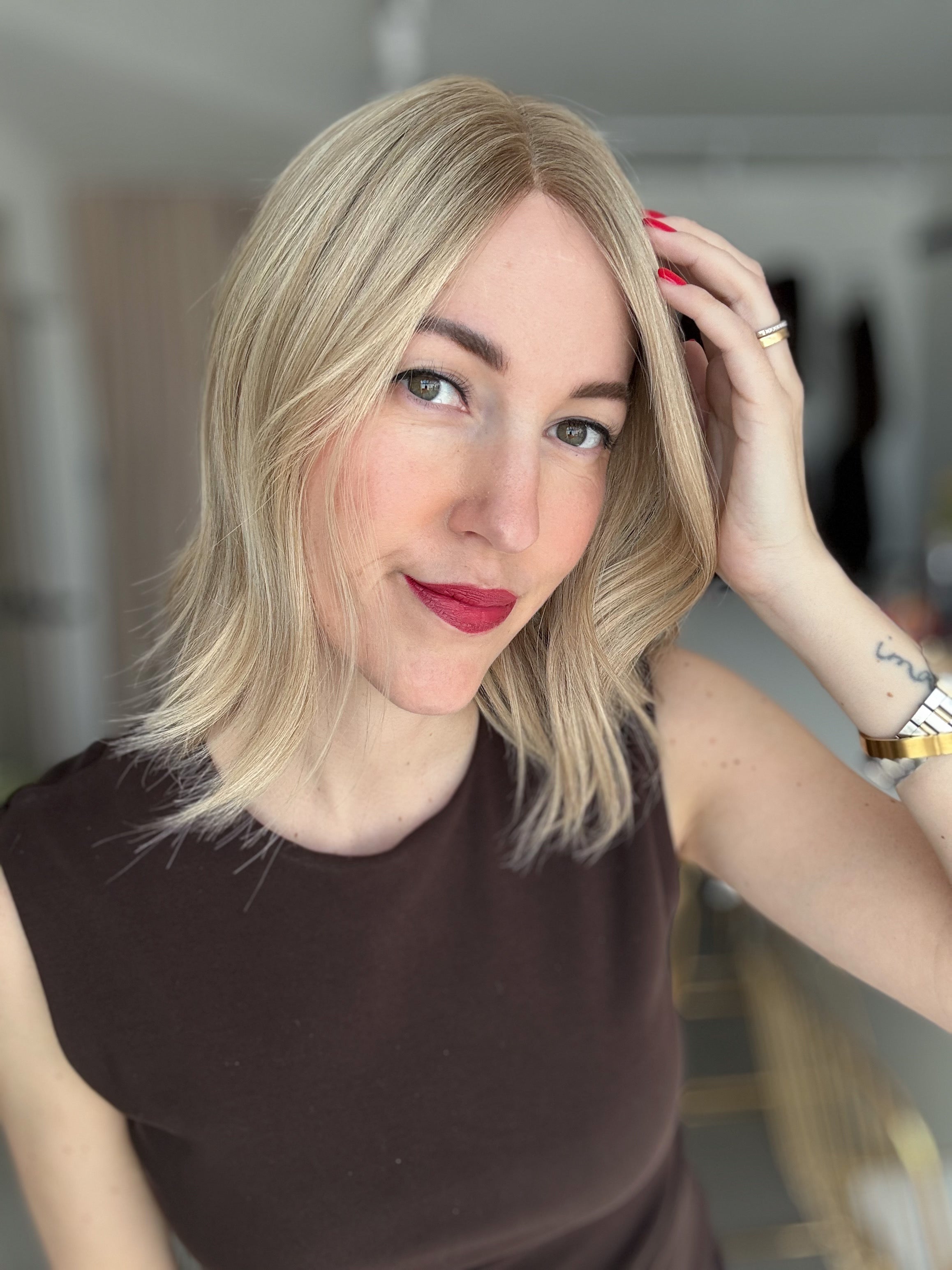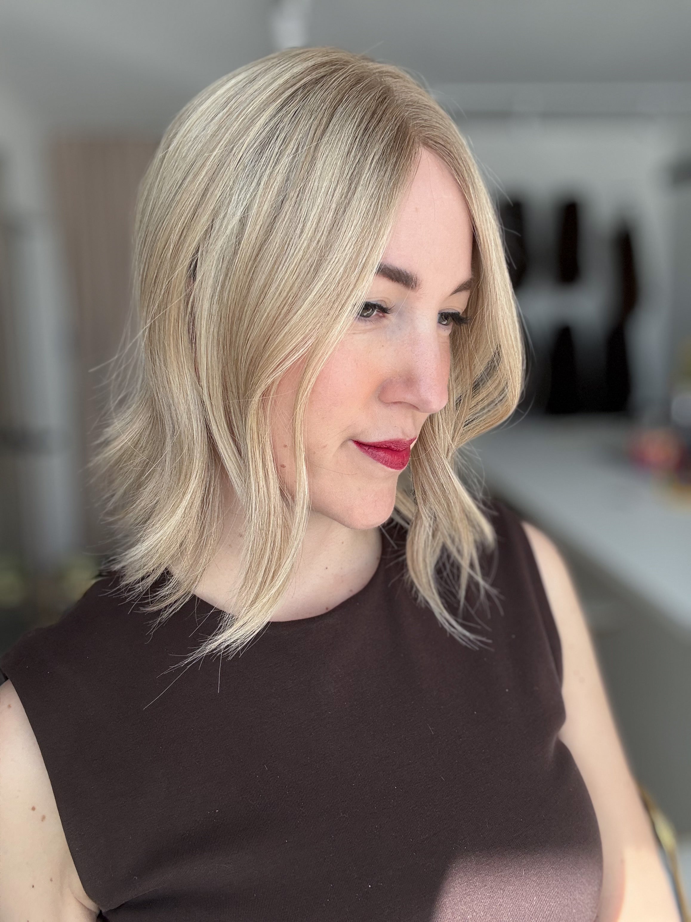 - Farbe: Schwedenblond mit leichtem Shadowrooting und feinen Highlights