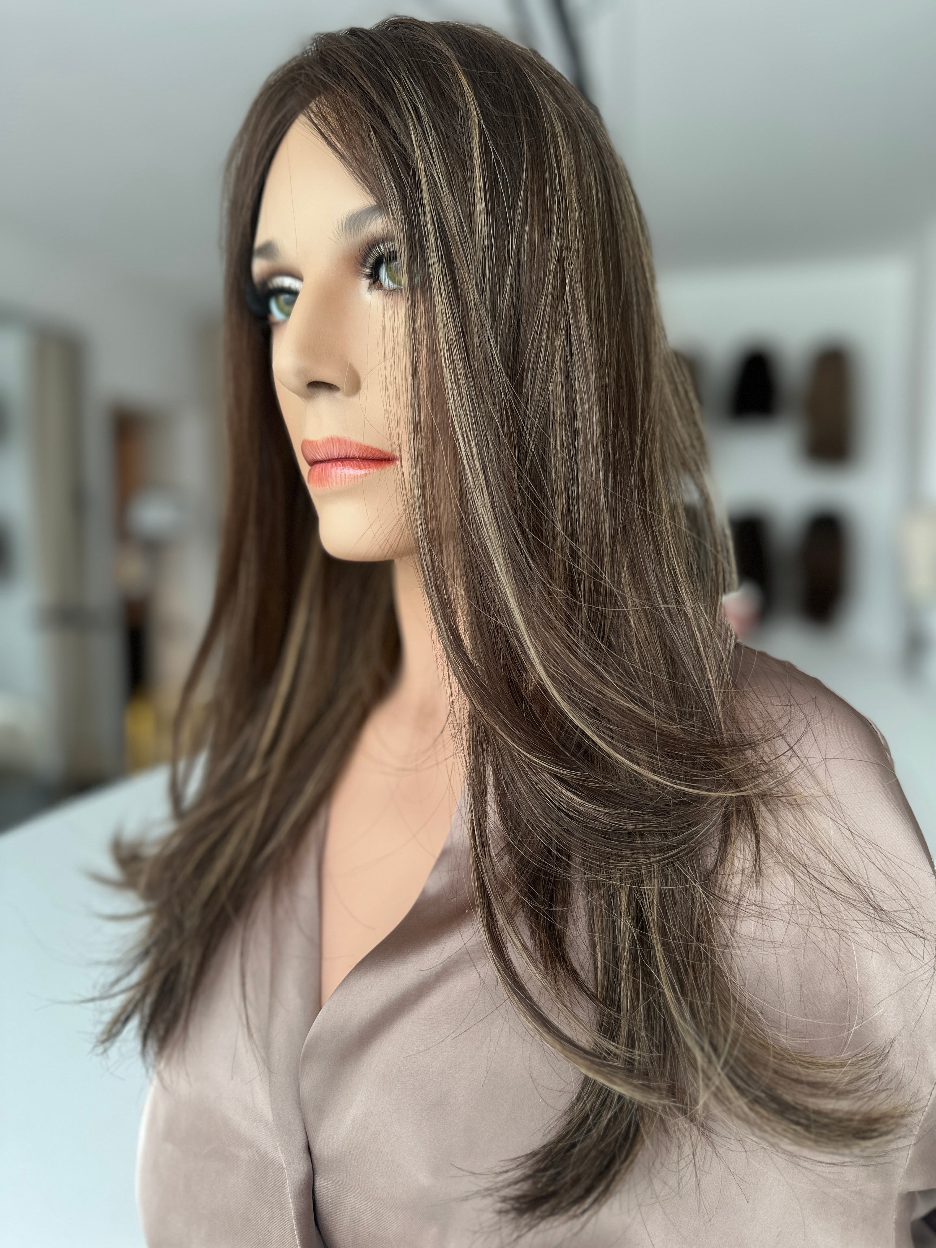 - Farbe: Mittel- bis Dunkelbraun mit neutralblonden Highlights