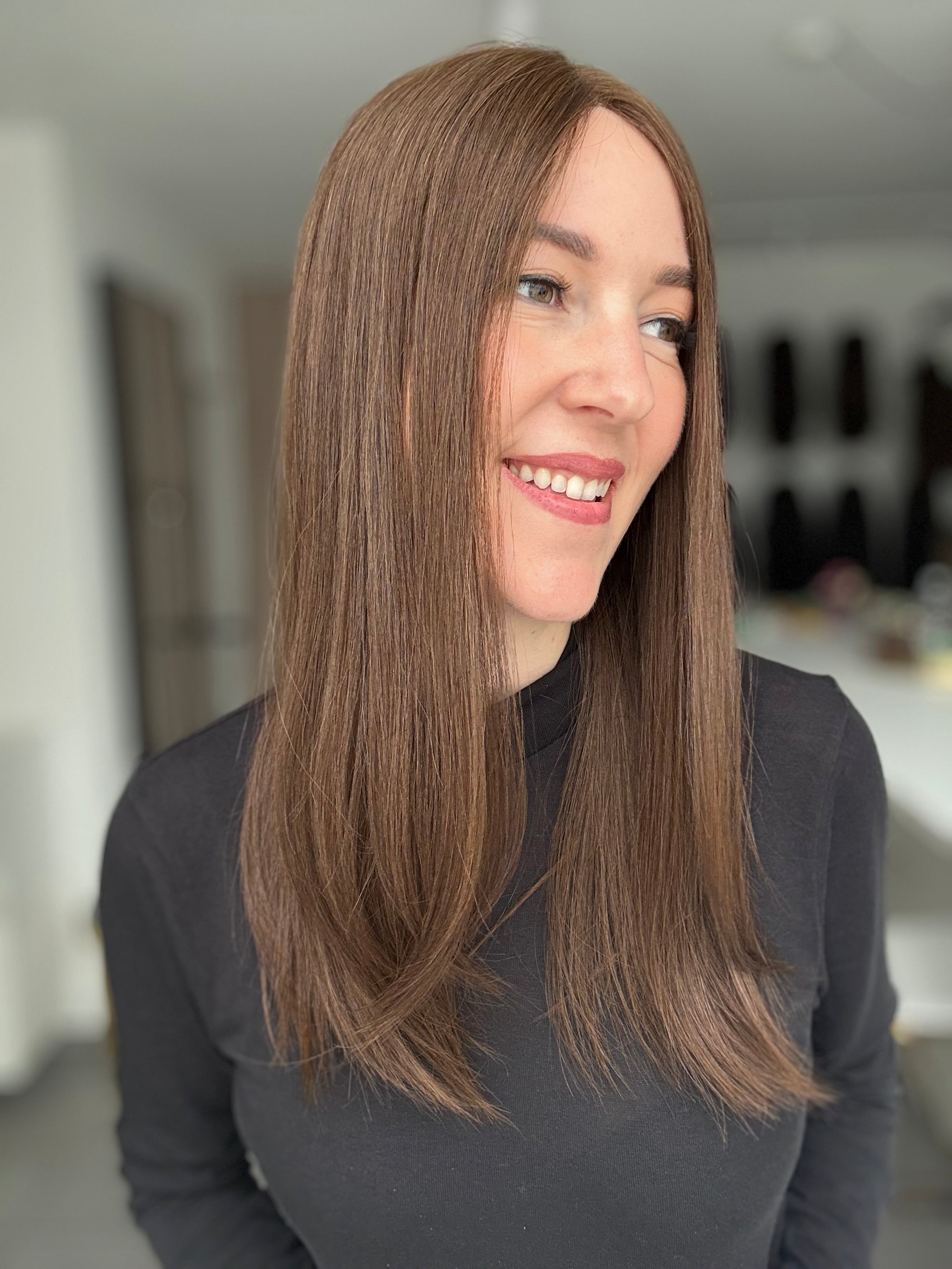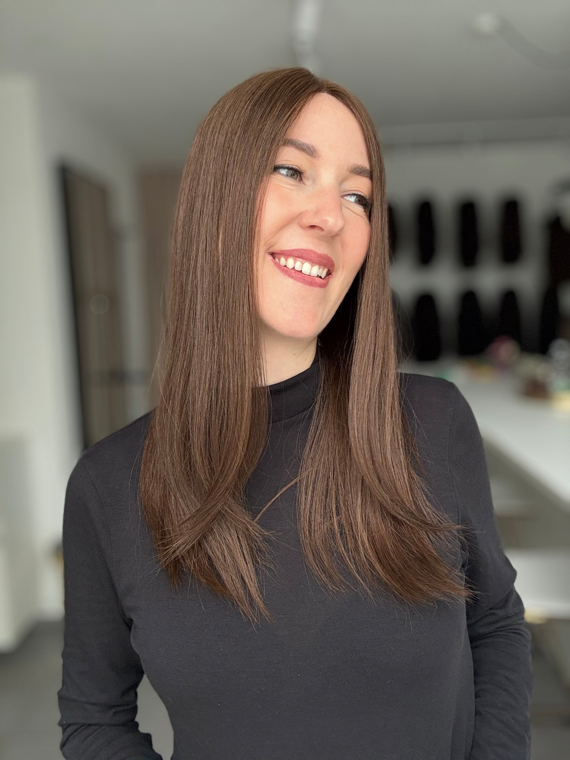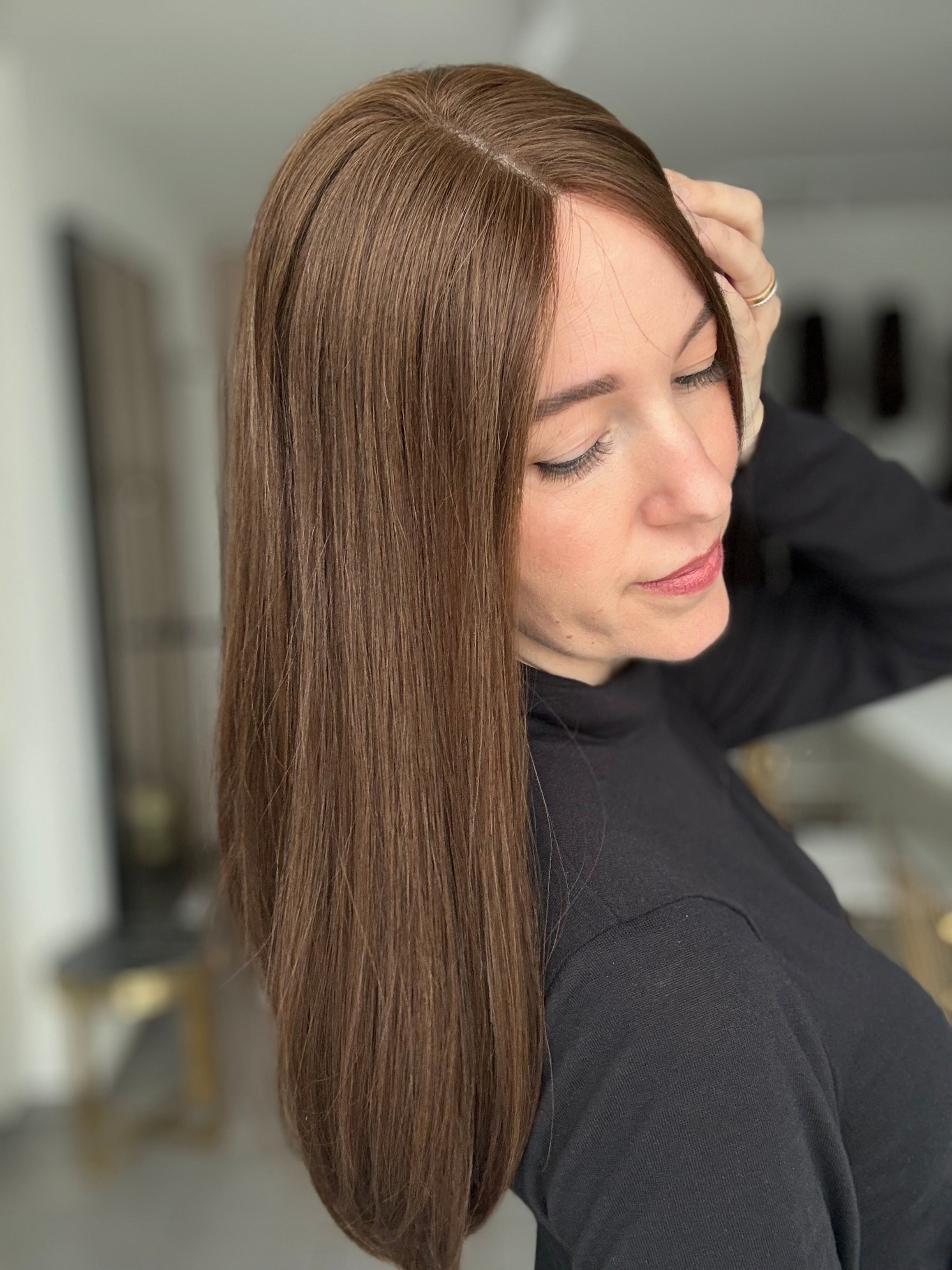 Abhängig von deinem Haarschnitt kann es sinnvoll sein, den Topper von deinem Friseur professionell anpassen zu lassen. So wird ein nahtloser und natürlicher Übergang gewährleistet, der das Gesamtbild harmonisch wirken lässt.