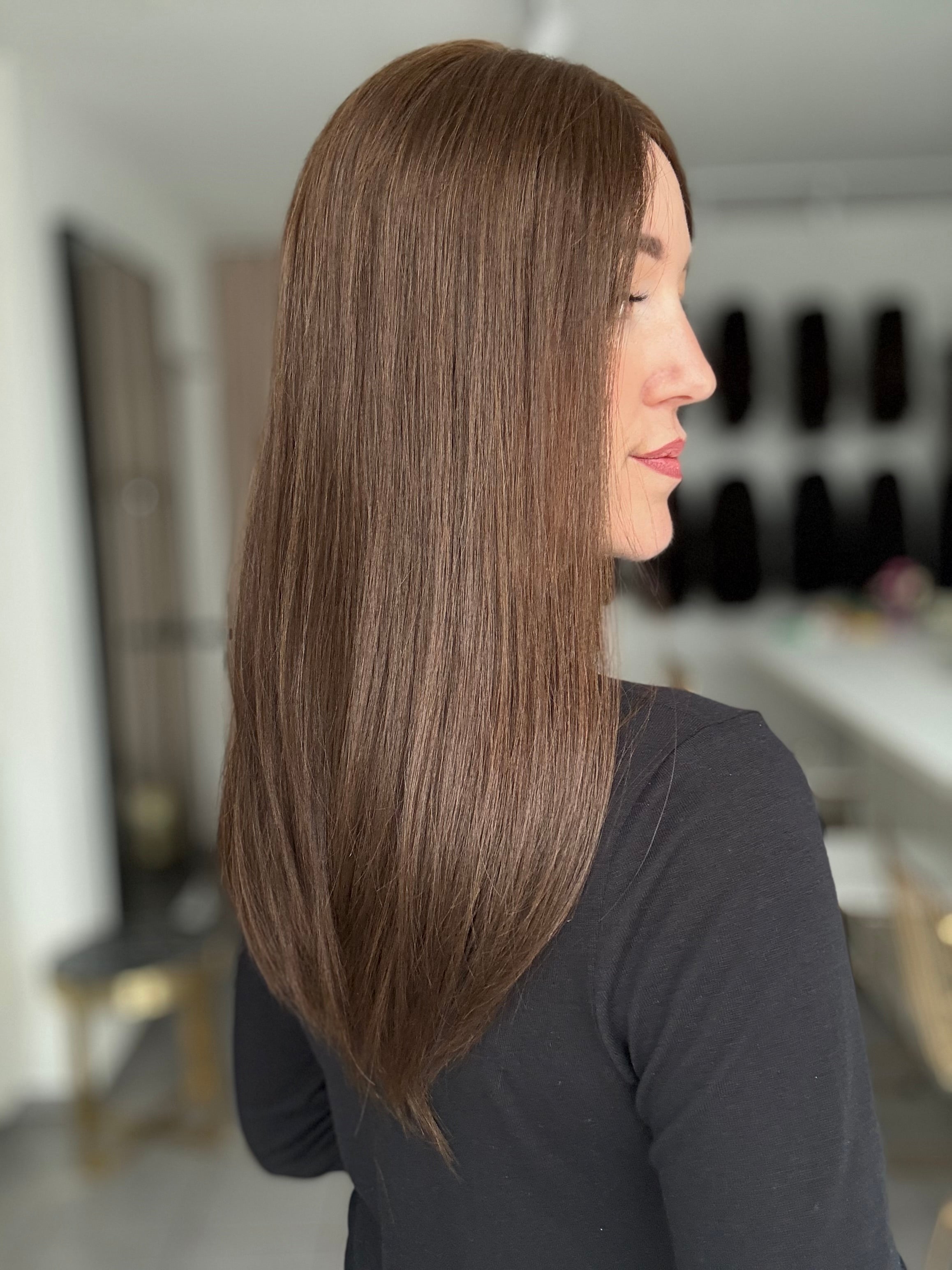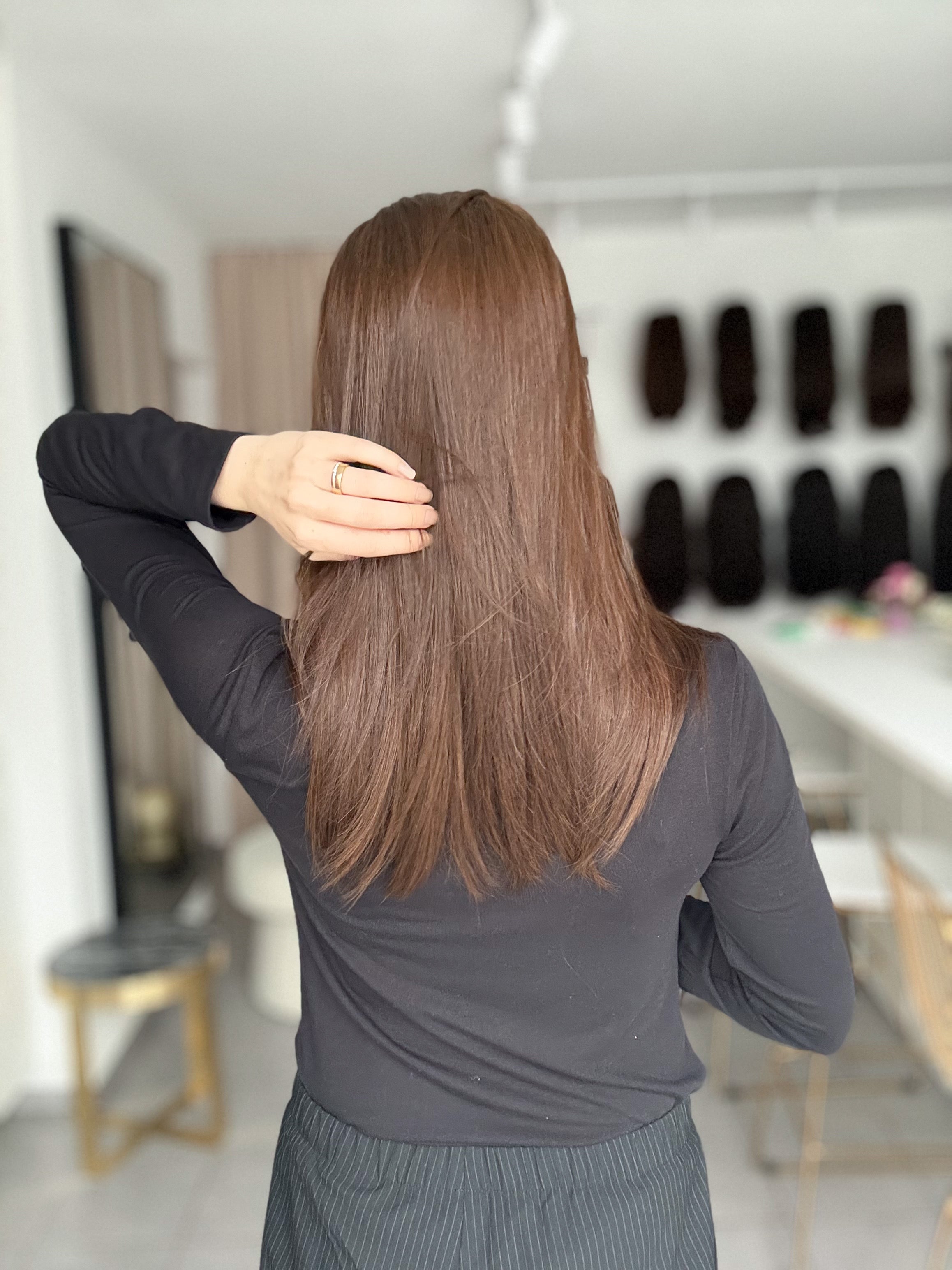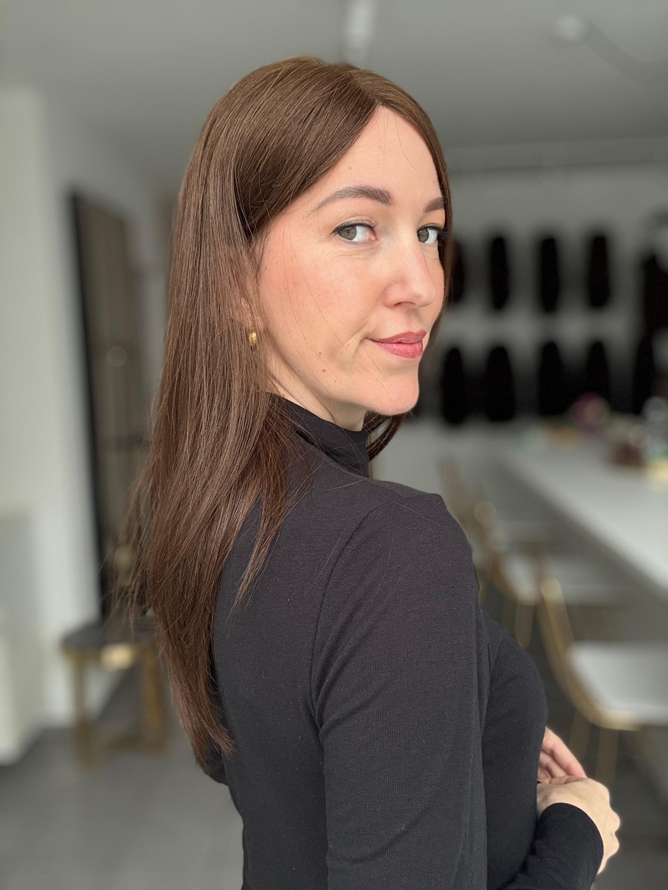 Abhängig von deinem Haarschnitt kann es sinnvoll sein, den Topper von deinem Friseur professionell anpassen zu lassen. So wird ein nahtloser und natürlicher Übergang gewährleistet, der das Gesamtbild harmonisch wirken lässt.