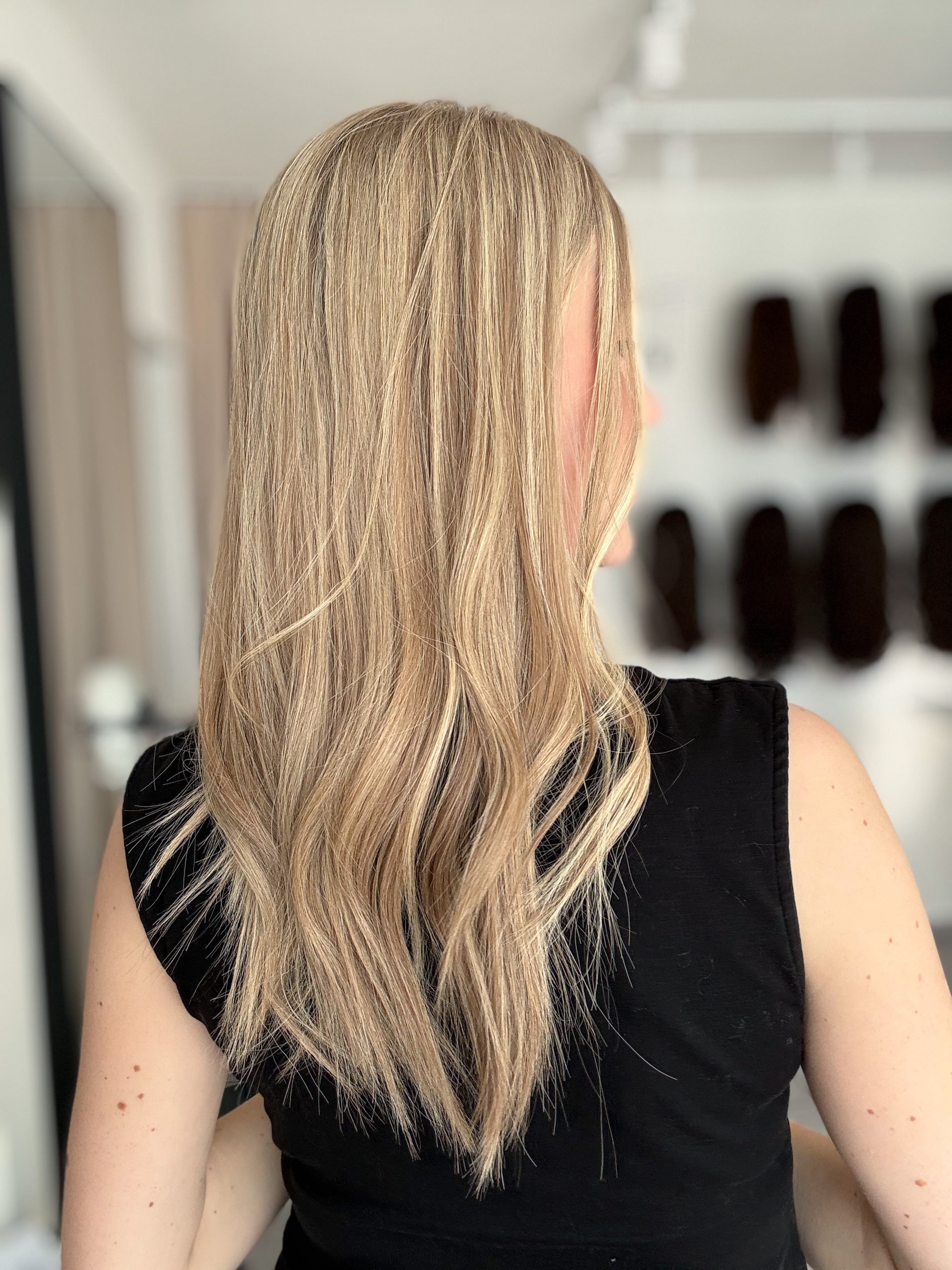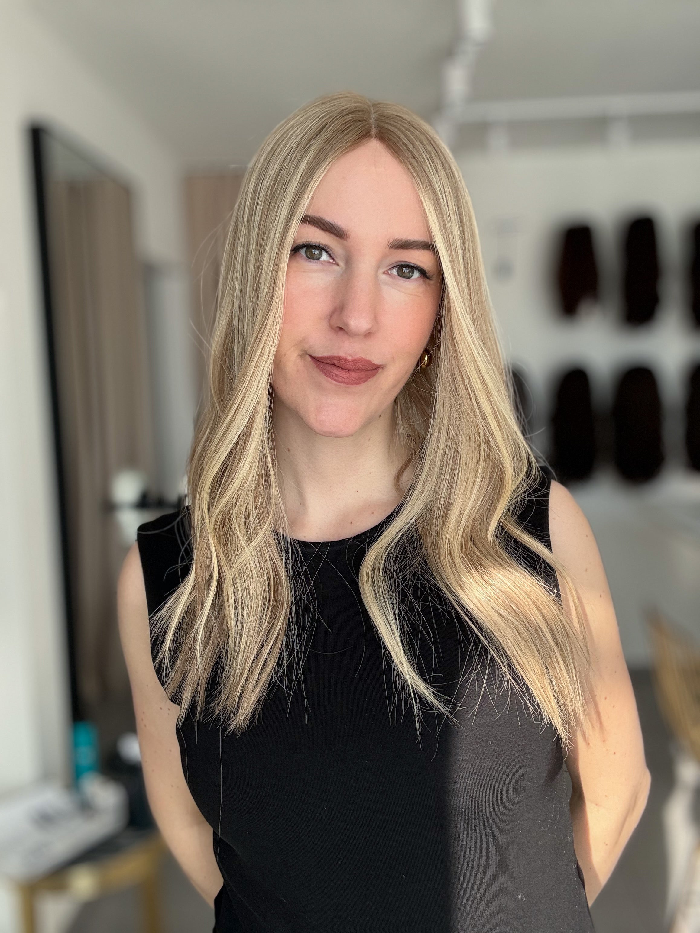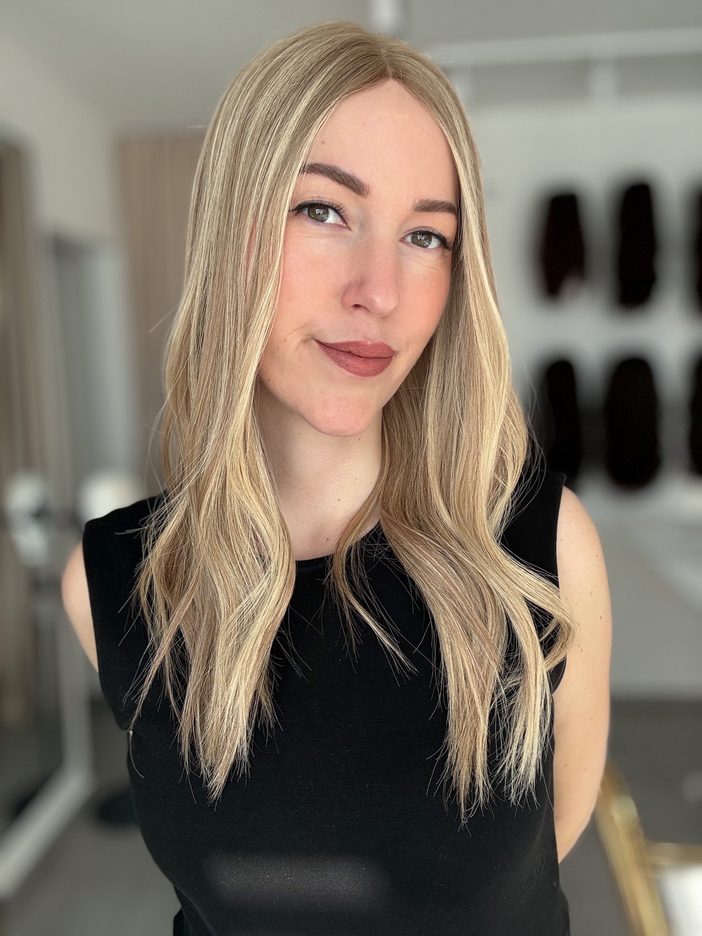 Bei Modellen mit dunklerem Ansatz kann es zudem super stimmig wirken, wenn die Farbe deines Eigenhaars dem Ton des Ansatzes ähnelt. Dadurch entsteht ein natürlicher Übergang, der das Gesamtbild noch harmonischer erscheinen lässt.