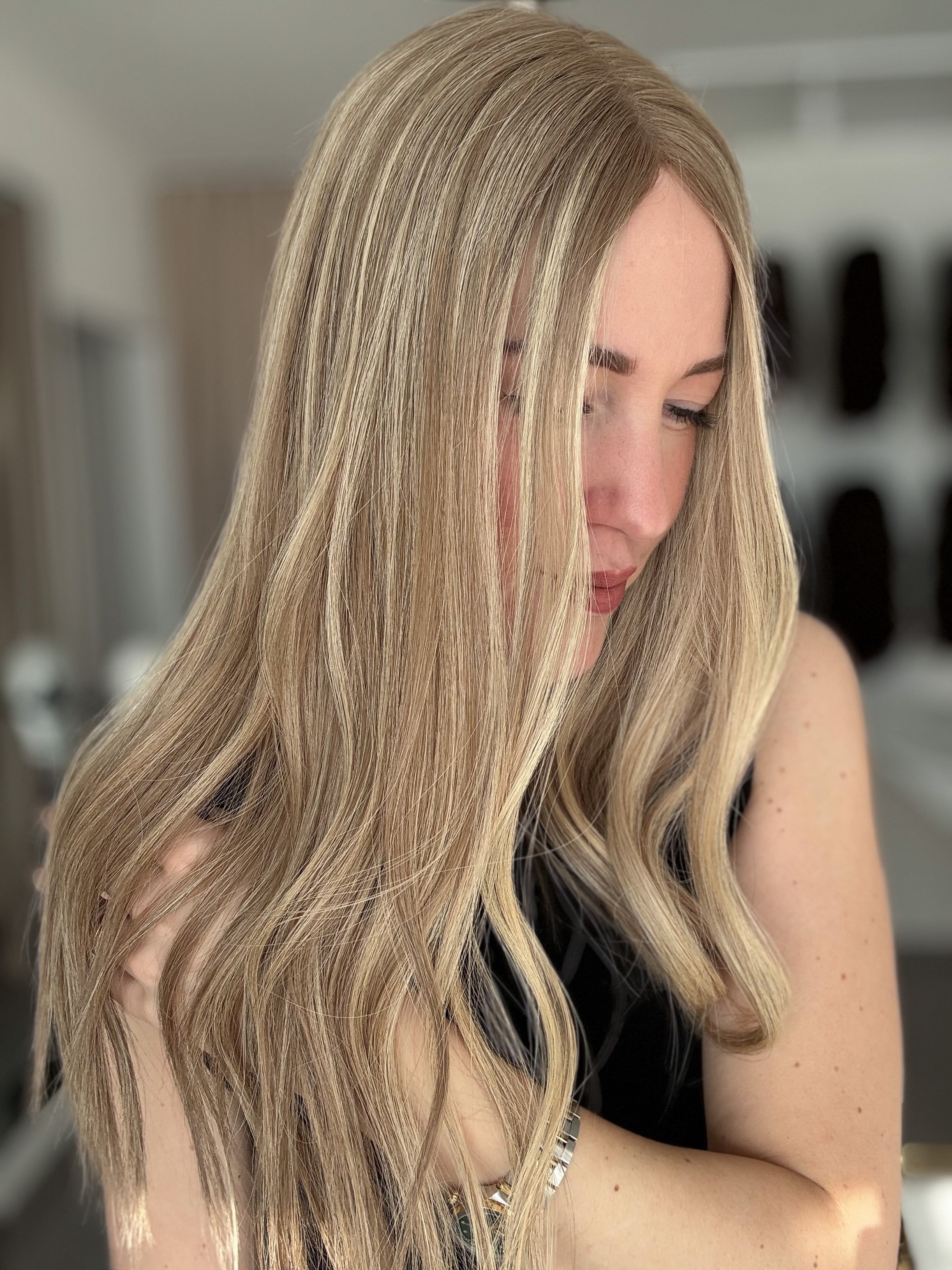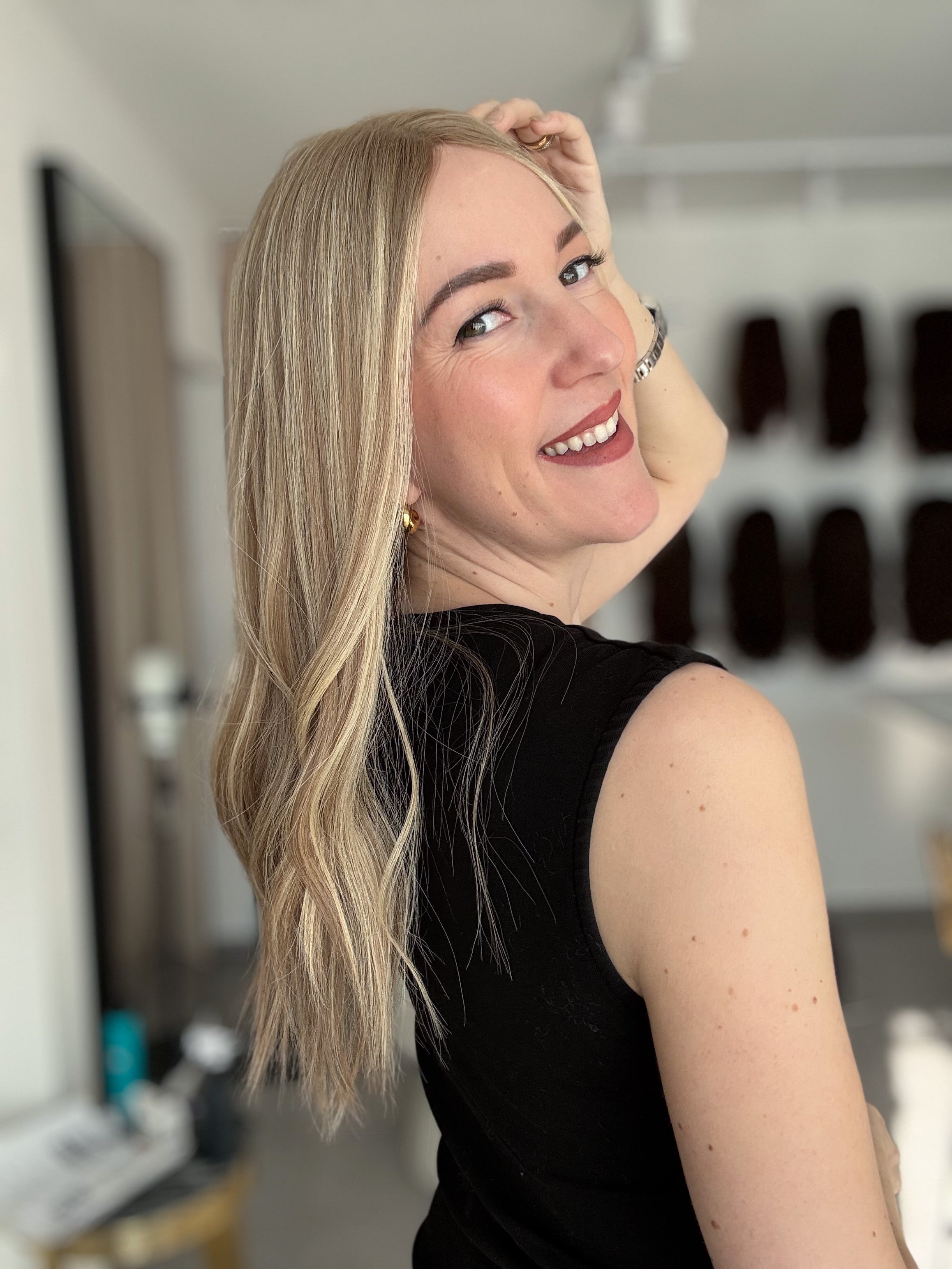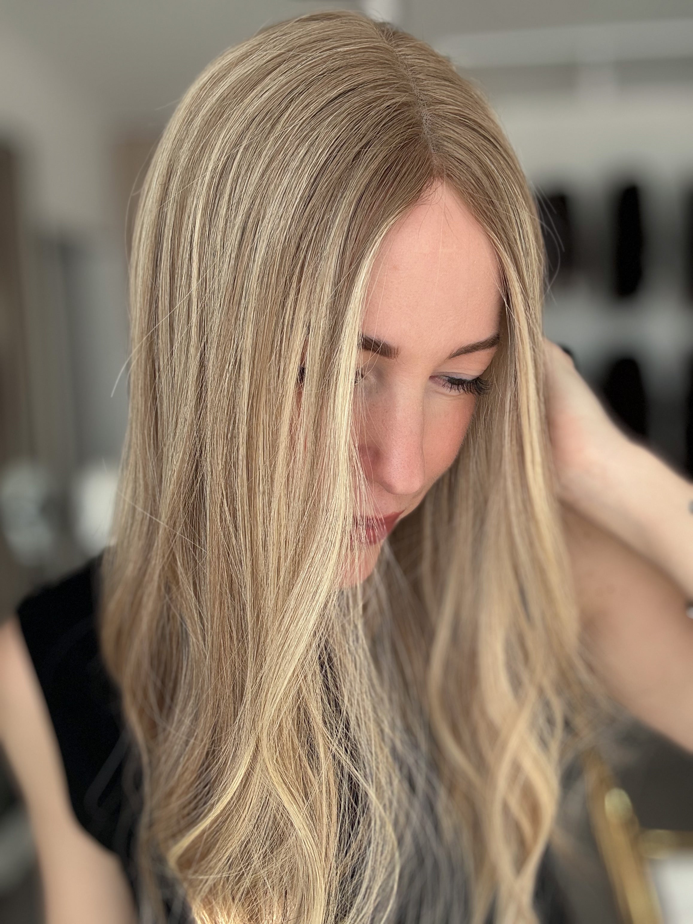 Bei Modellen mit dunklerem Ansatz kann es zudem super stimmig wirken, wenn die Farbe deines Eigenhaars dem Ton des Ansatzes ähnelt. Dadurch entsteht ein natürlicher Übergang, der das Gesamtbild noch harmonischer erscheinen lässt.