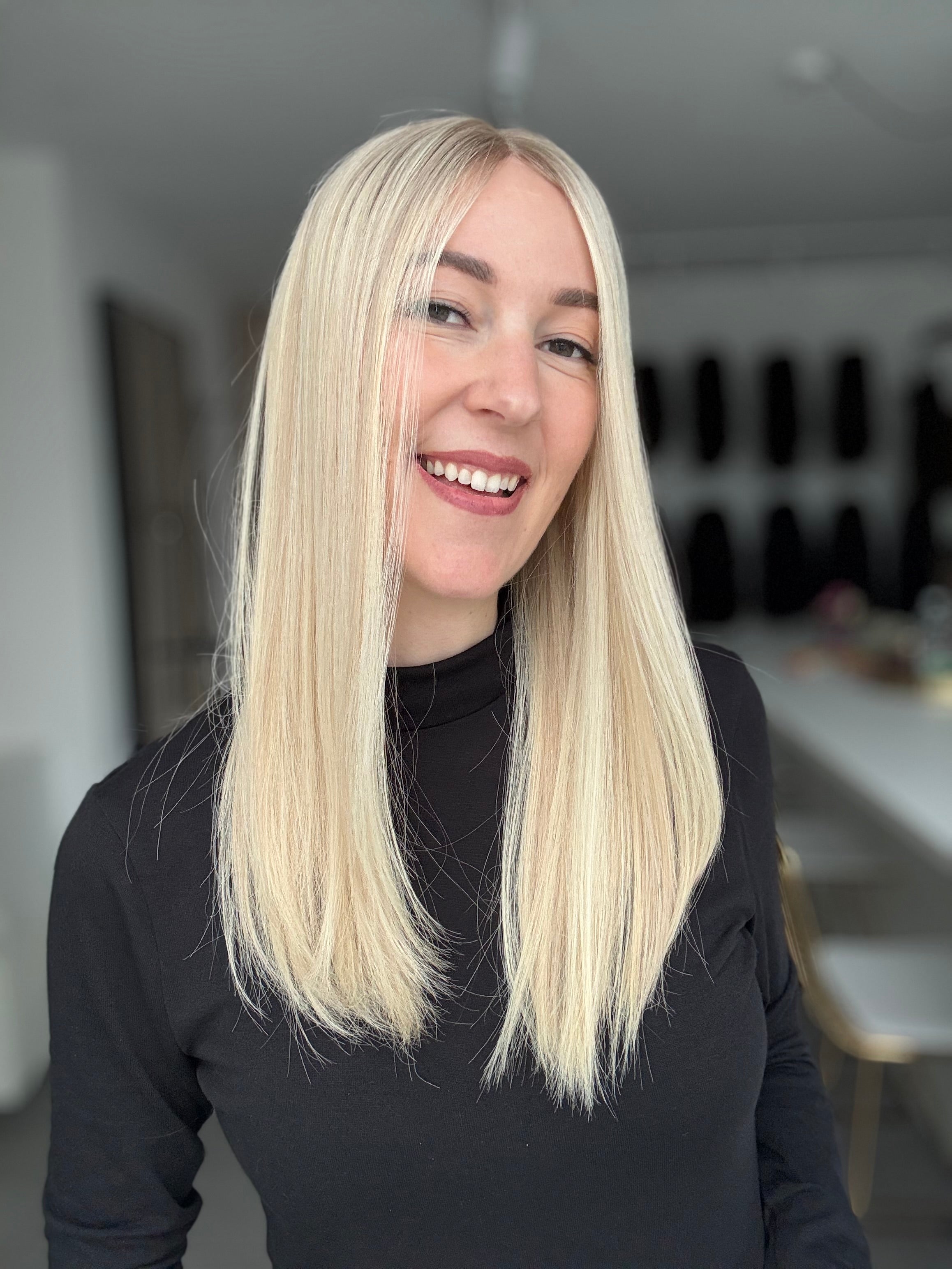 Abhängig von deinem Haarschnitt kann es sinnvoll sein, den Topper von deinem Friseur professionell anpassen zu lassen. So wird ein nahtloser und natürlicher Übergang gewährleistet, der das Gesamtbild harmonisch wirken lässt.