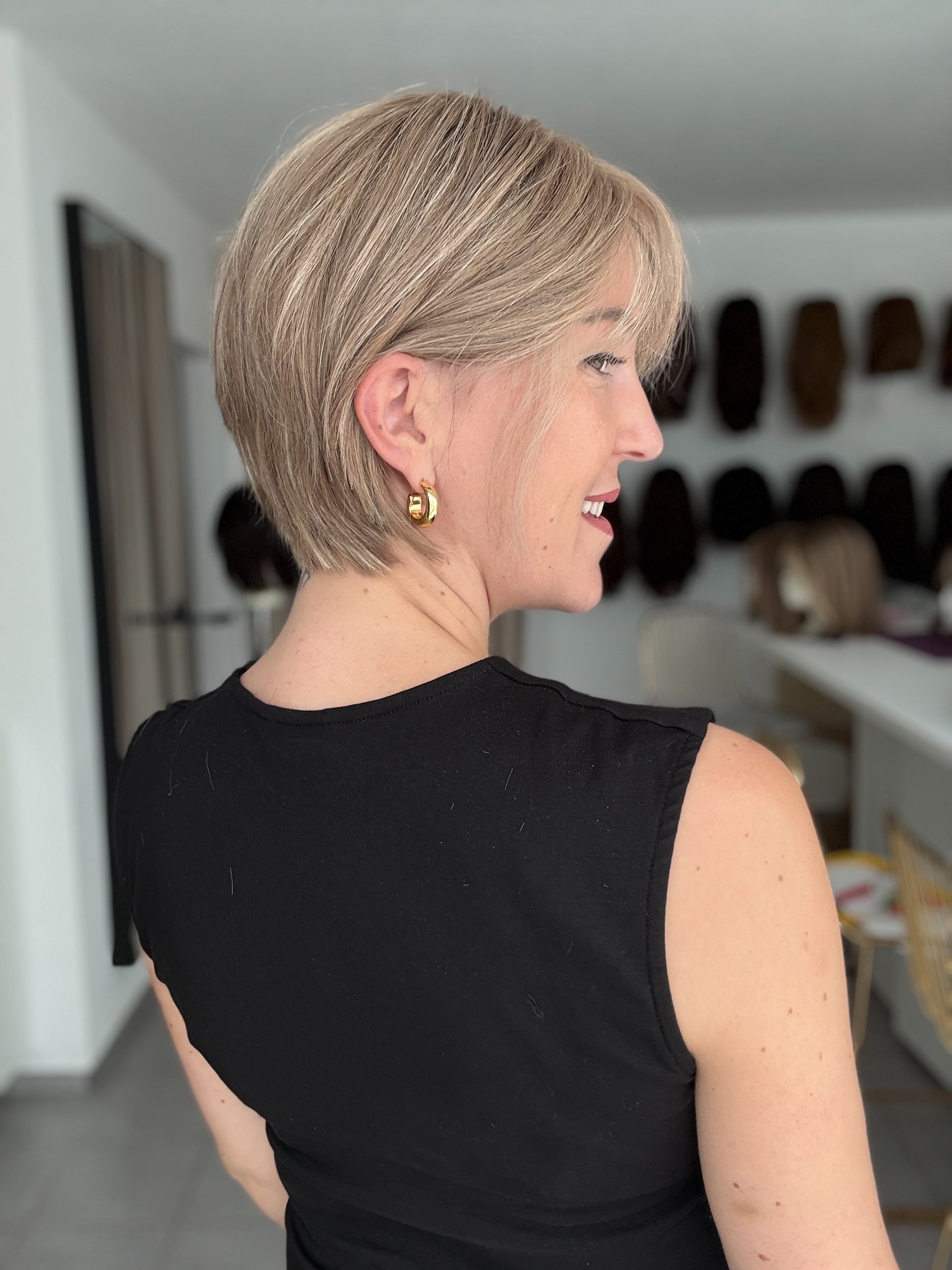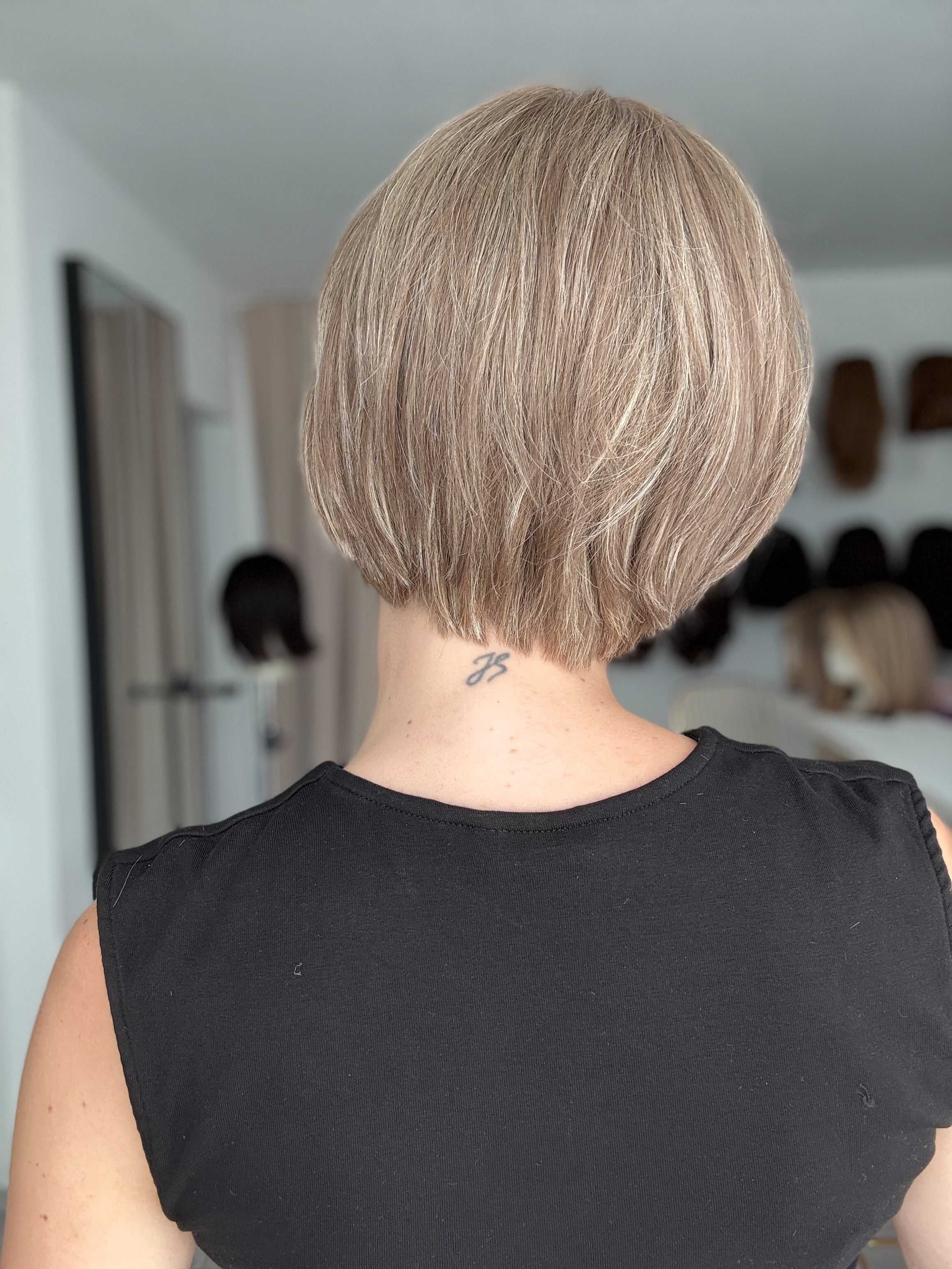 - Schnitt: angestufter kurzer Bob