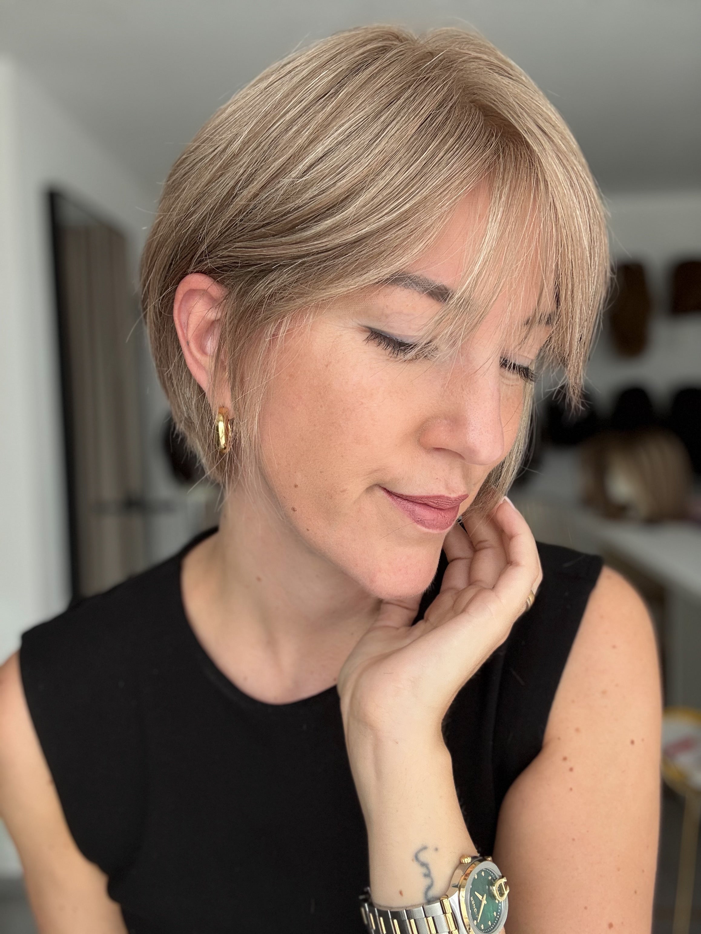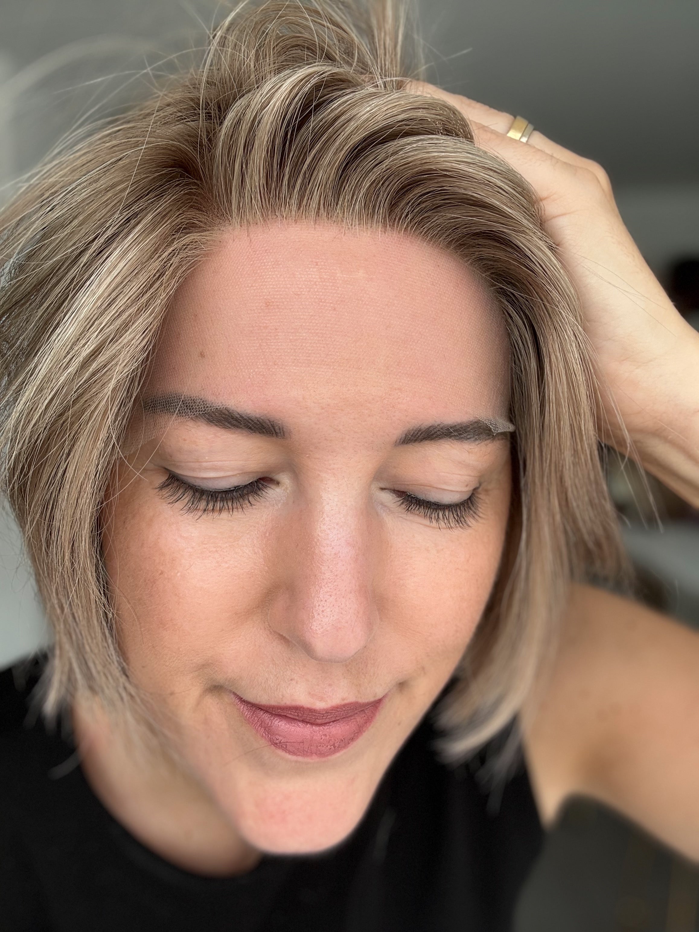 *die Knoten sind gebleicht, jedoch können diese nur bis zu einem gewissen Punkt blondiert werden ohne die Integrität der Perücke zu gefährden. Manche Knoten nehmen die Farbe besser an als andere, so dass einige Modelle auch nach dem Bleichen immer noch dunklere Knoten aufweisen können als andere. Knoten können ganz leicht mit Make-Up-Concealer, hellem Puder oder einem leichten Highlighter- oder Lidschattenpuder kaschiert werden.