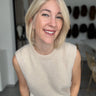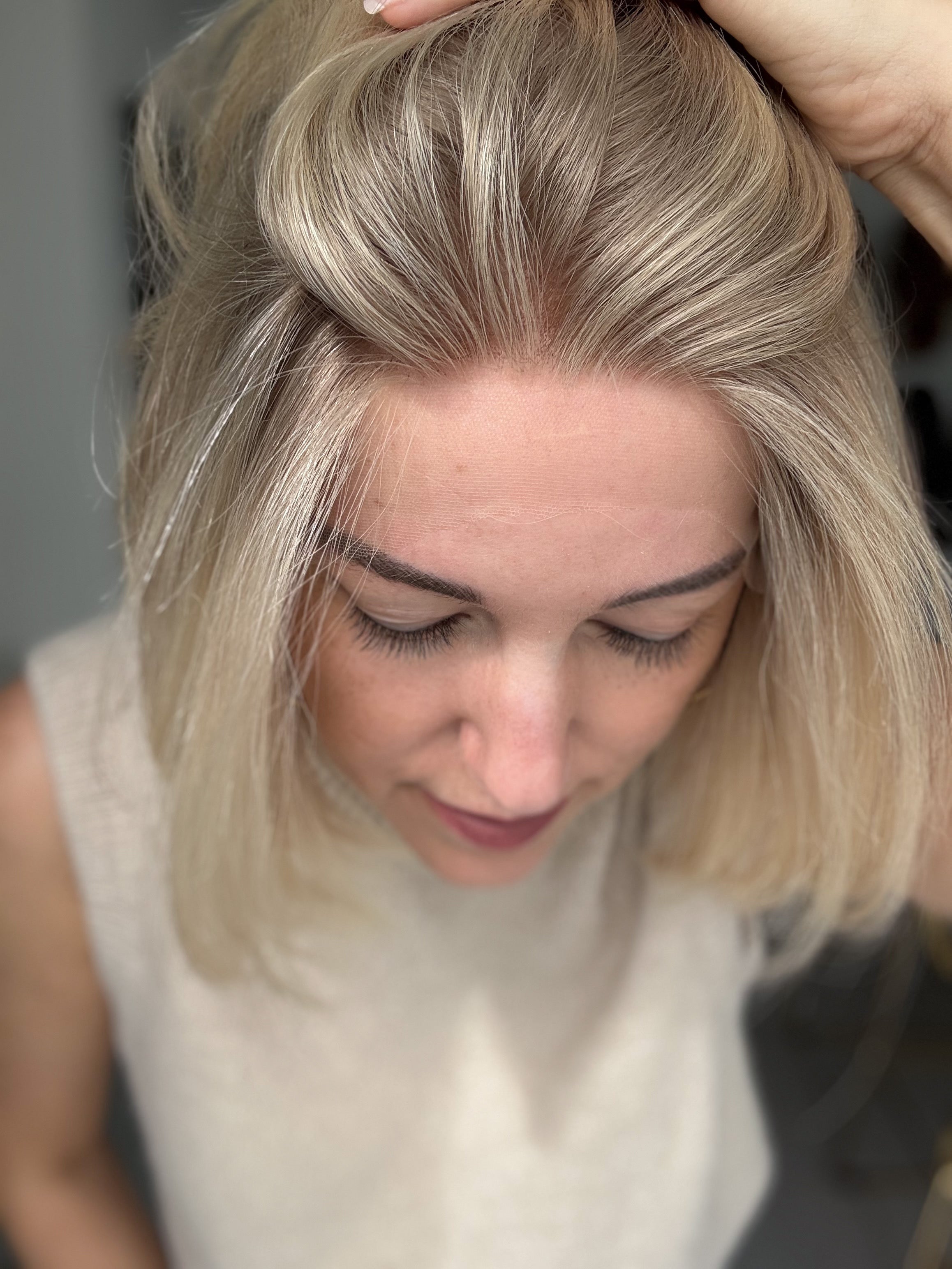 *die Knoten sind gebleicht, jedoch können diese nur bis zu einem gewissen Punkt blondiert werden ohne die Integrität der Perücke zu gefährden. Manche Knoten nehmen die Farbe besser an als andere, so dass einige Modelle auch nach dem Bleichen immer noch dunklere Knoten aufweisen können als andere. Knoten können ganz leicht mit Make-Up-Concealer, hellem Puder oder einem leichten Highlighter- oder Lidschattenpuder kaschiert werden.