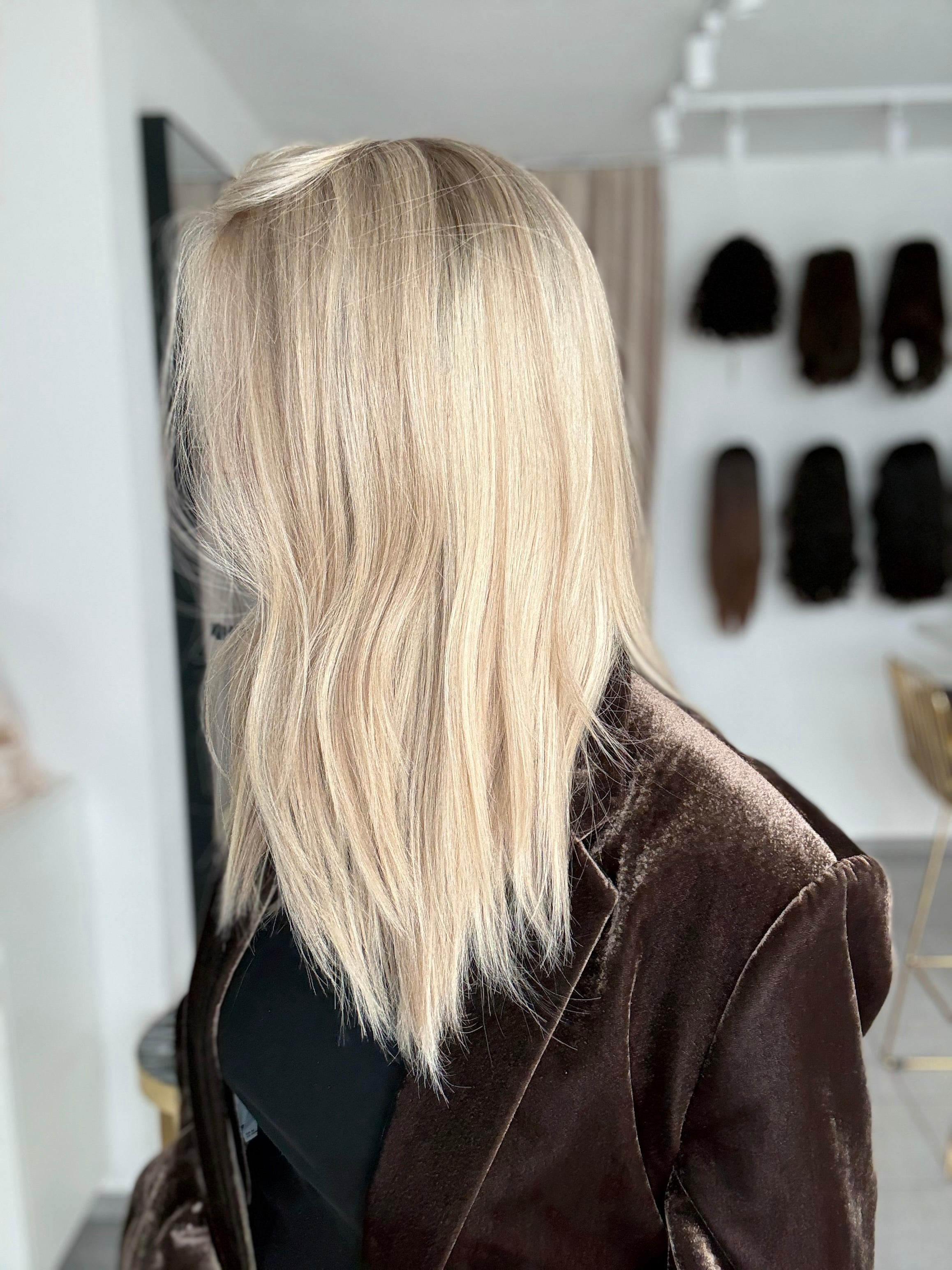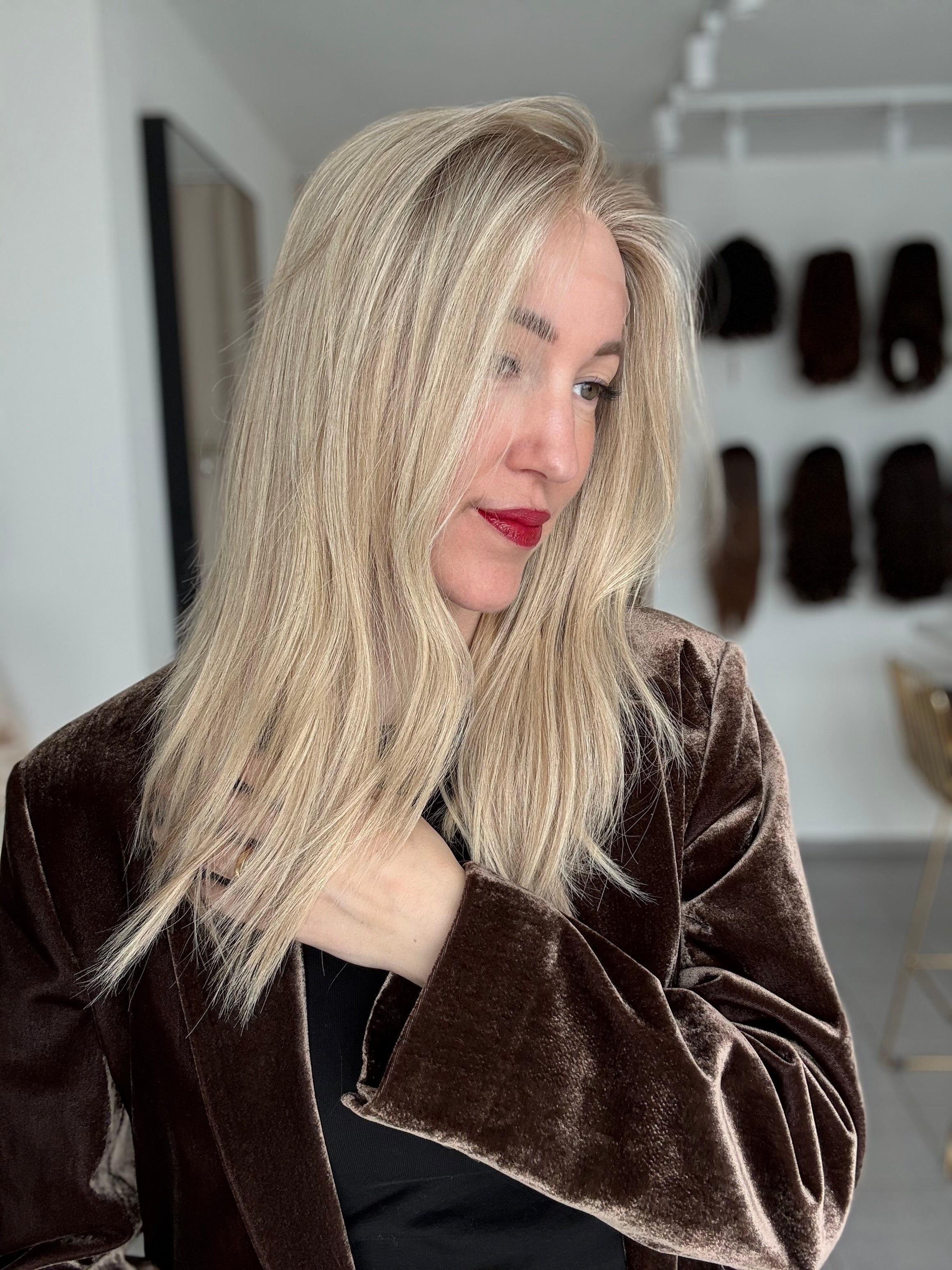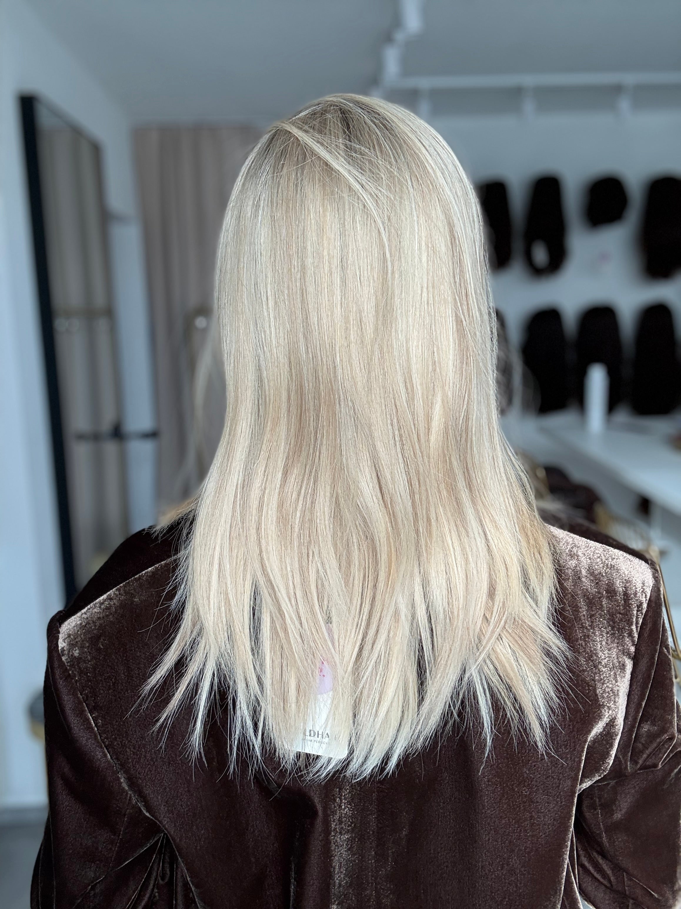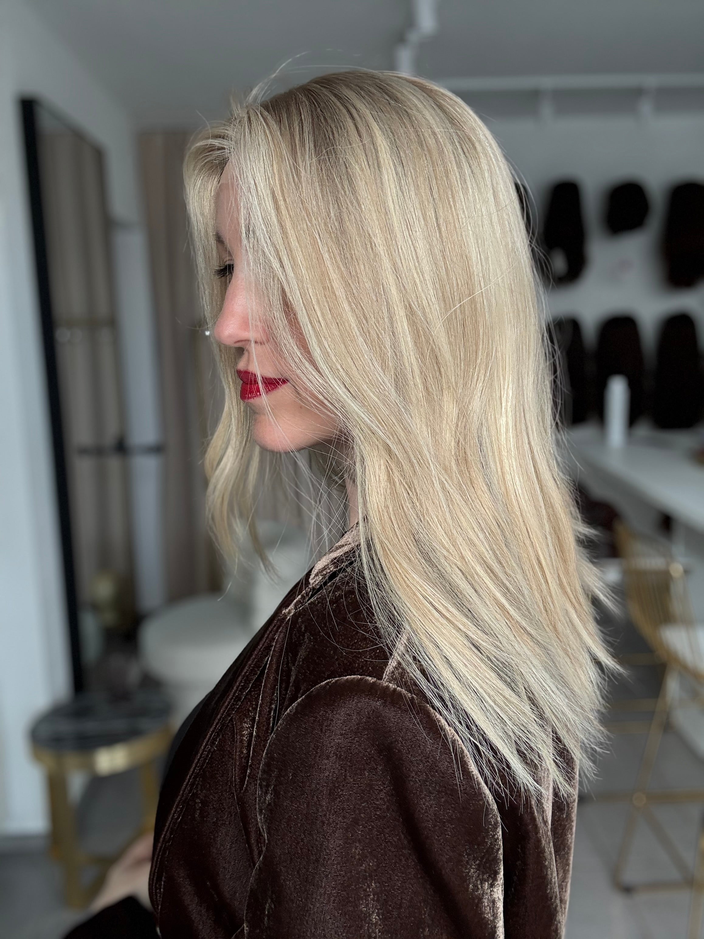 - Farbe: Schwedenblond mit leichtem Shadowrooting und feinen Highlights