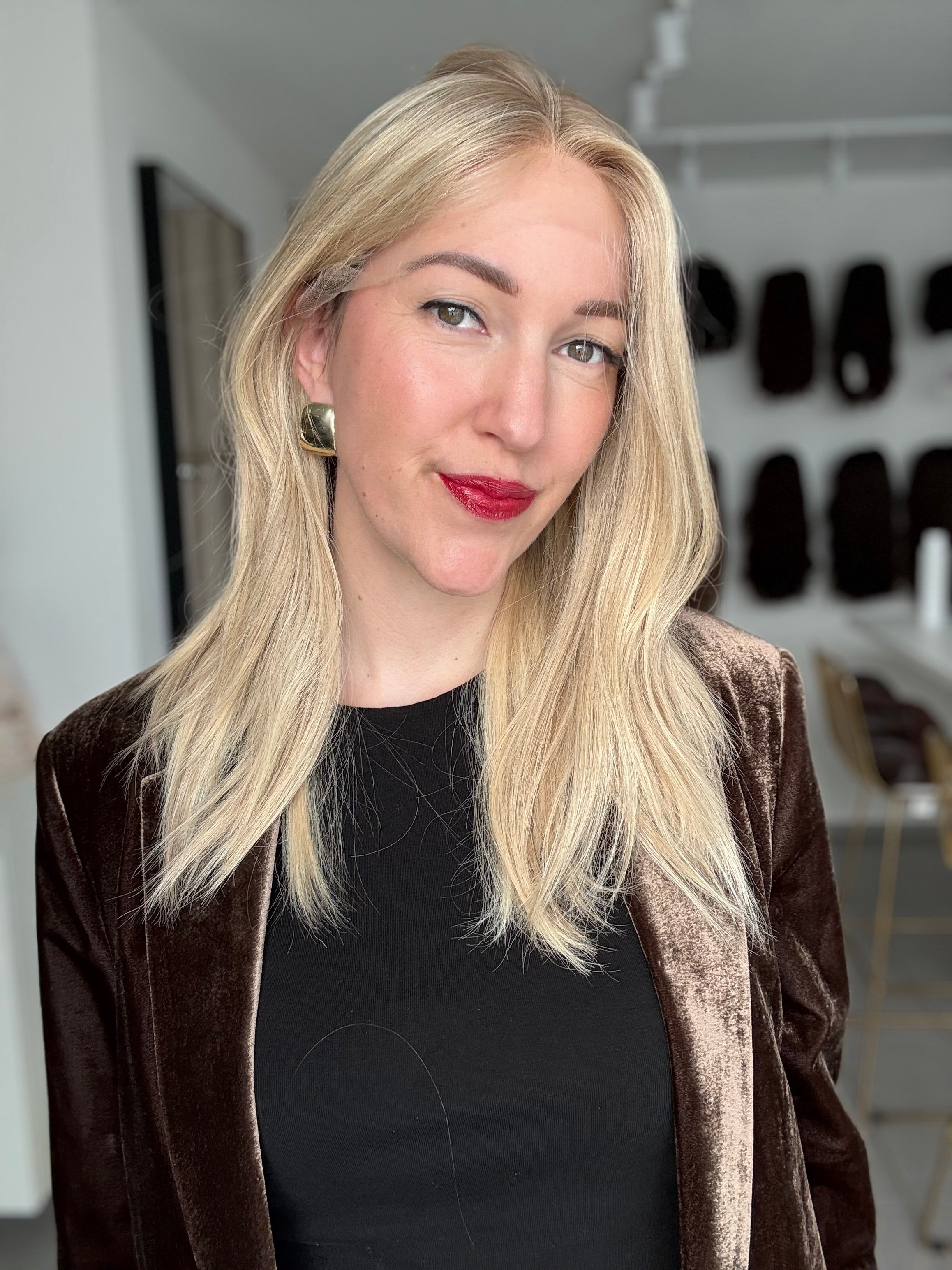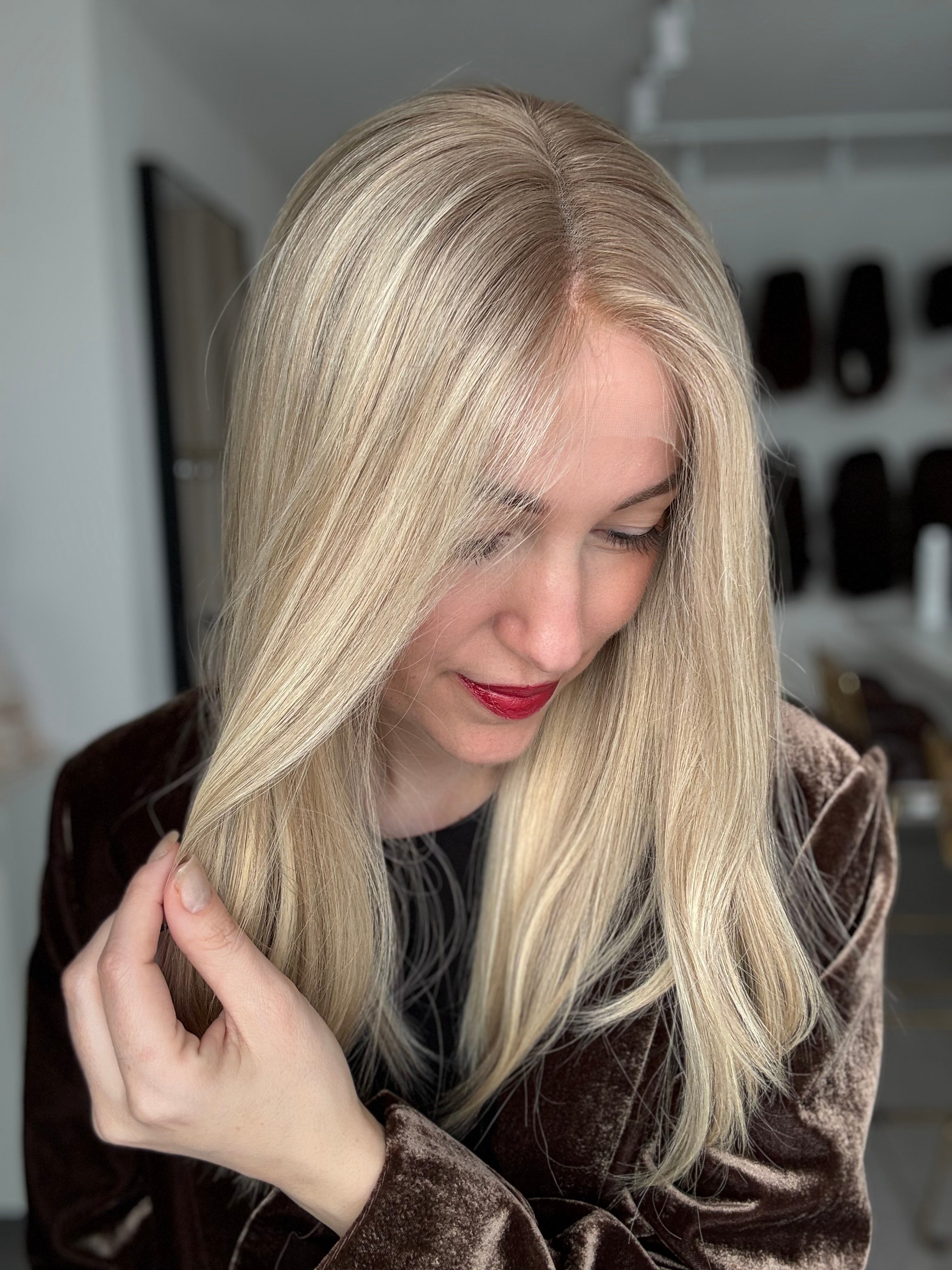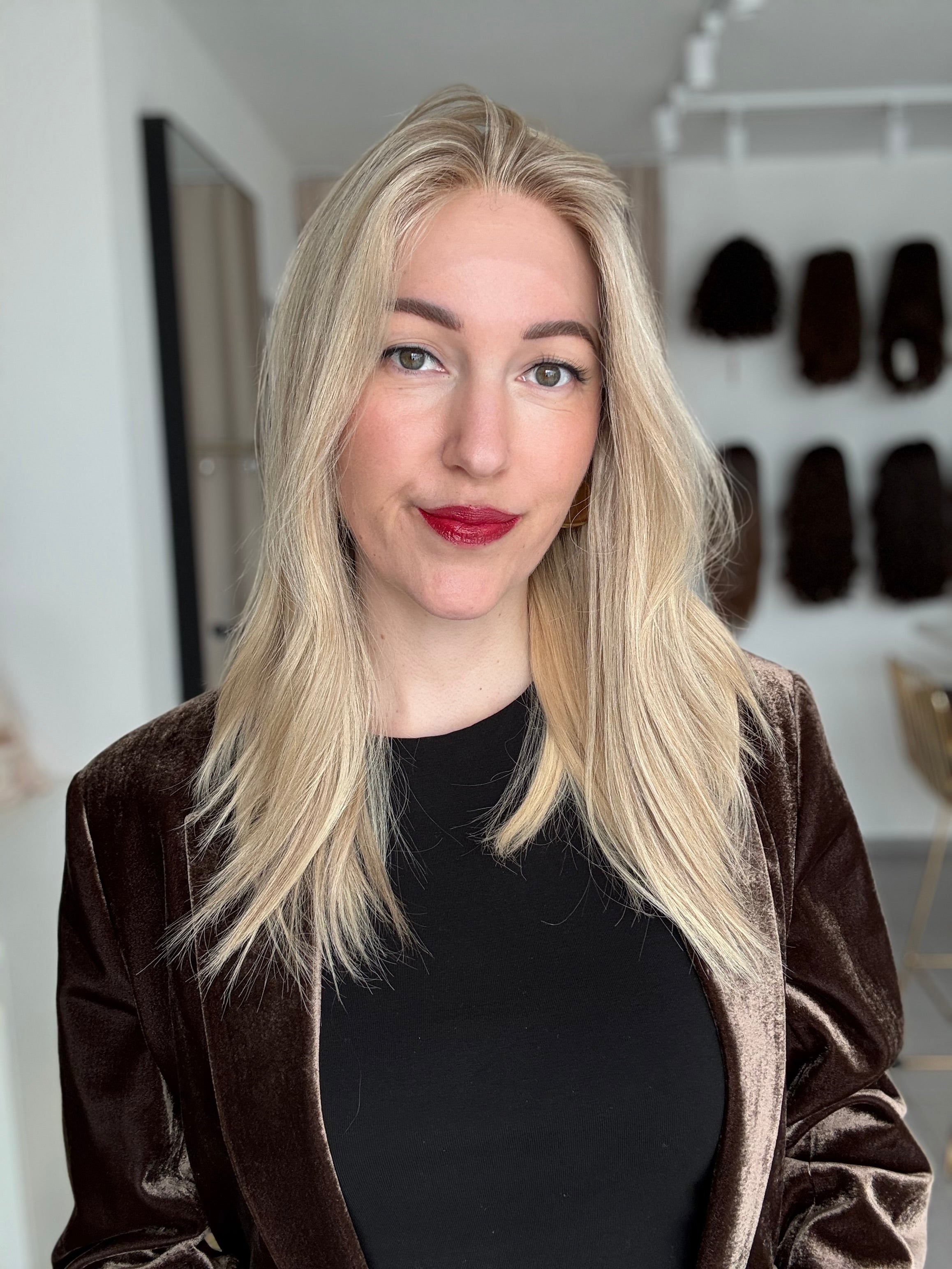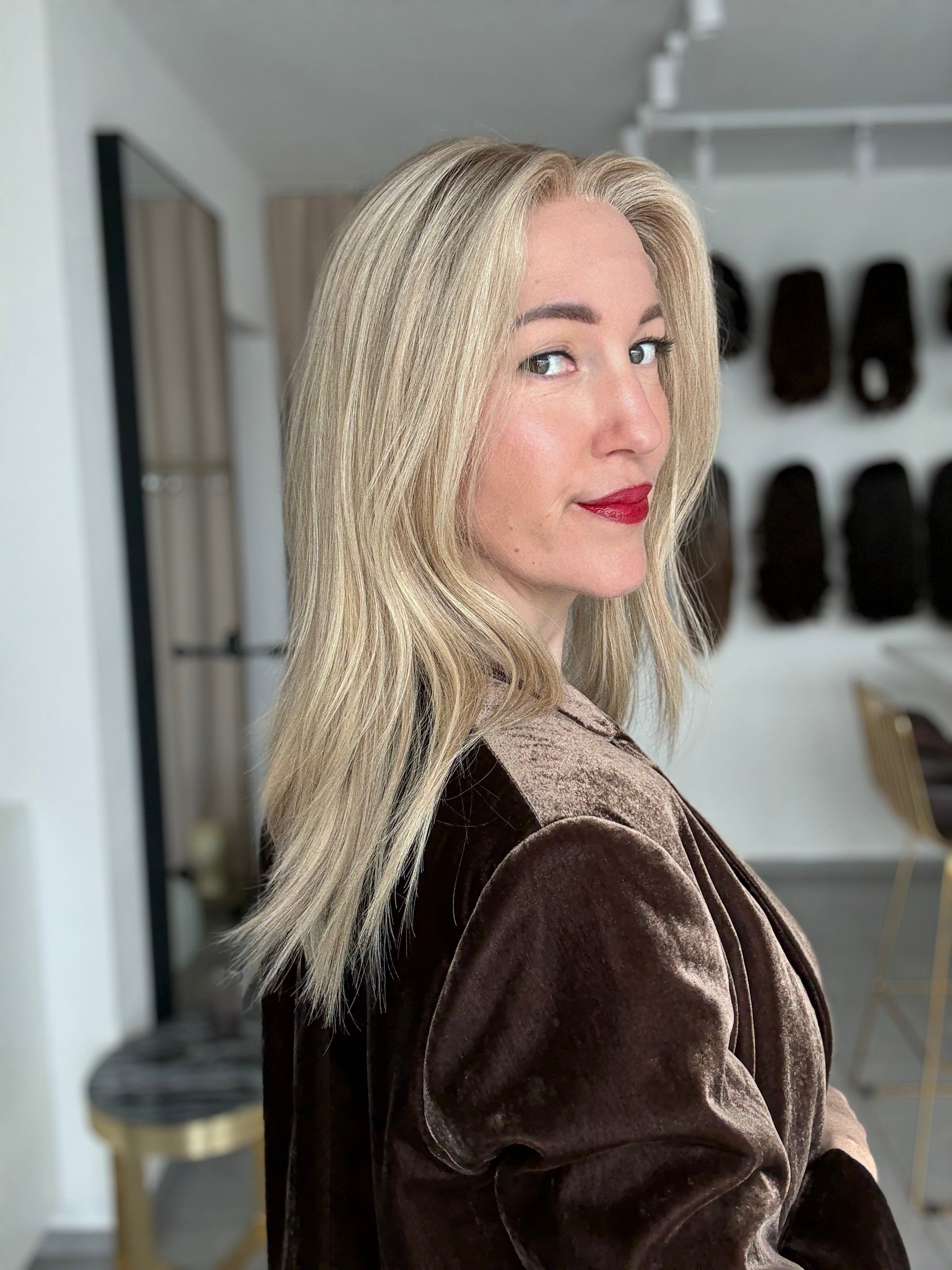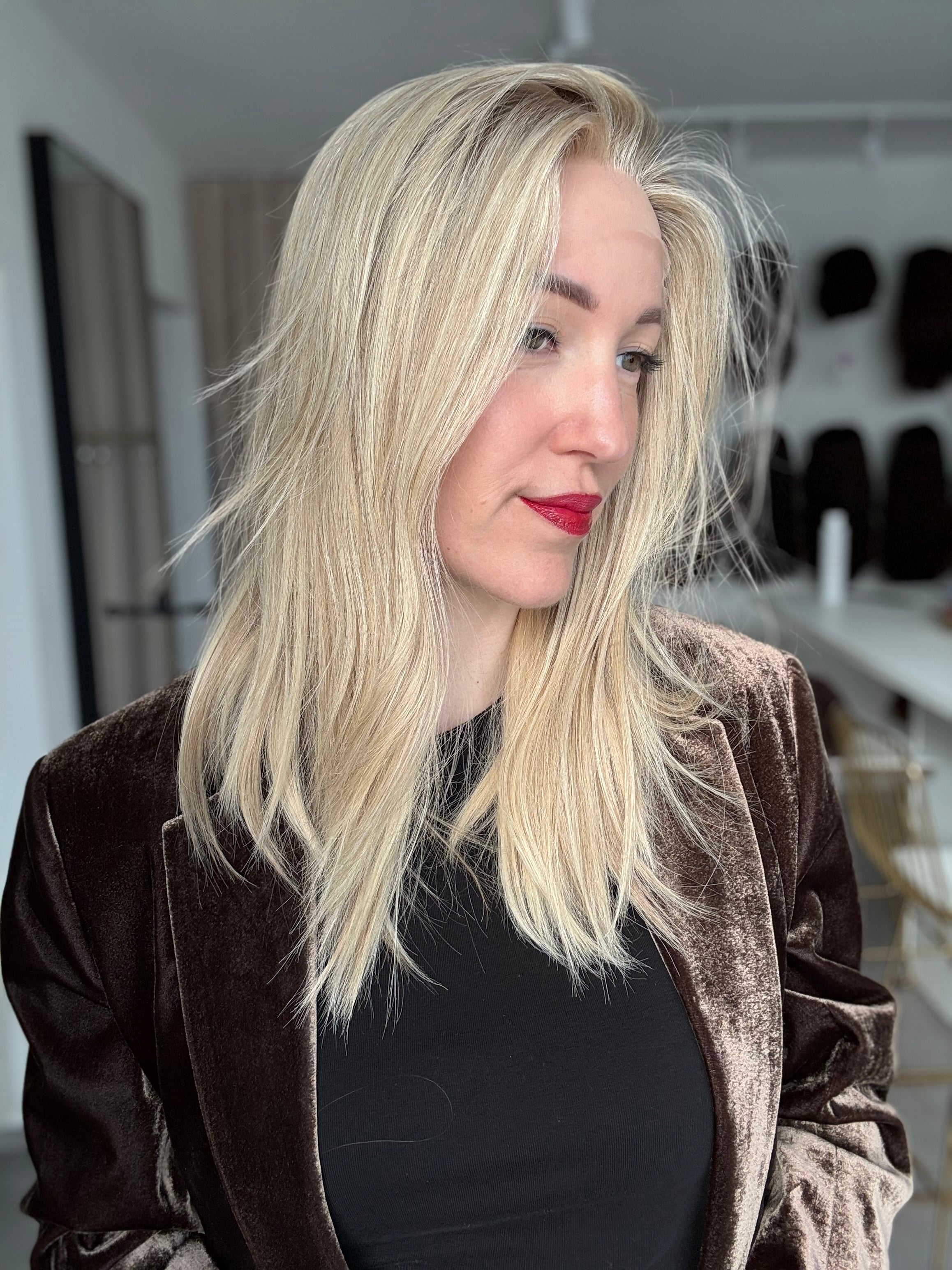- Farbe: Schwedenblond mit leichtem Shadowrooting und feinen Highlights