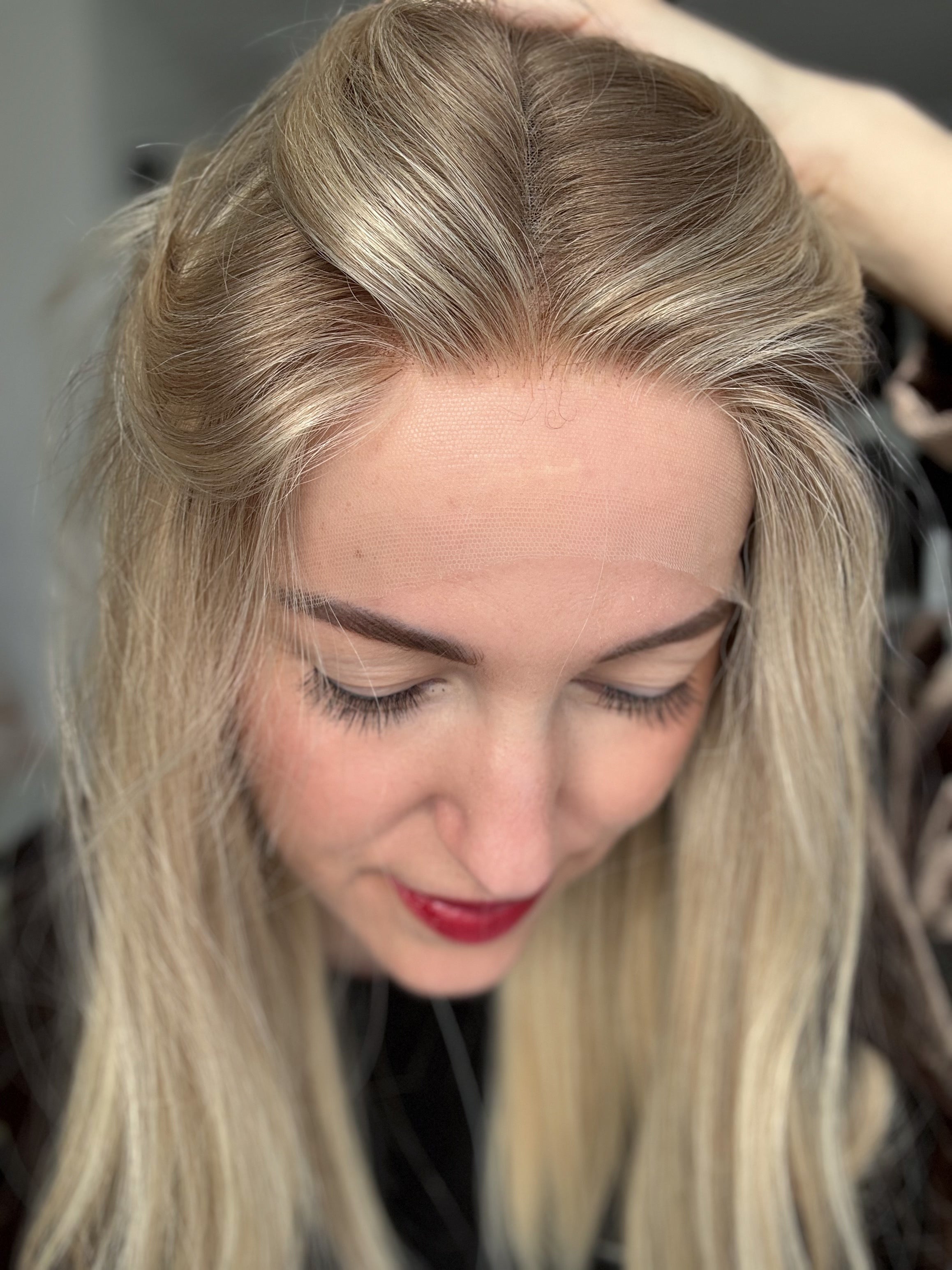 *die Knoten sind gebleicht, jedoch können diese nur bis zu einem gewissen Punkt blondiert werden ohne die Integrität der Perücke zu gefährden. Manche Knoten nehmen die Farbe besser an als andere, so dass einige Modelle auch nach dem Bleichen immer noch dunklere Knoten aufweisen können als andere. Knoten können ganz leicht mit hellem Puder oder einem leichten Highlighter- oder Lidschattenpuder kaschiert werden.