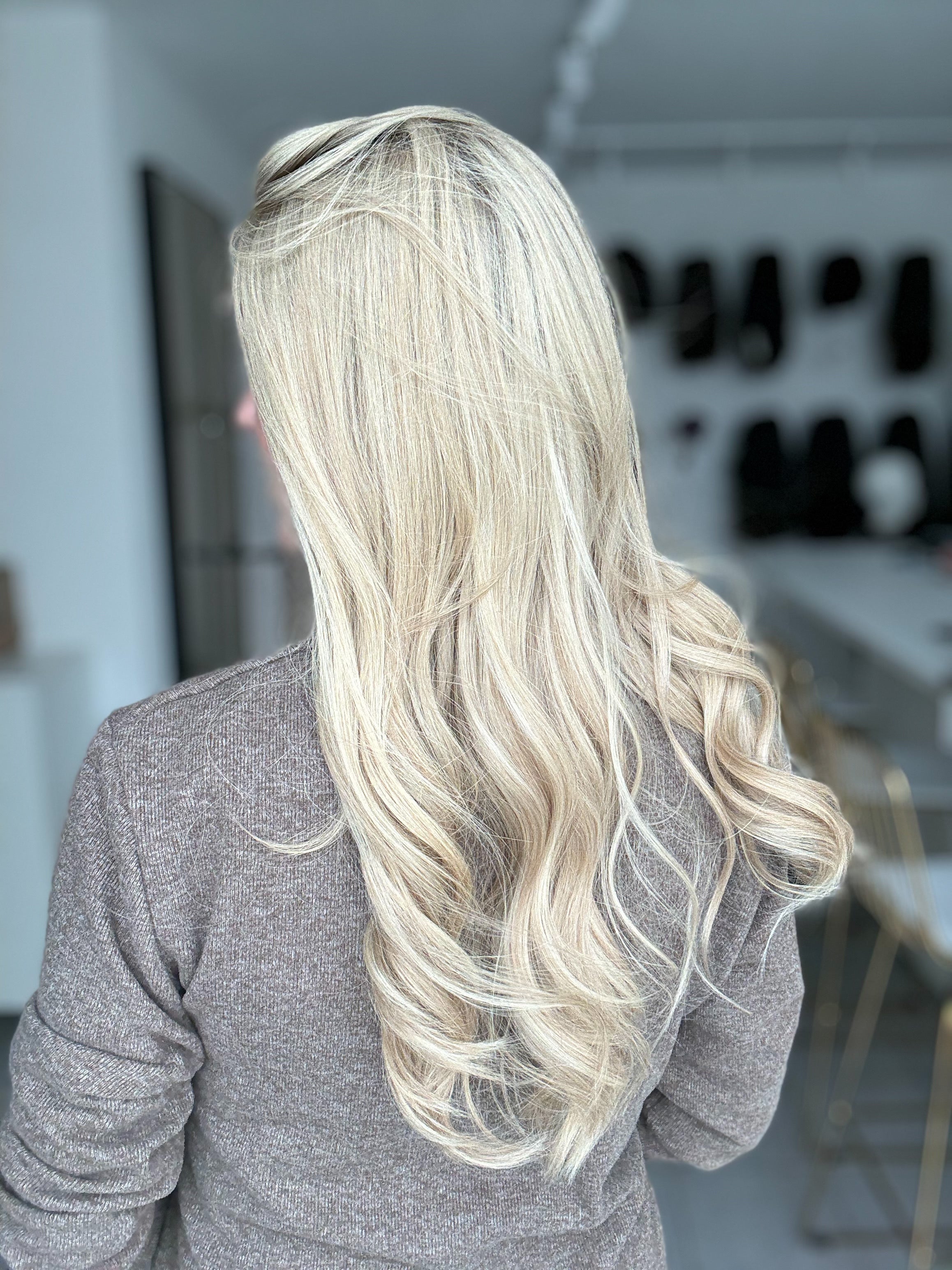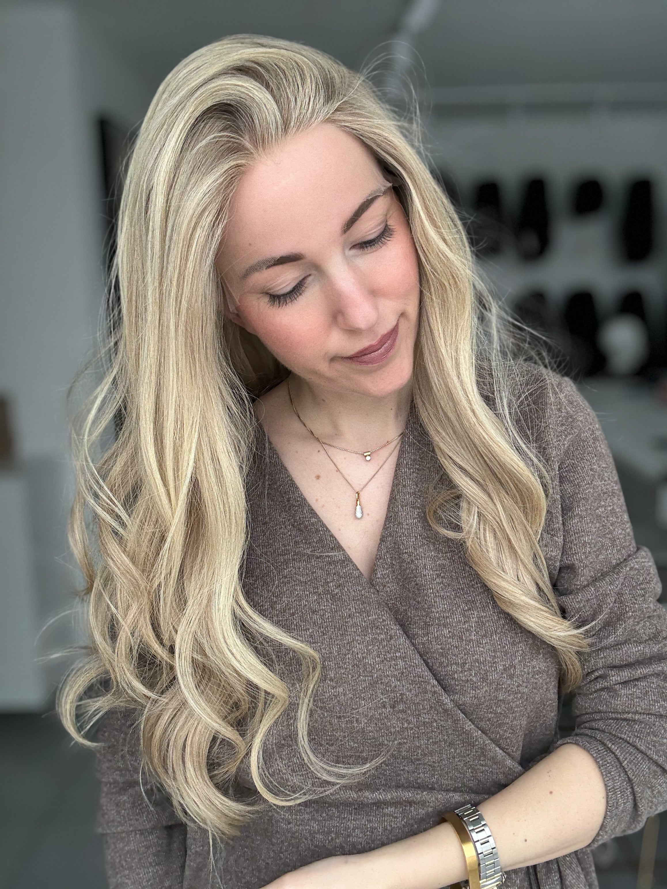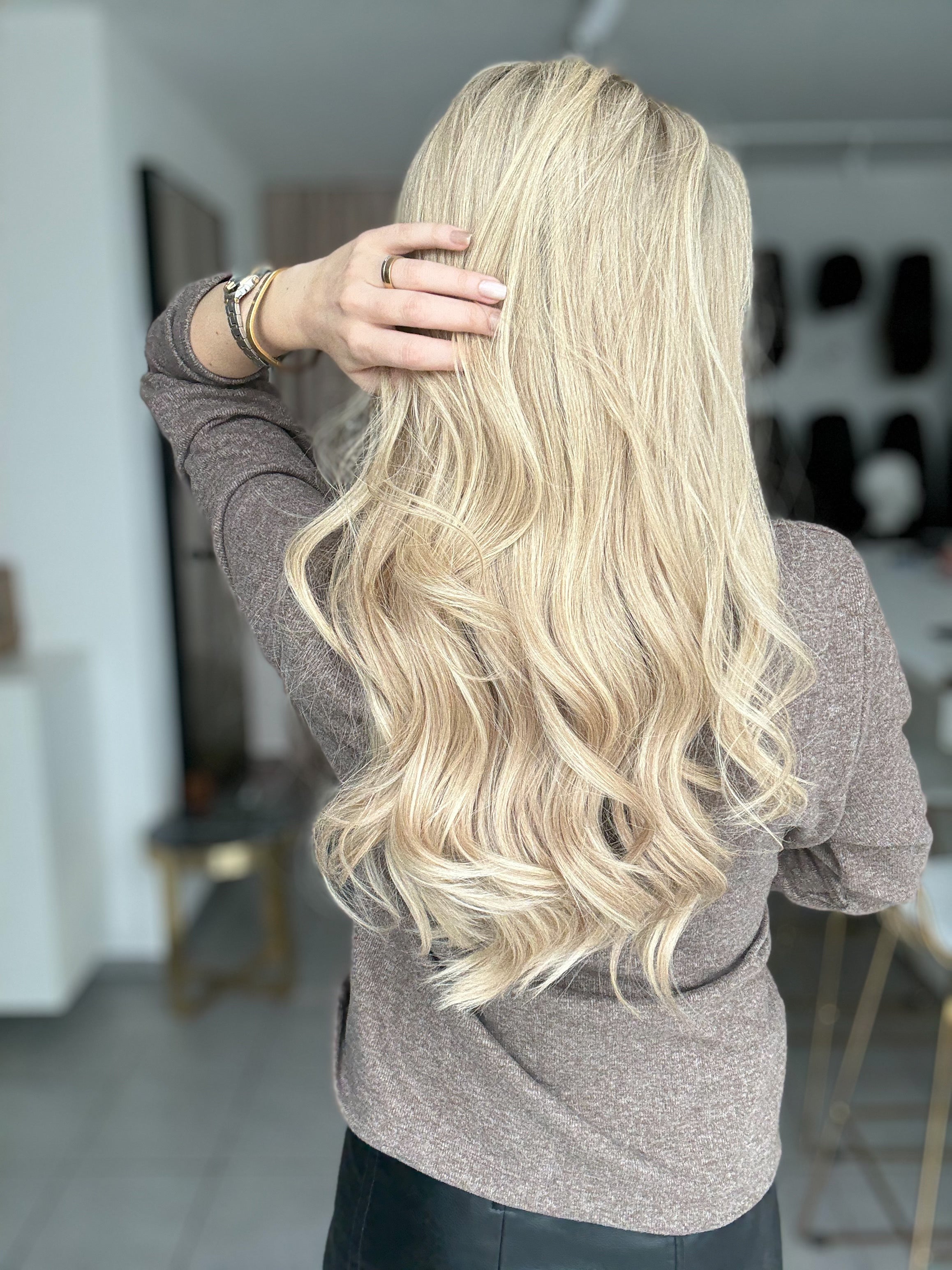 - Farbe: Schwedenblond mit leichtem Shadowrooting und feinen Highlights