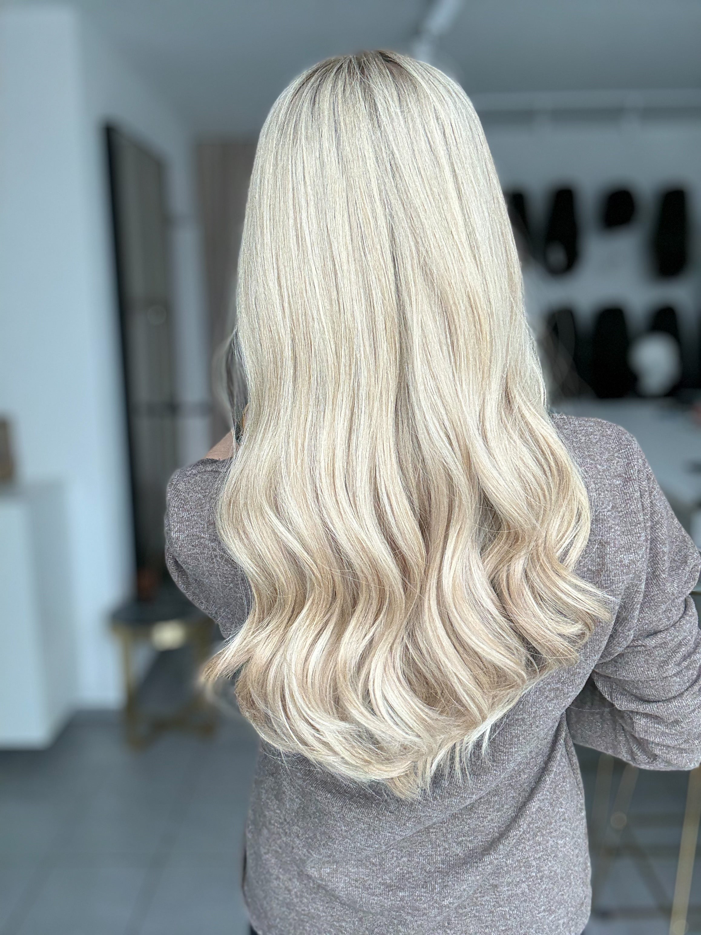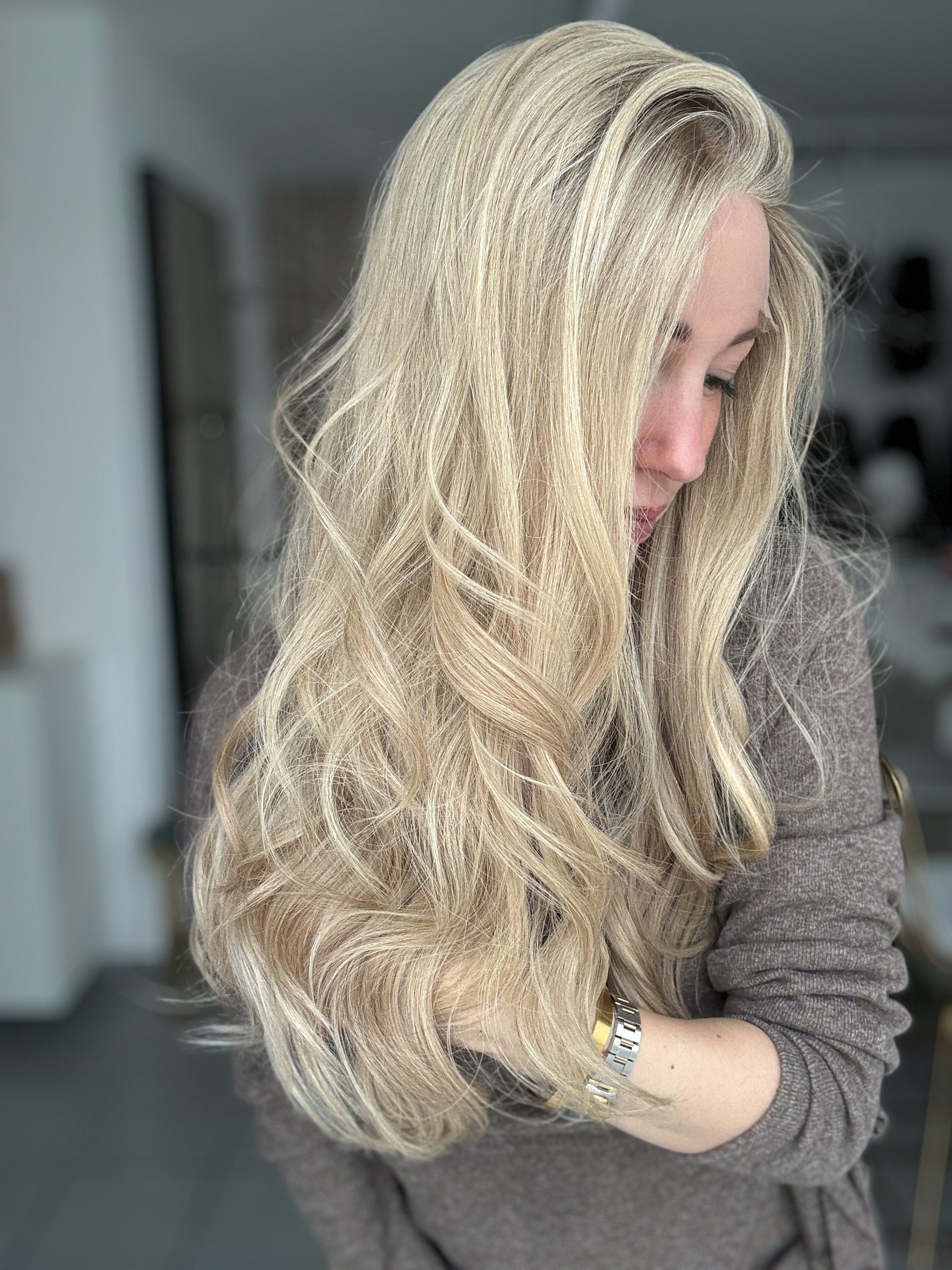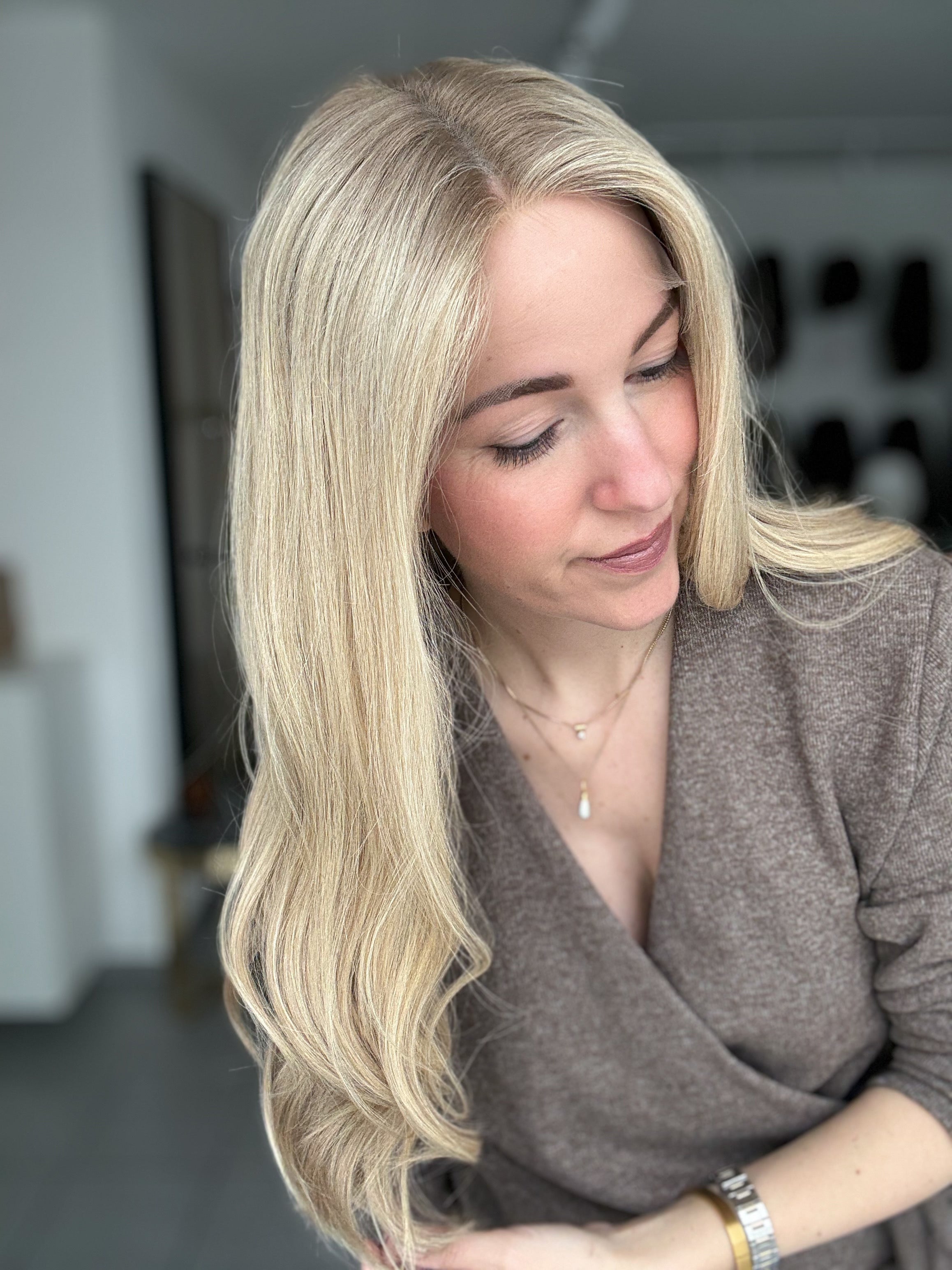 - Farbe: Schwedenblond mit leichtem Shadowrooting und feinen Highlights