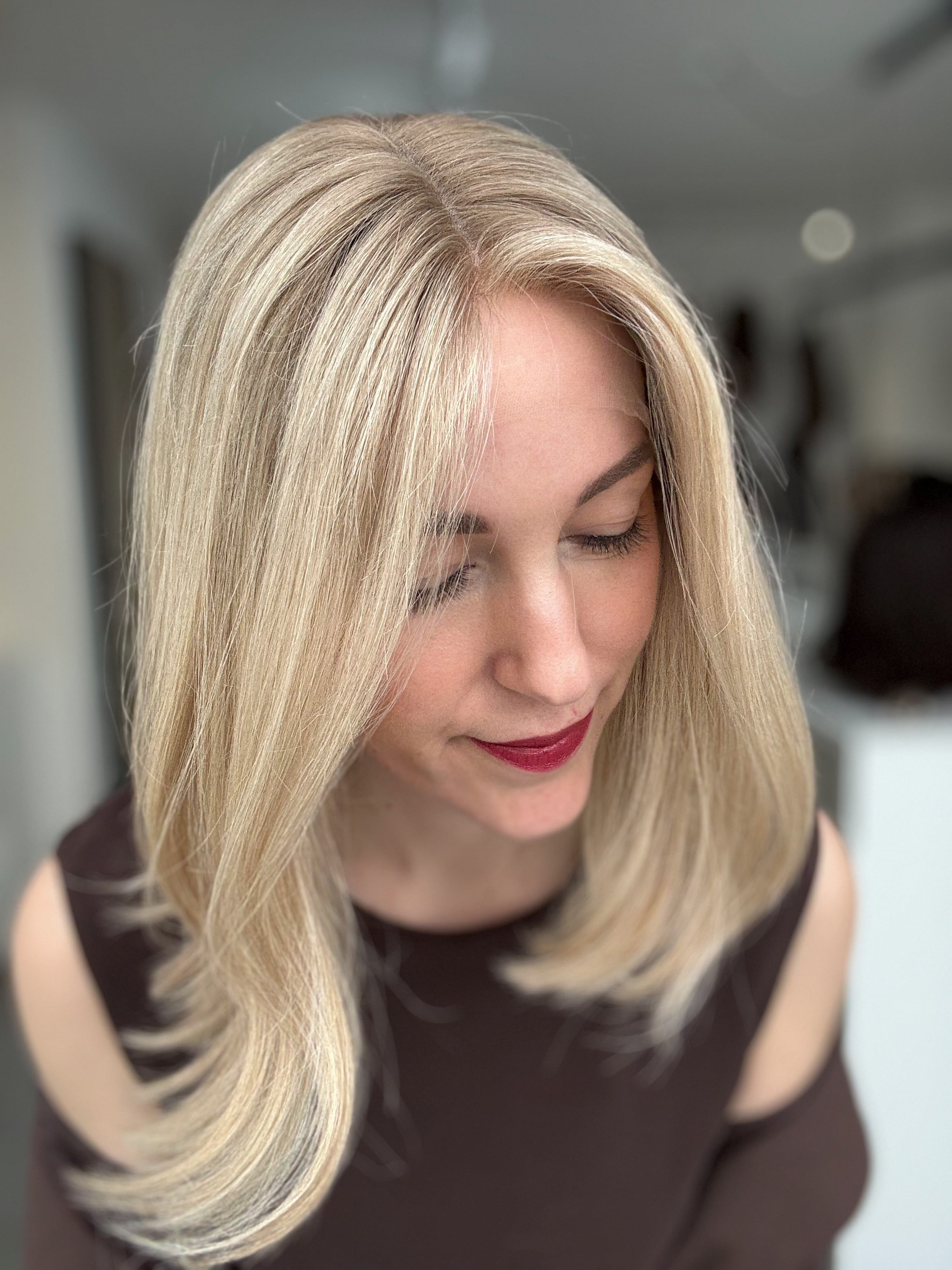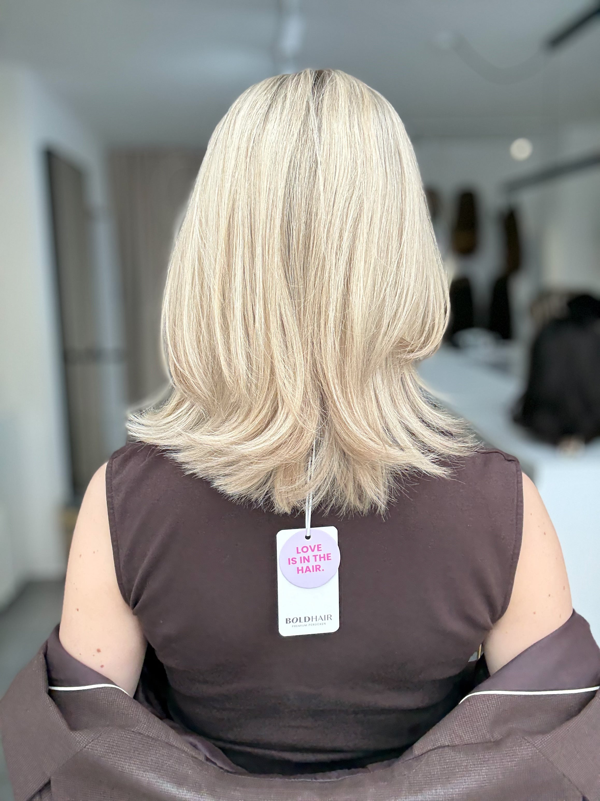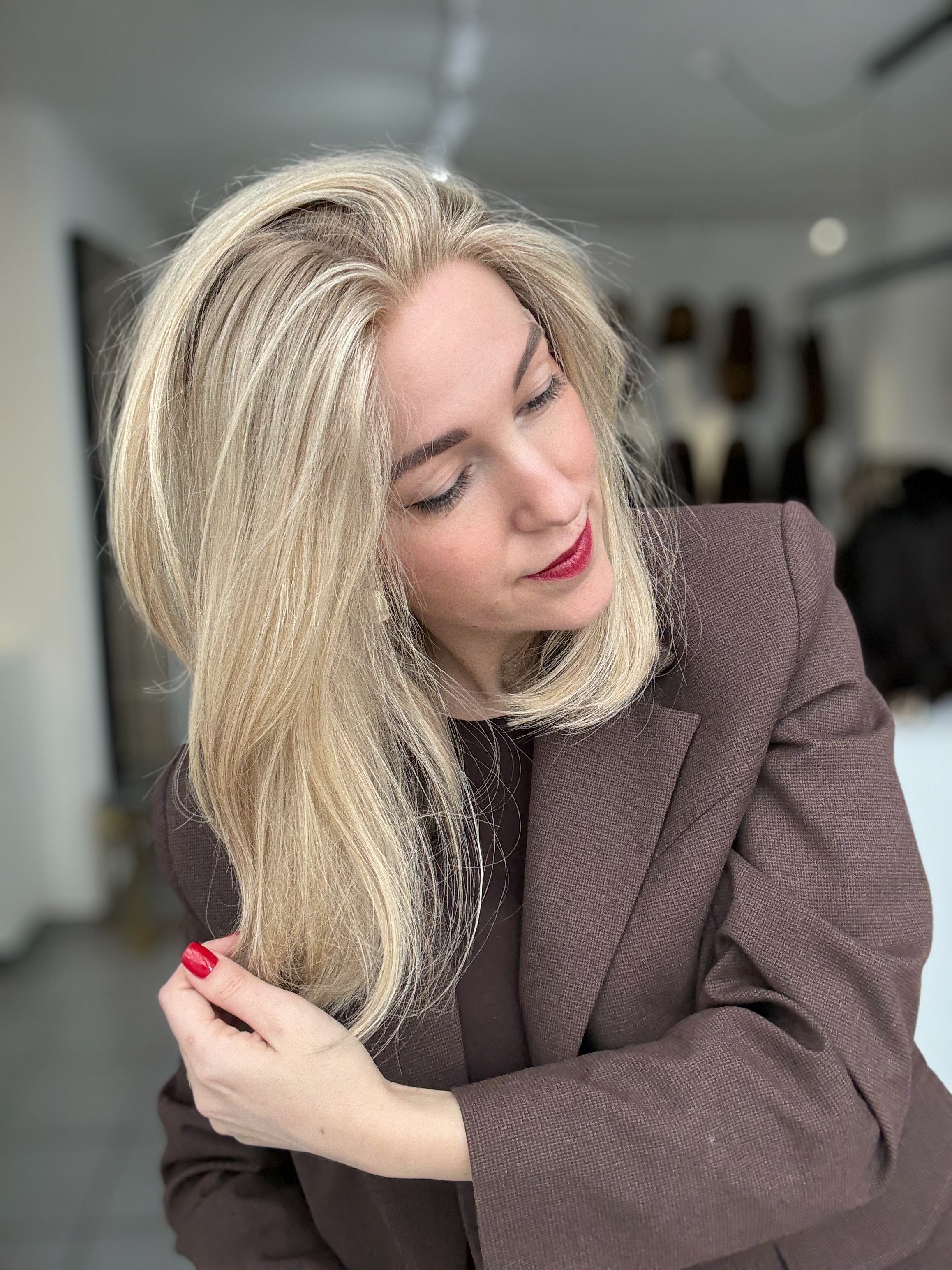 - Farbe: Schwedenblond mit leichtem Shadowrooting und feinen Highlights