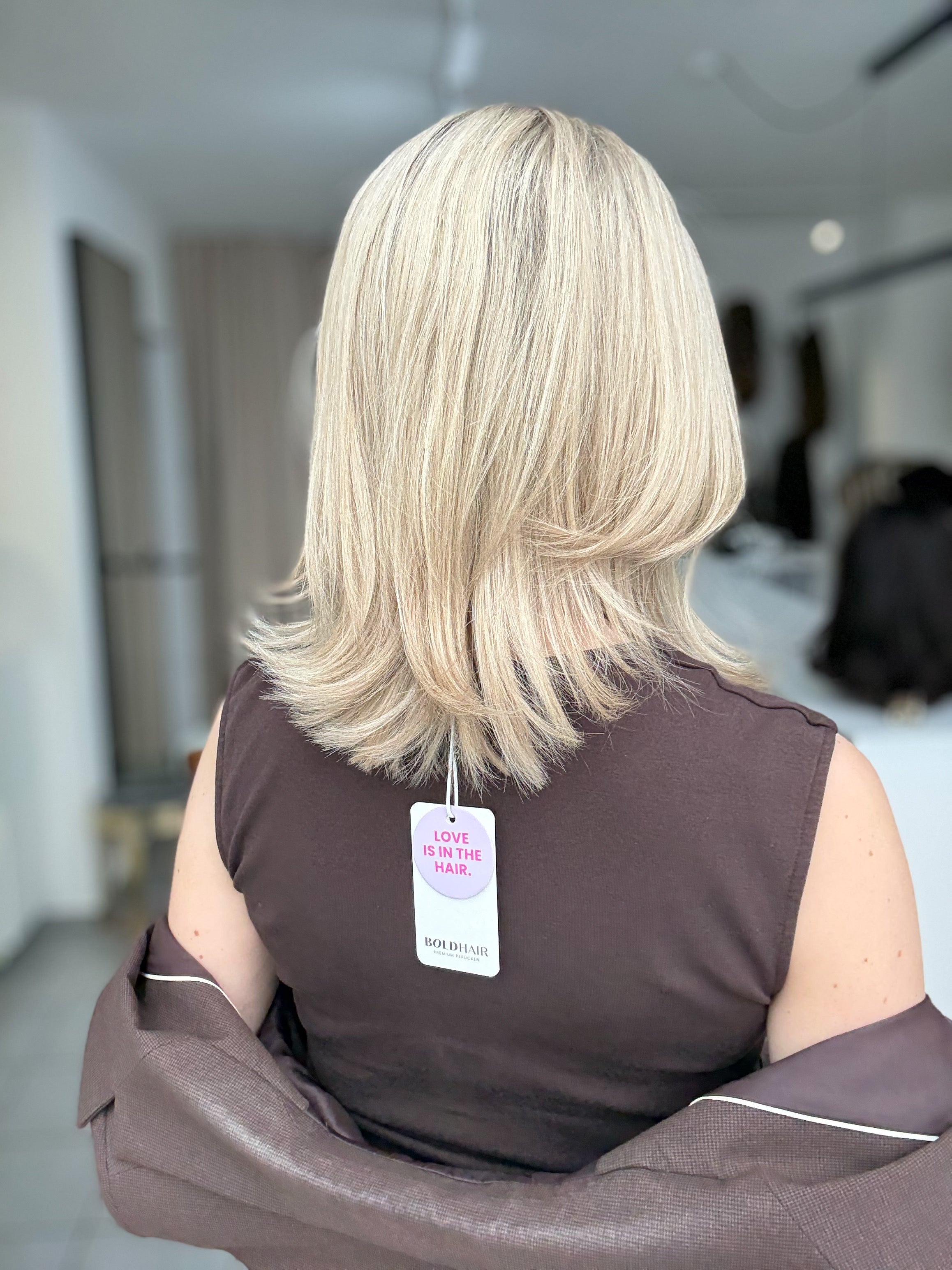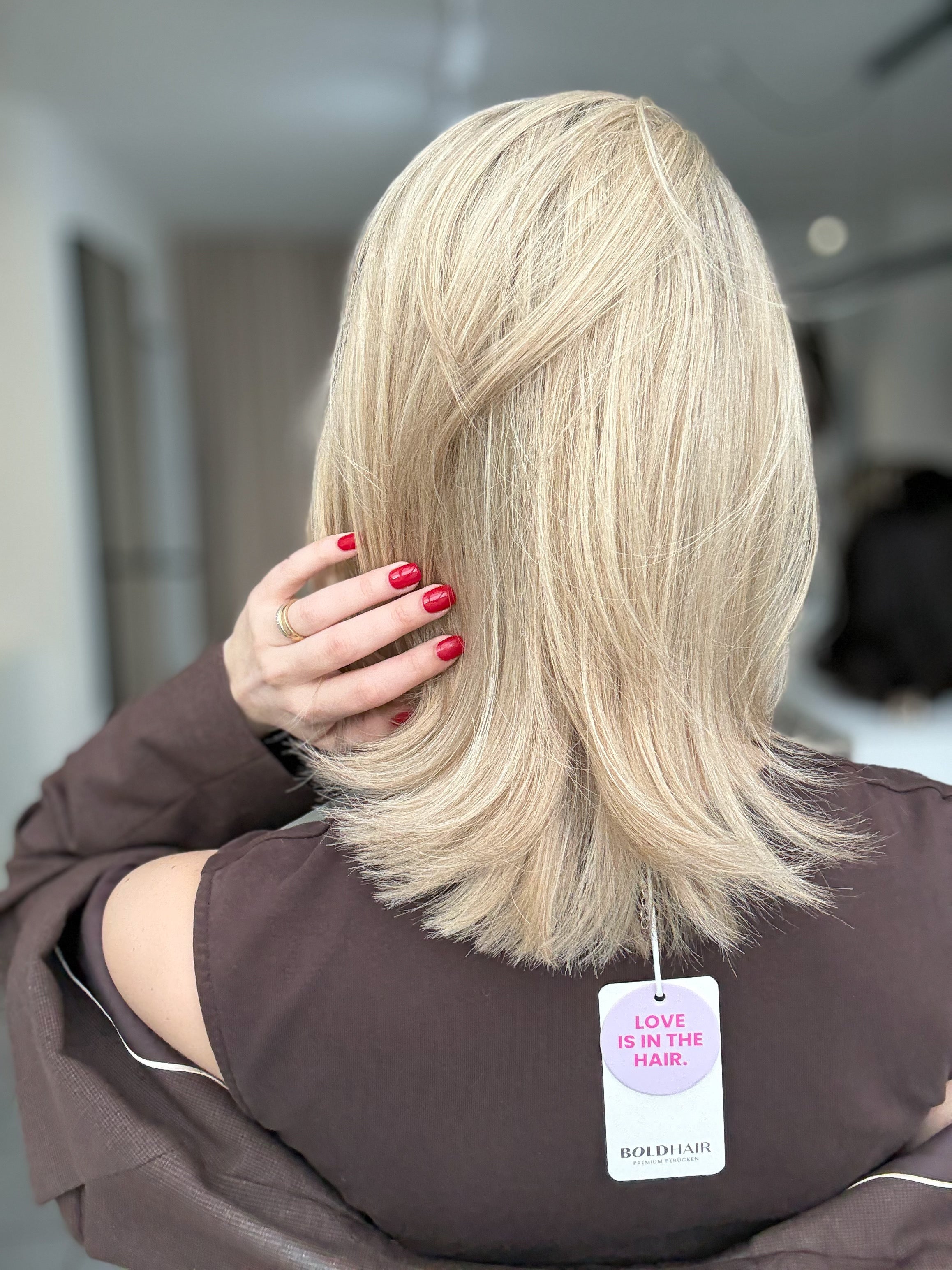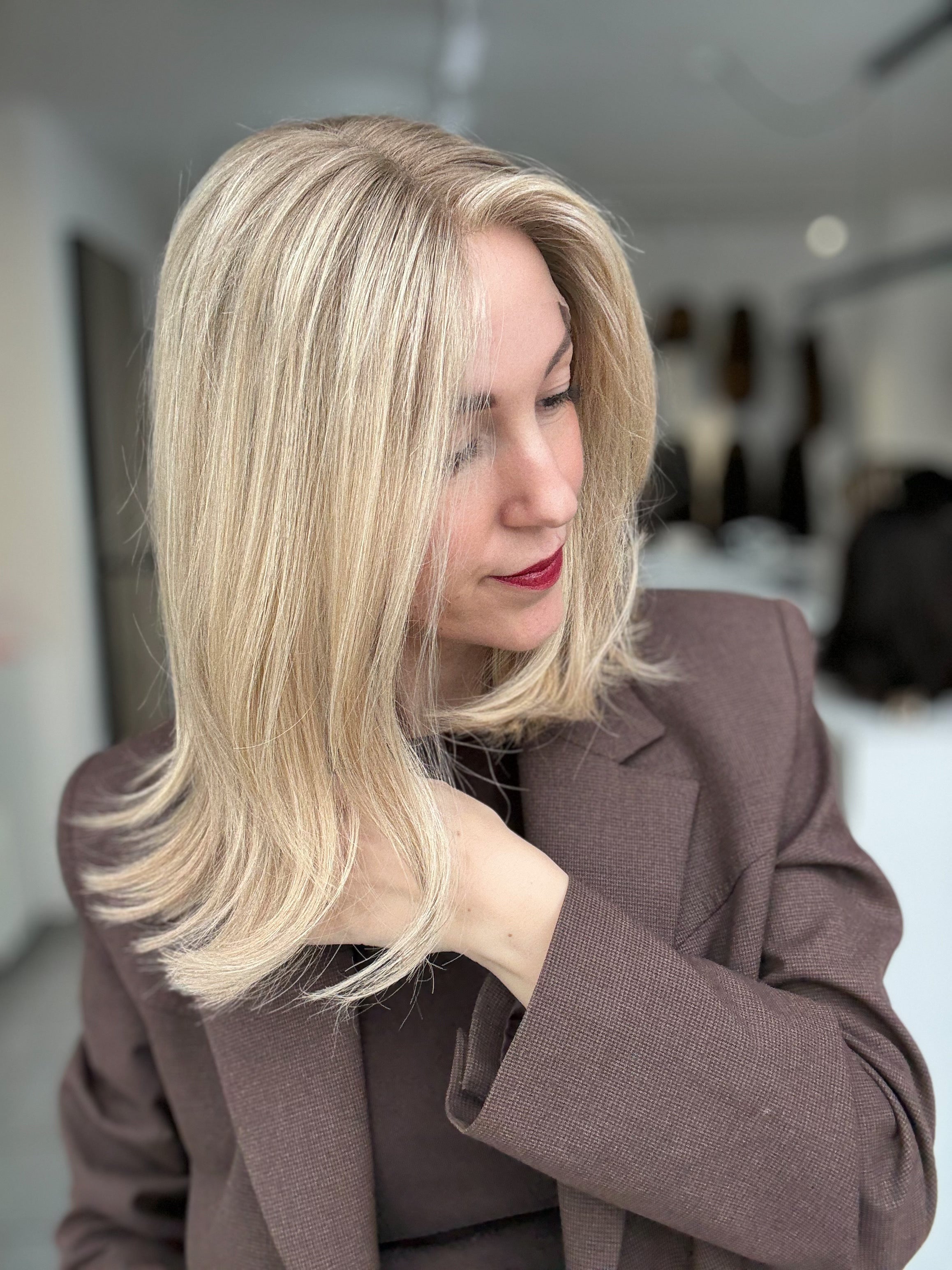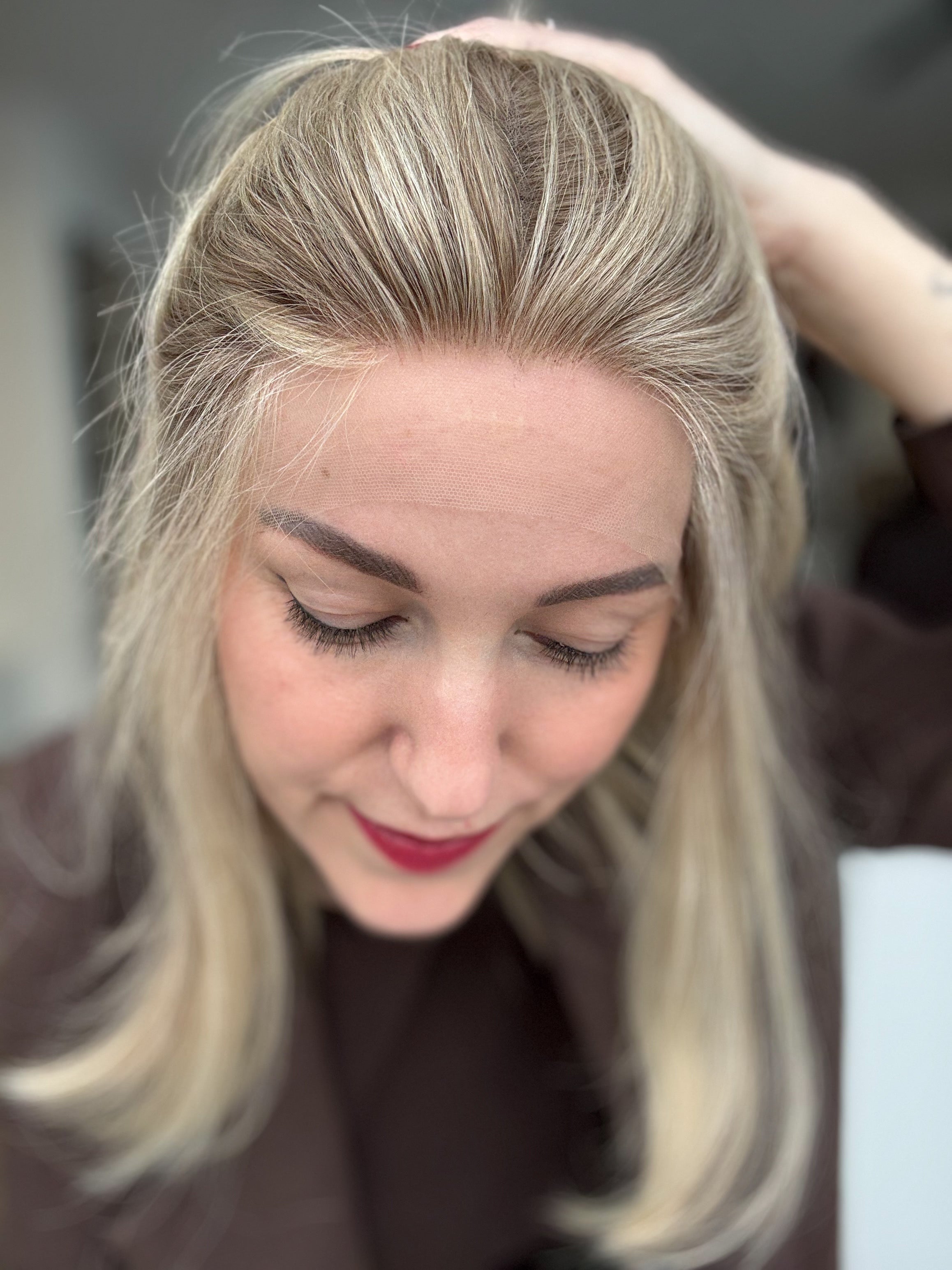 - Farbe: Schwedenblond mit leichtem Shadowrooting und feinen Highlights