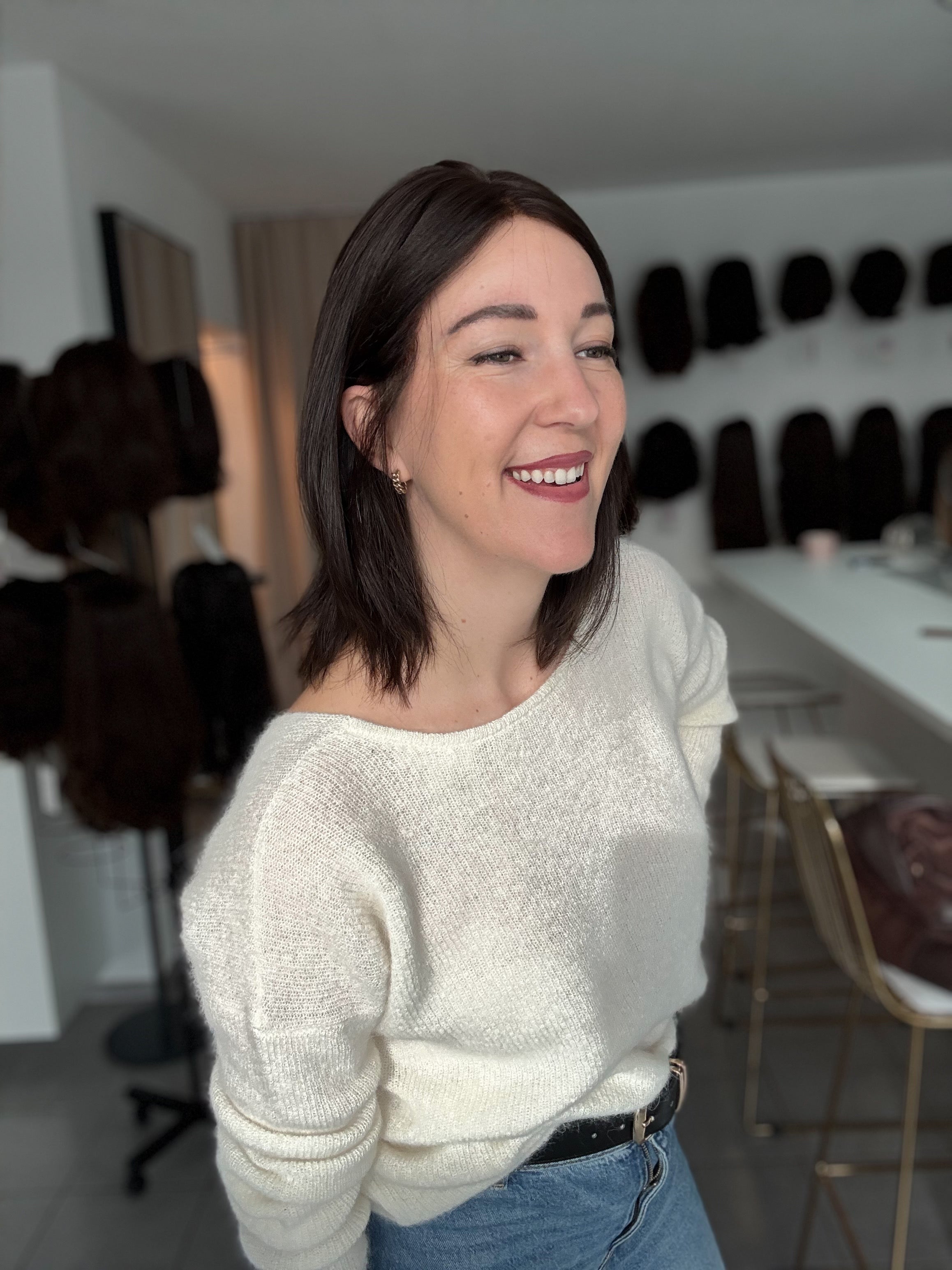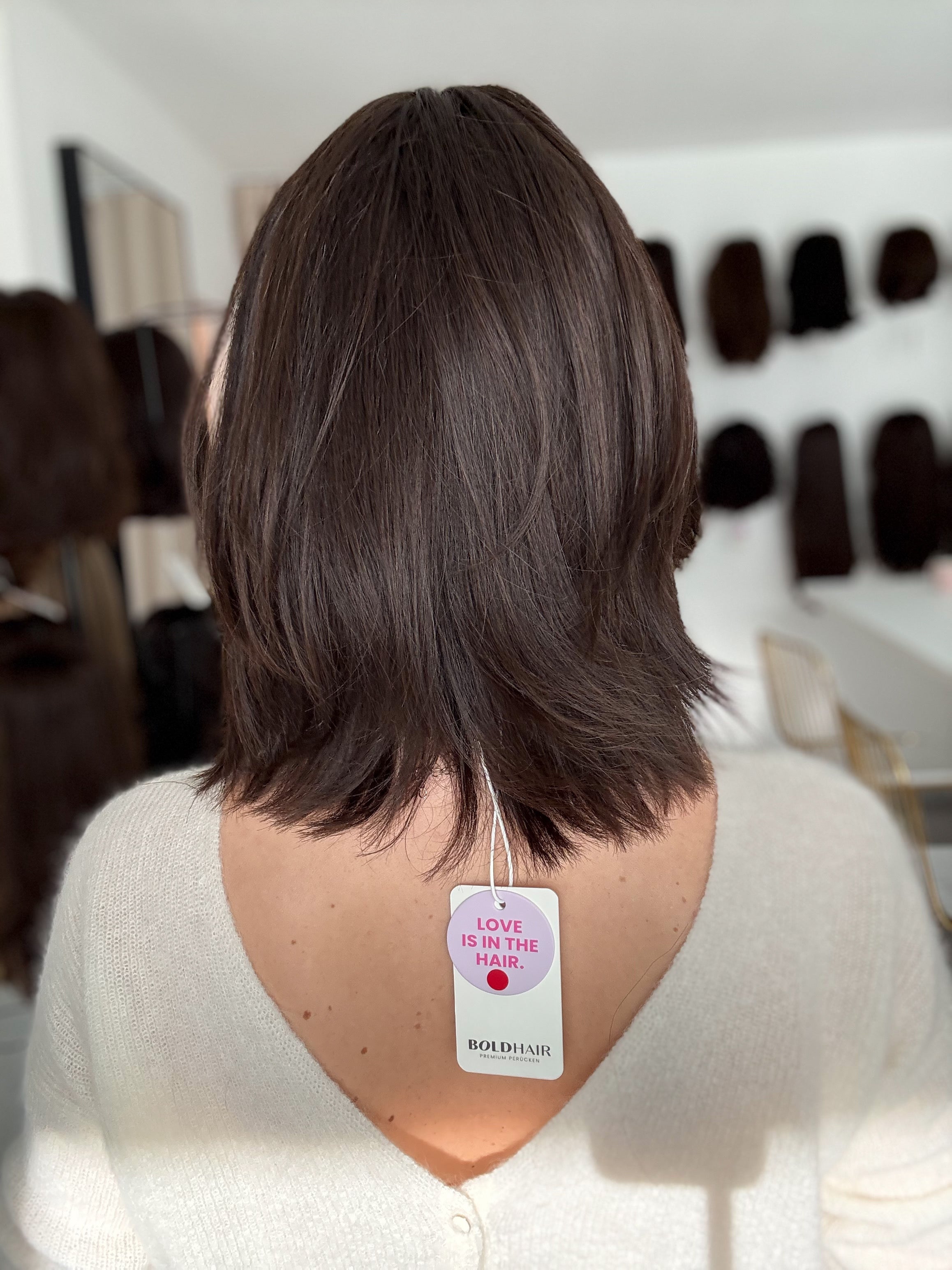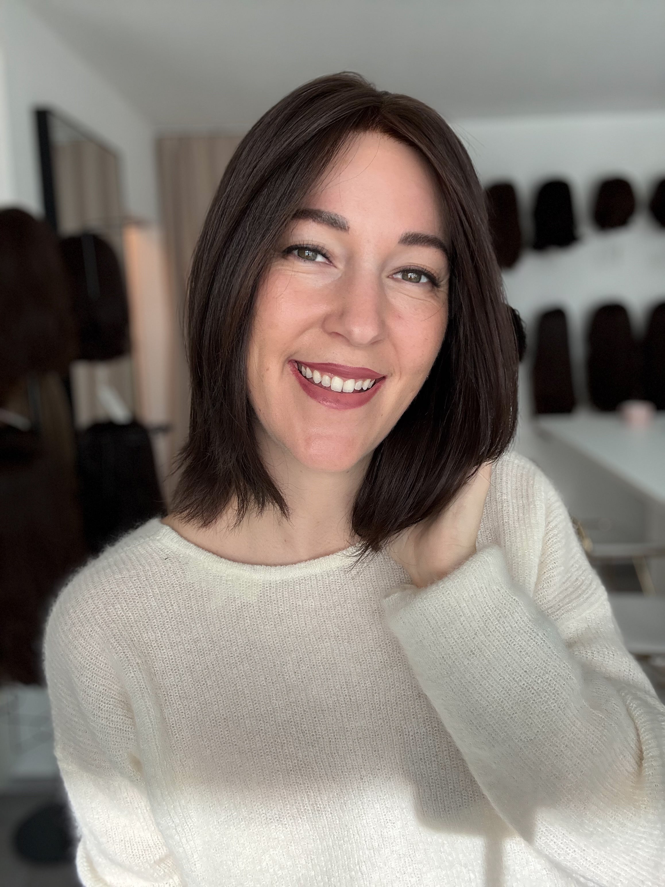 - Farbe: natürliches Mittel- bis Dunkelbraun | Achtung: dieses unbehandelte Haar fällt etwas dunkler aus sonst - aber dennoch einen Tick heller als das nächst dunklere Modell "Nele"