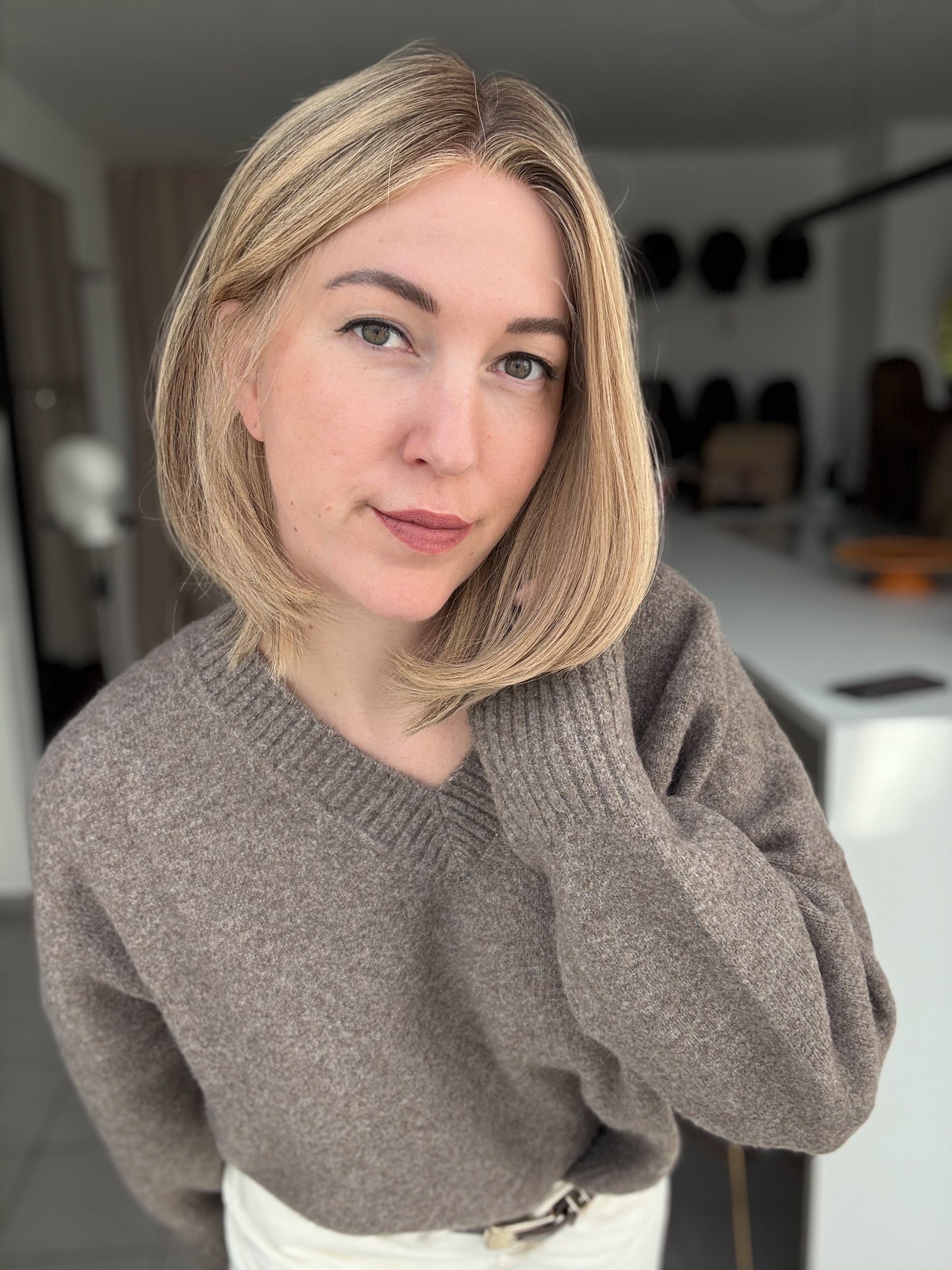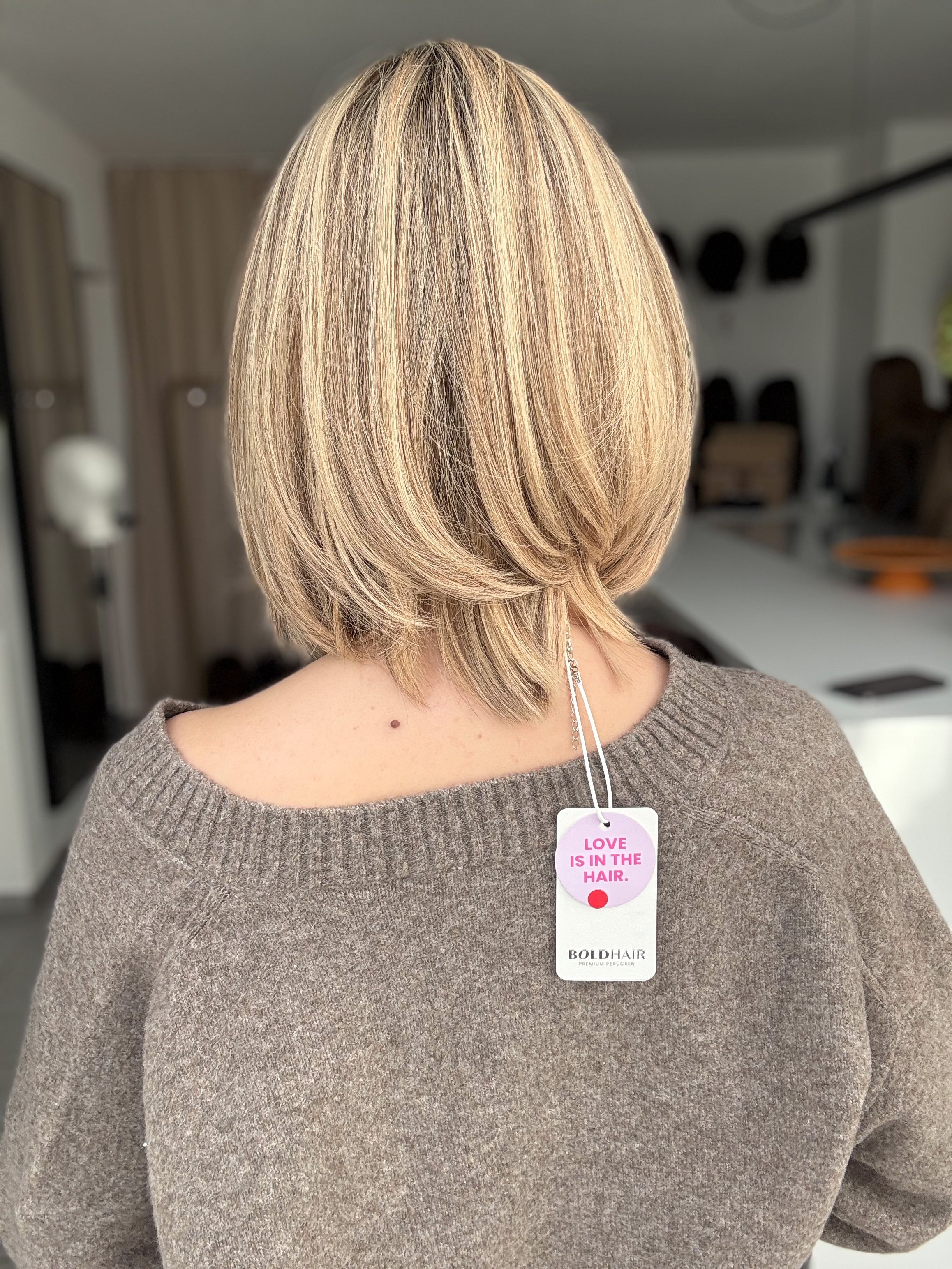 • Farbe: Blond mit High- und Lowlights und dunklem Rooting
