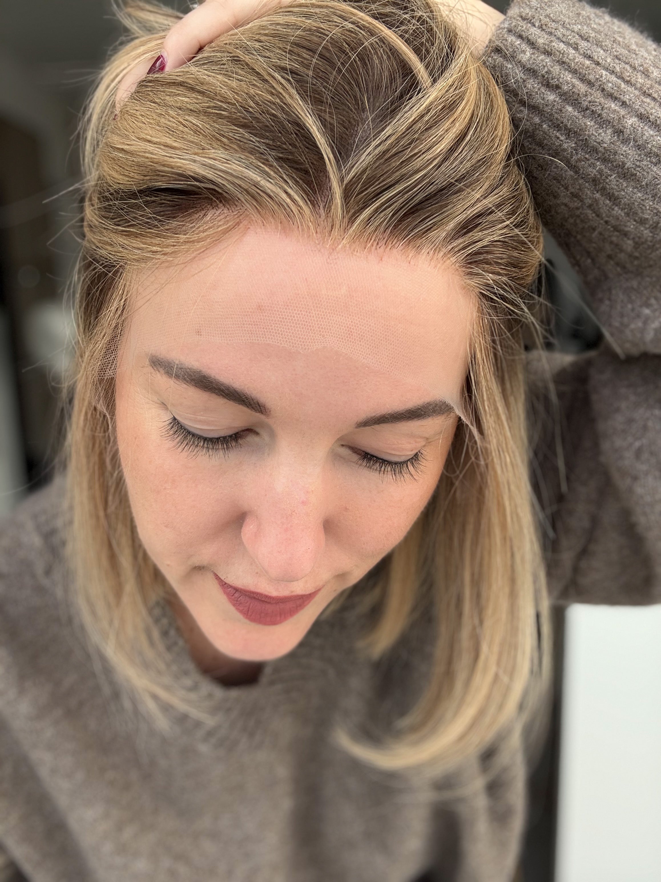 *die Knoten sind gebleicht, jedoch können diese nur bis zu einem gewissen Punkt blondiert werden ohne die Integrität der Perücke zu gefährden. Manche Knoten nehmen die Farbe besser an als andere, so dass einige Modelle auch nach dem Bleichen immer noch dunklere Knoten aufweisen können als andere. Knoten können ganz leicht mit  hellem Puder oder einem leichten Highlighter- oder Lidschattenpuder kaschiert werden.