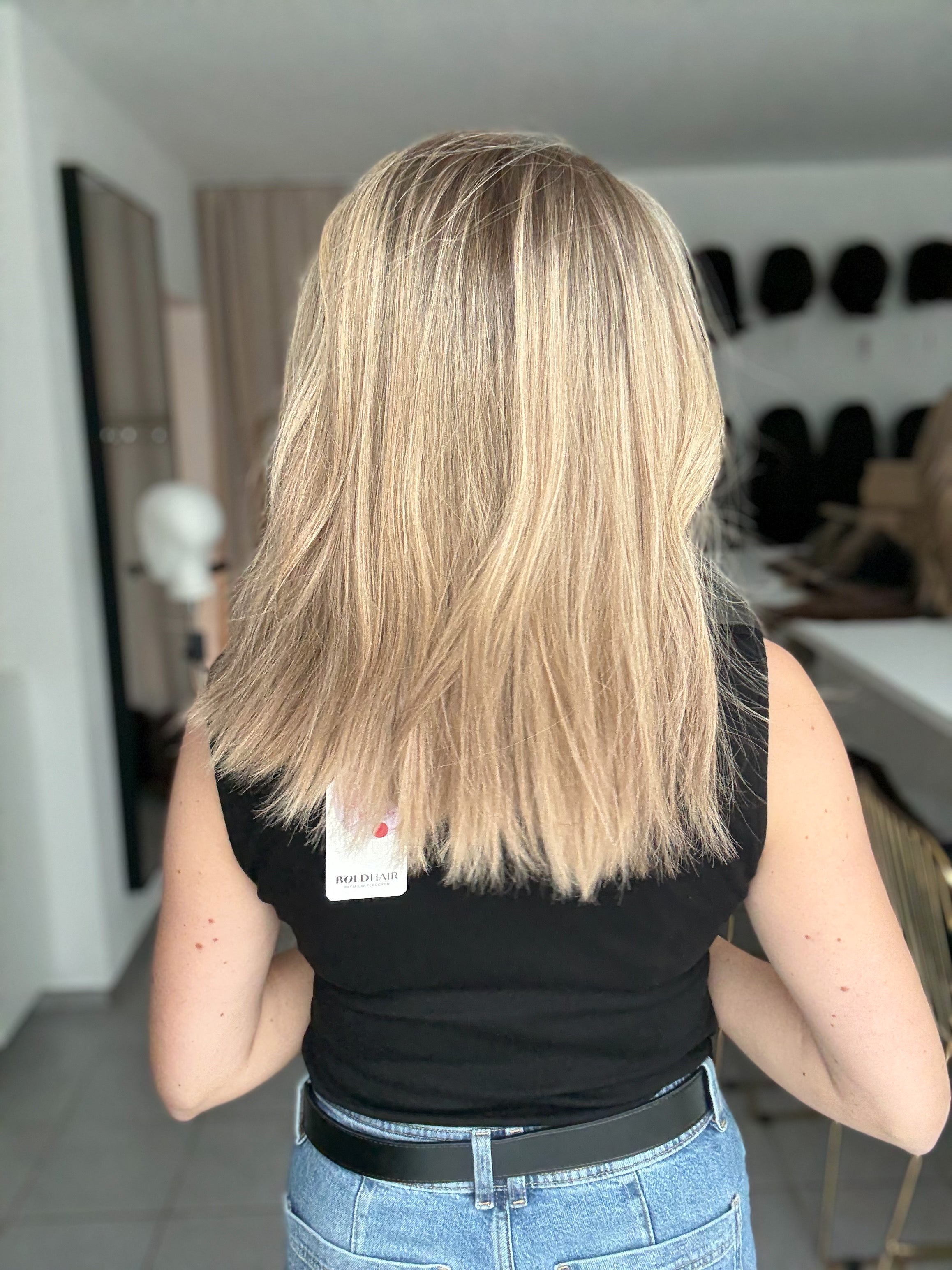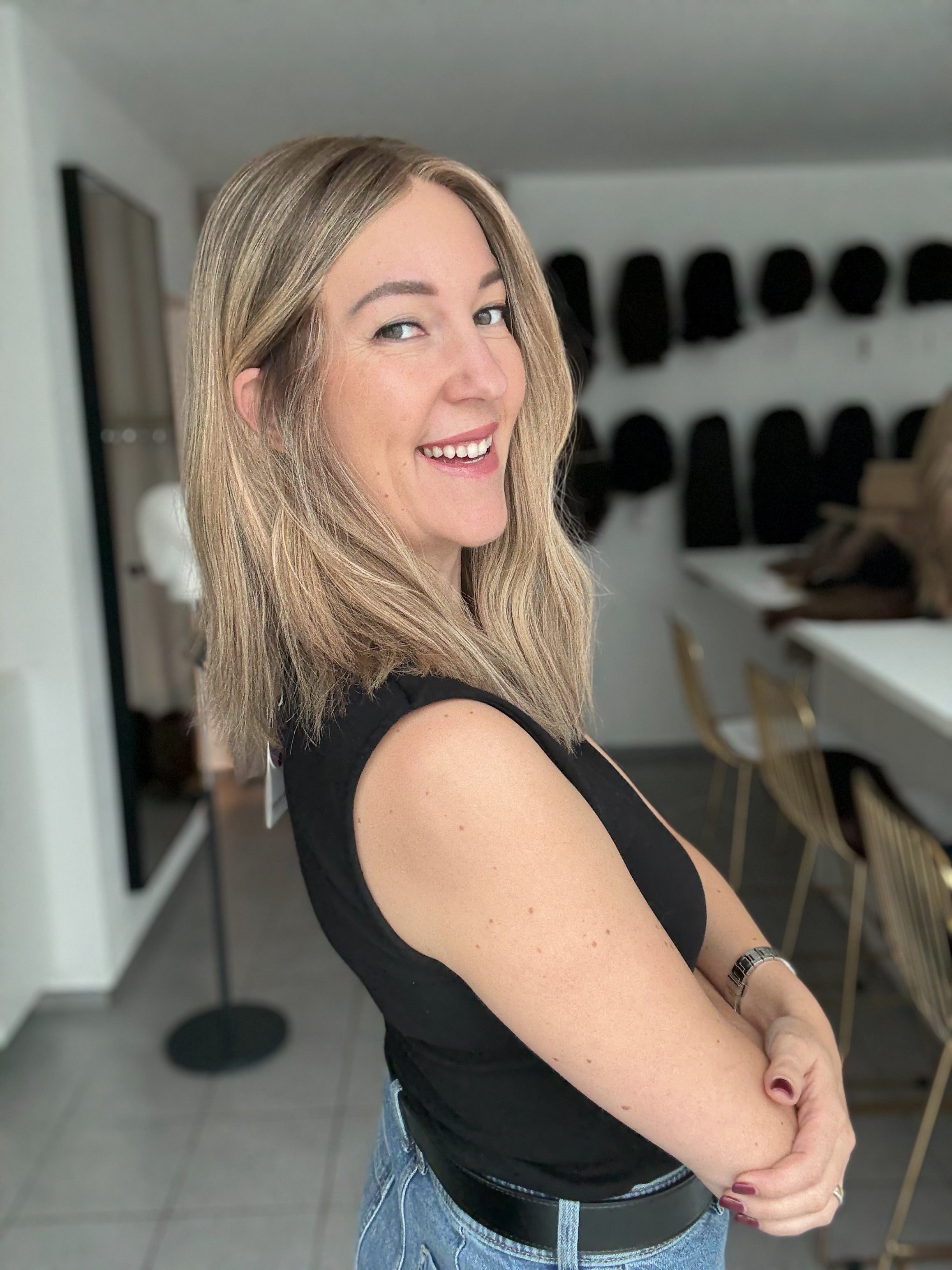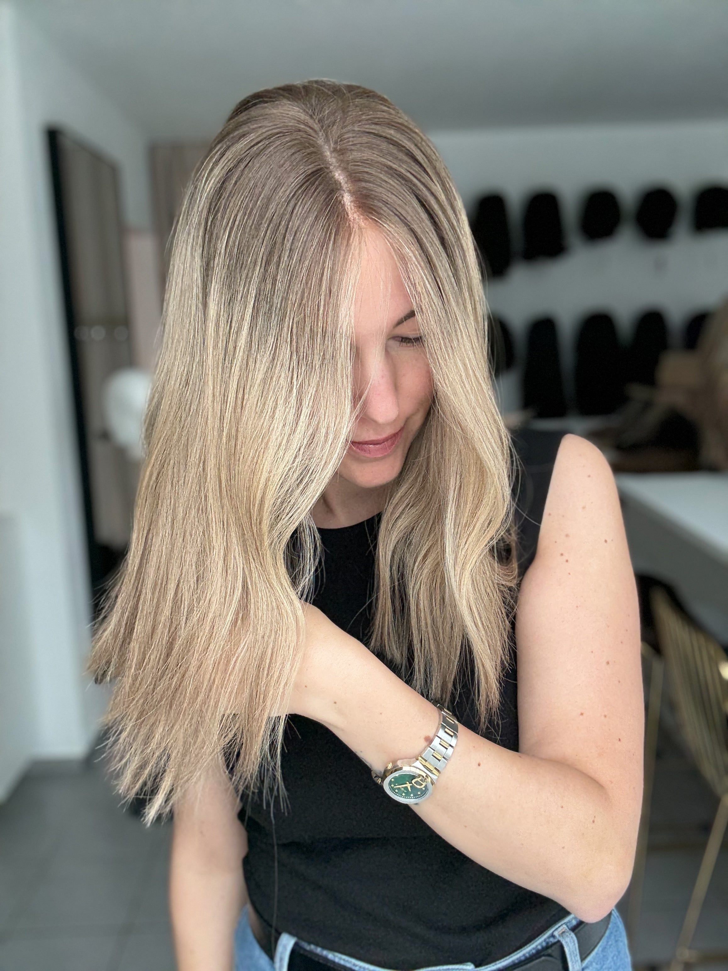 - Farbe: Dunkelblond mit vielen wärmeren und kühleren High- und Lowlights, dunkleres Rooting