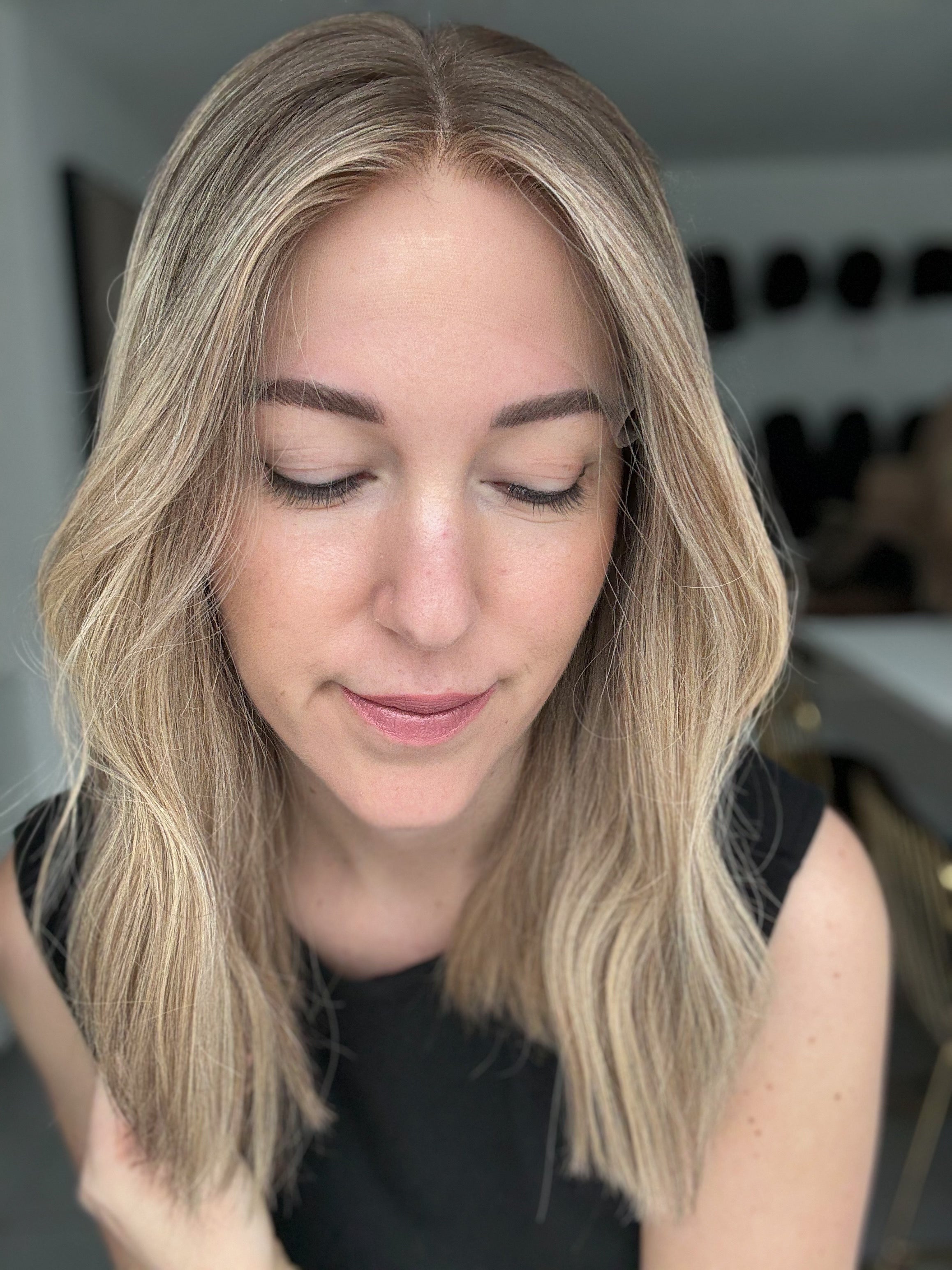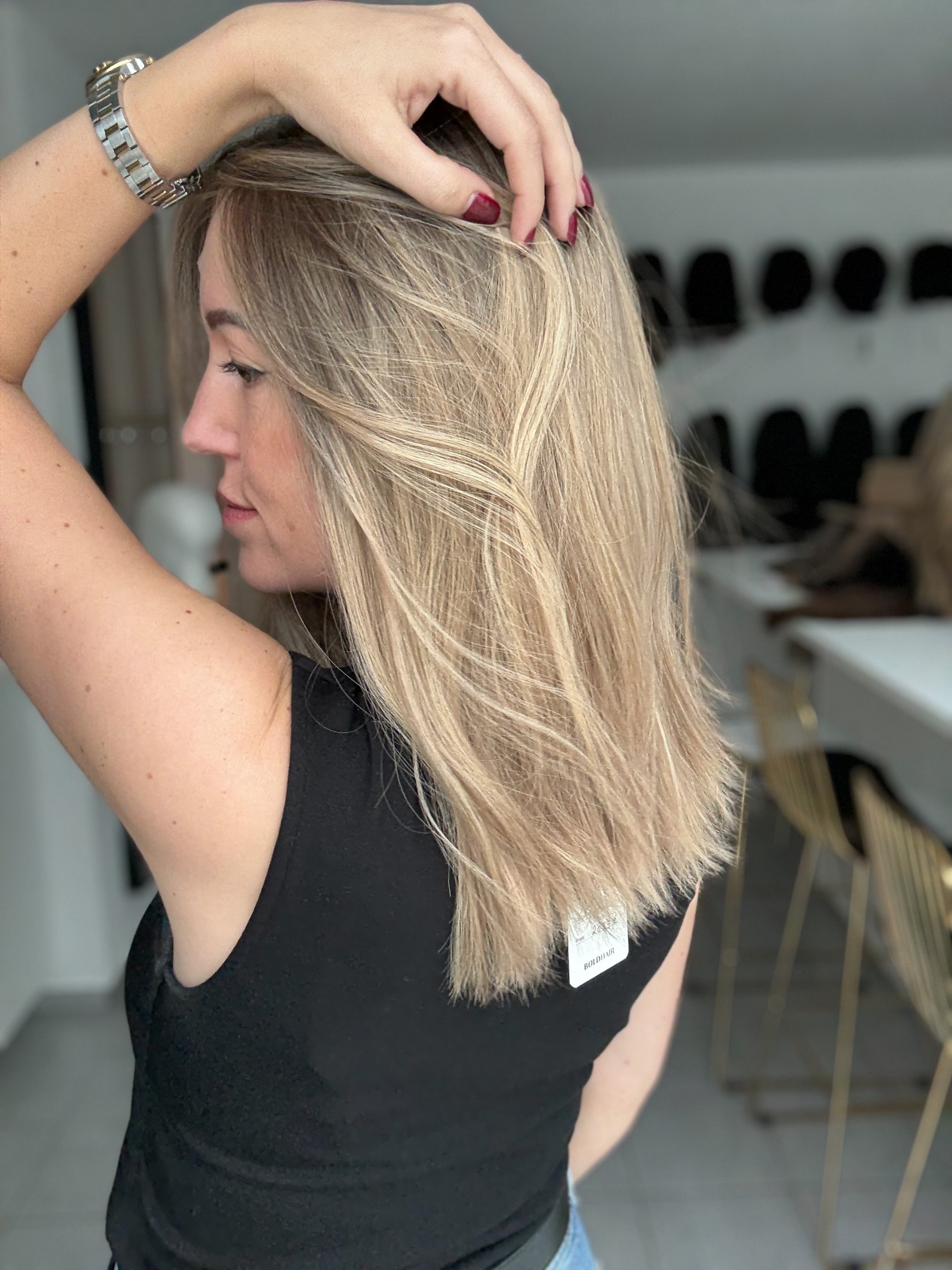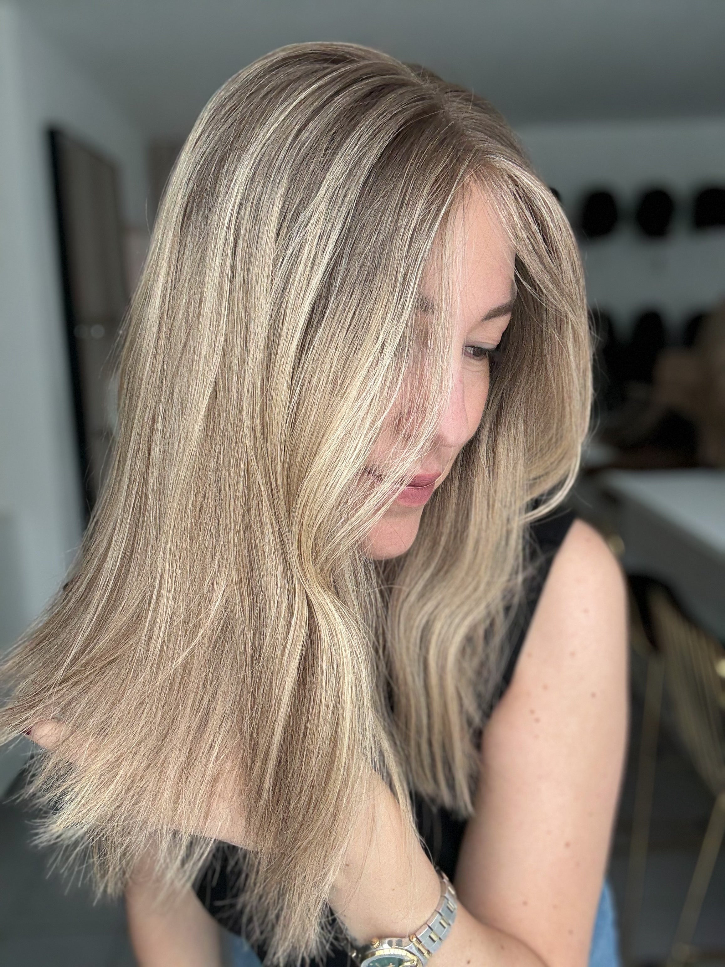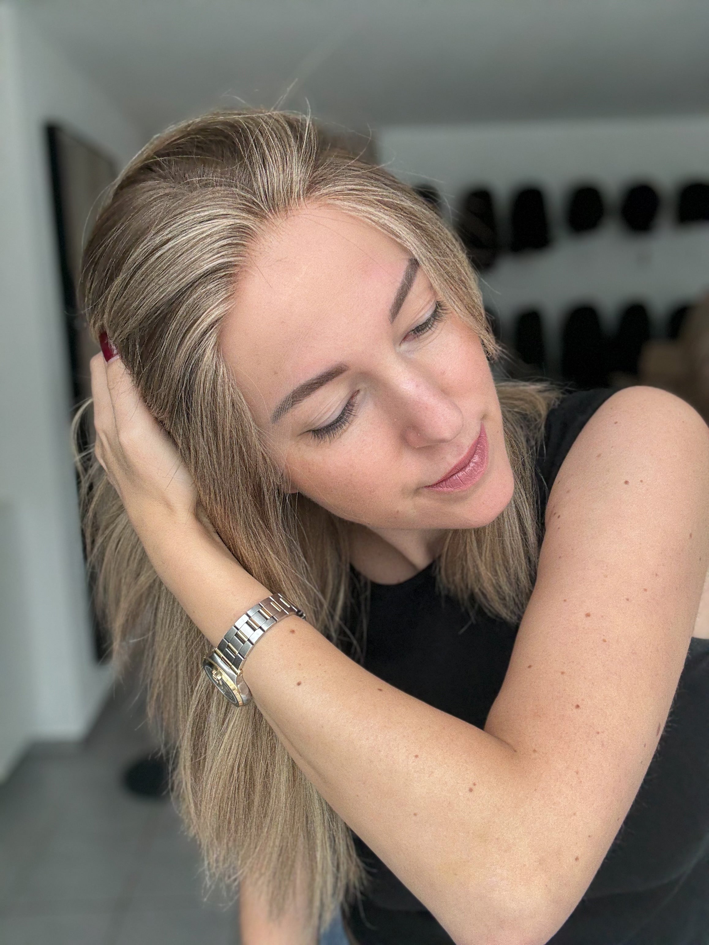 - Farbe: Dunkelblond mit vielen wärmeren und kühleren High- und Lowlights, dunkleres Rooting