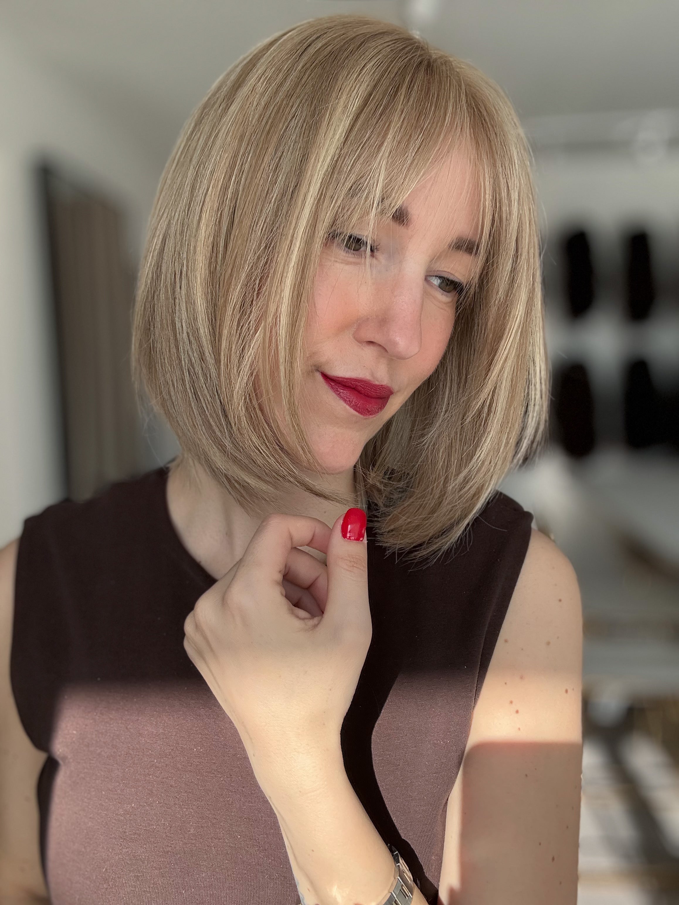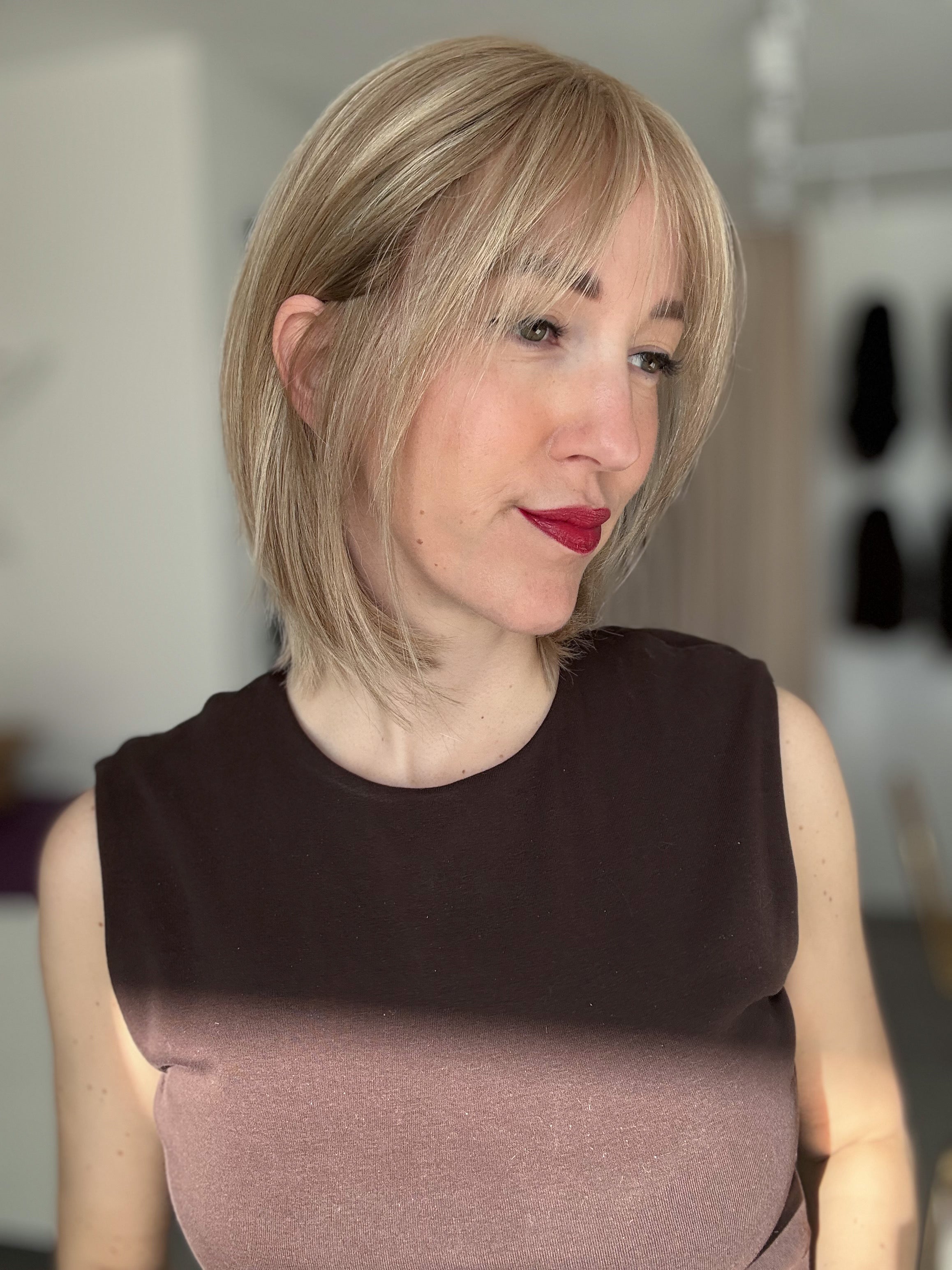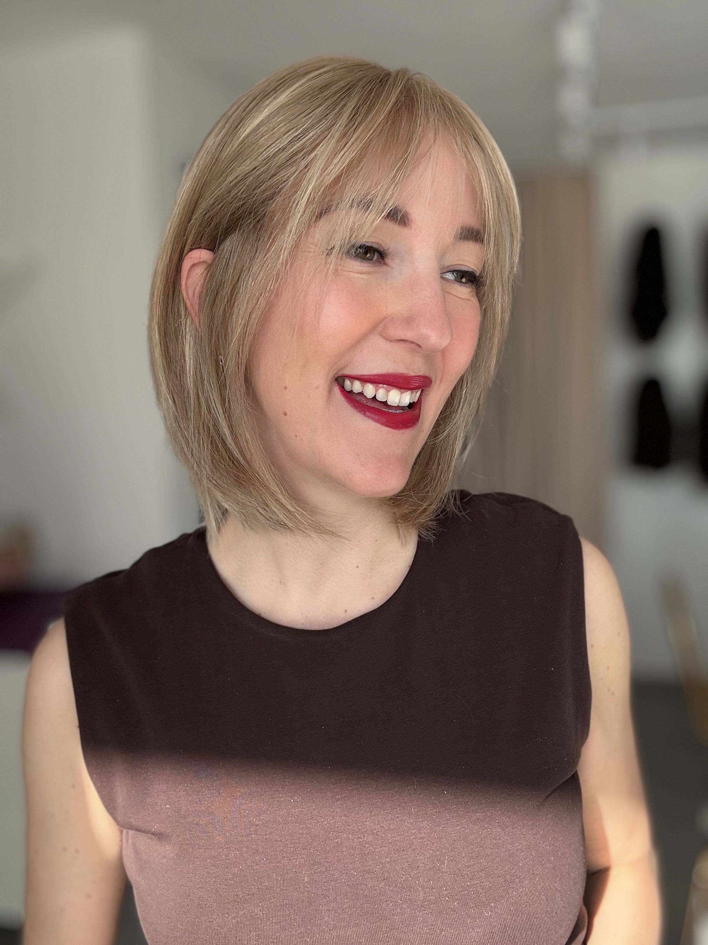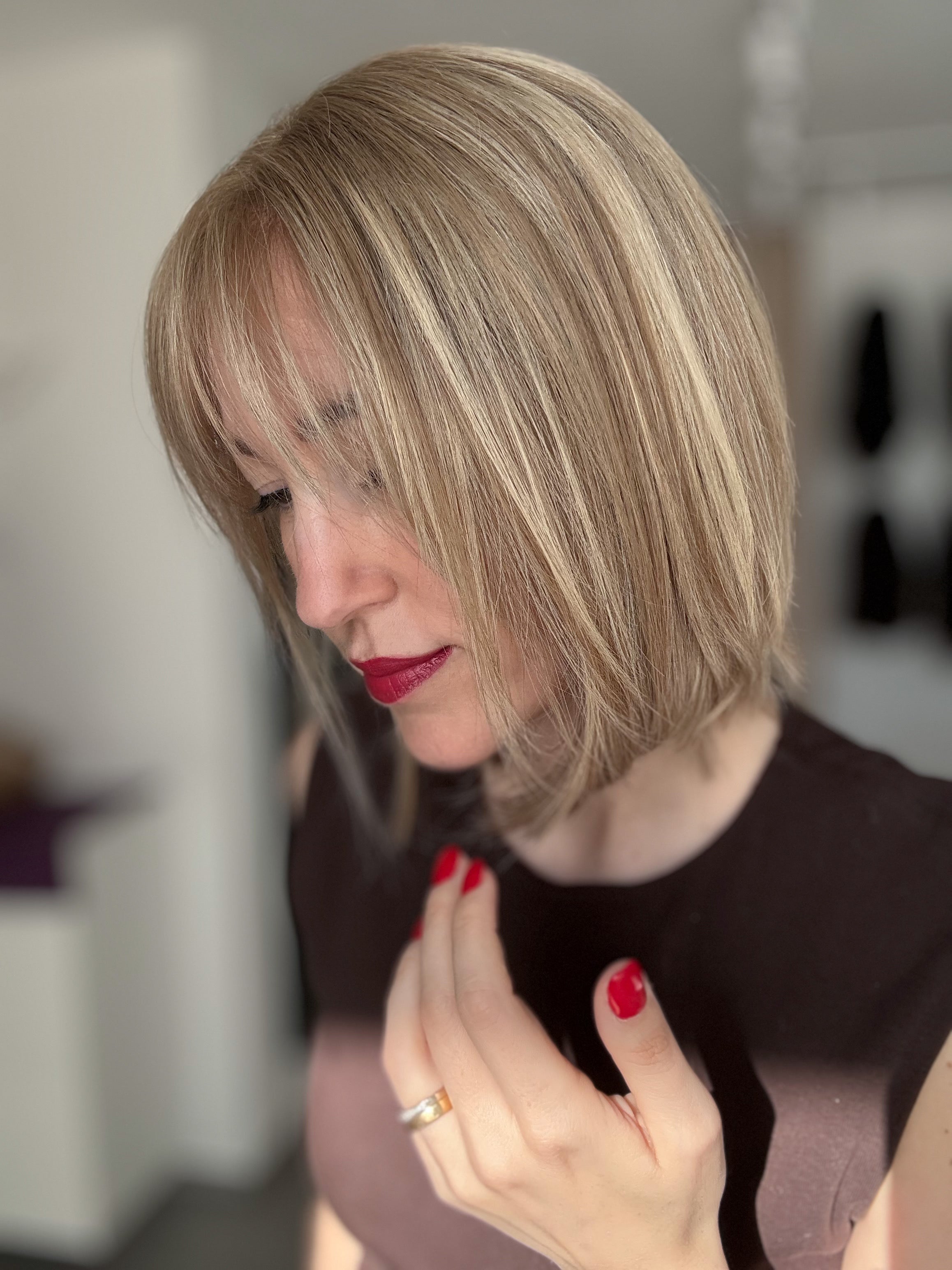 - Schnitt: leicht angestuft, feine Ponyfransen