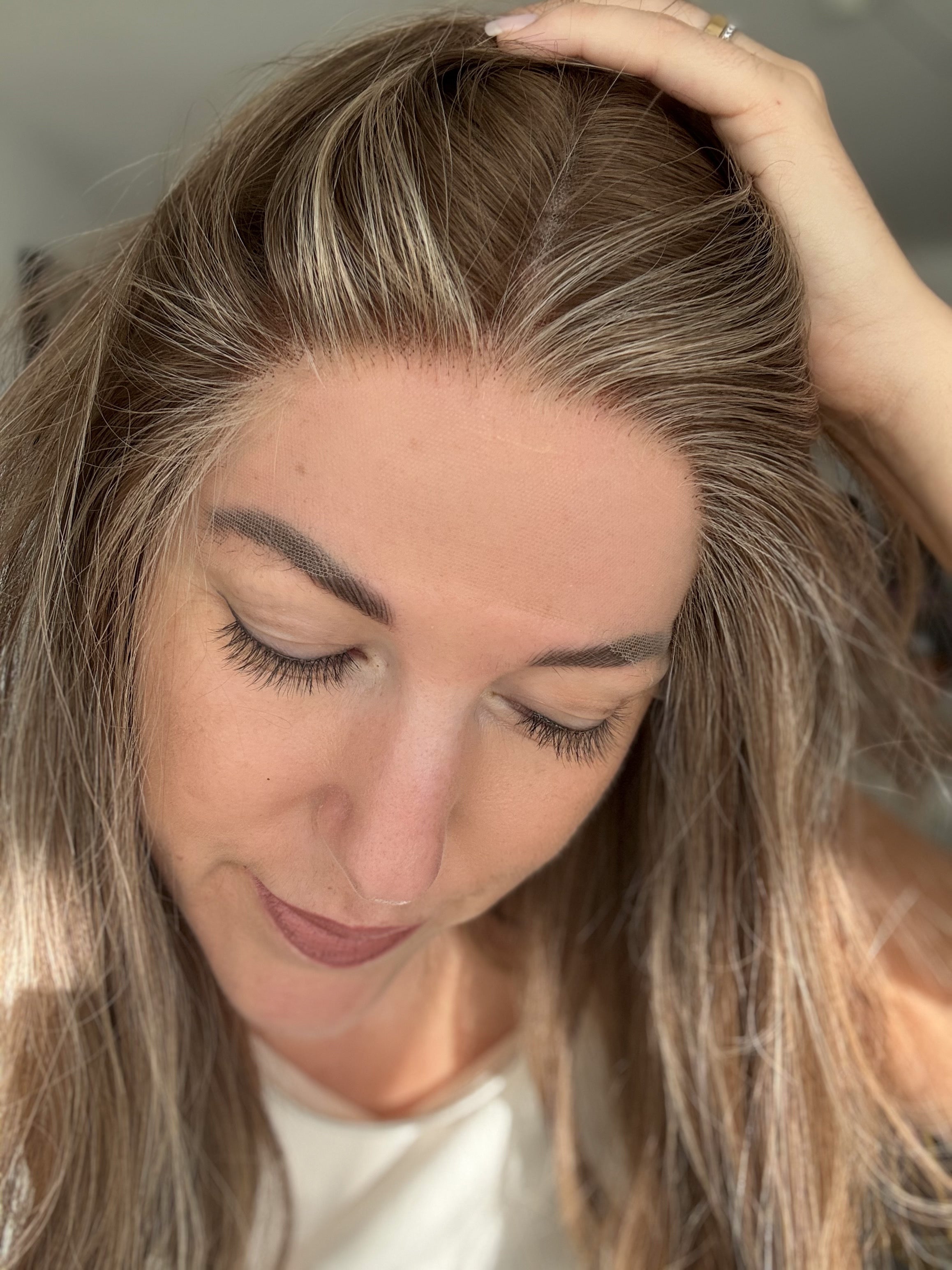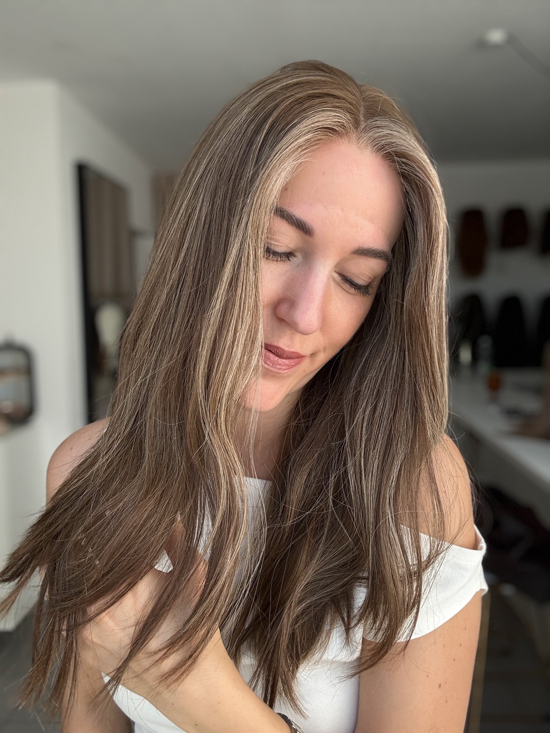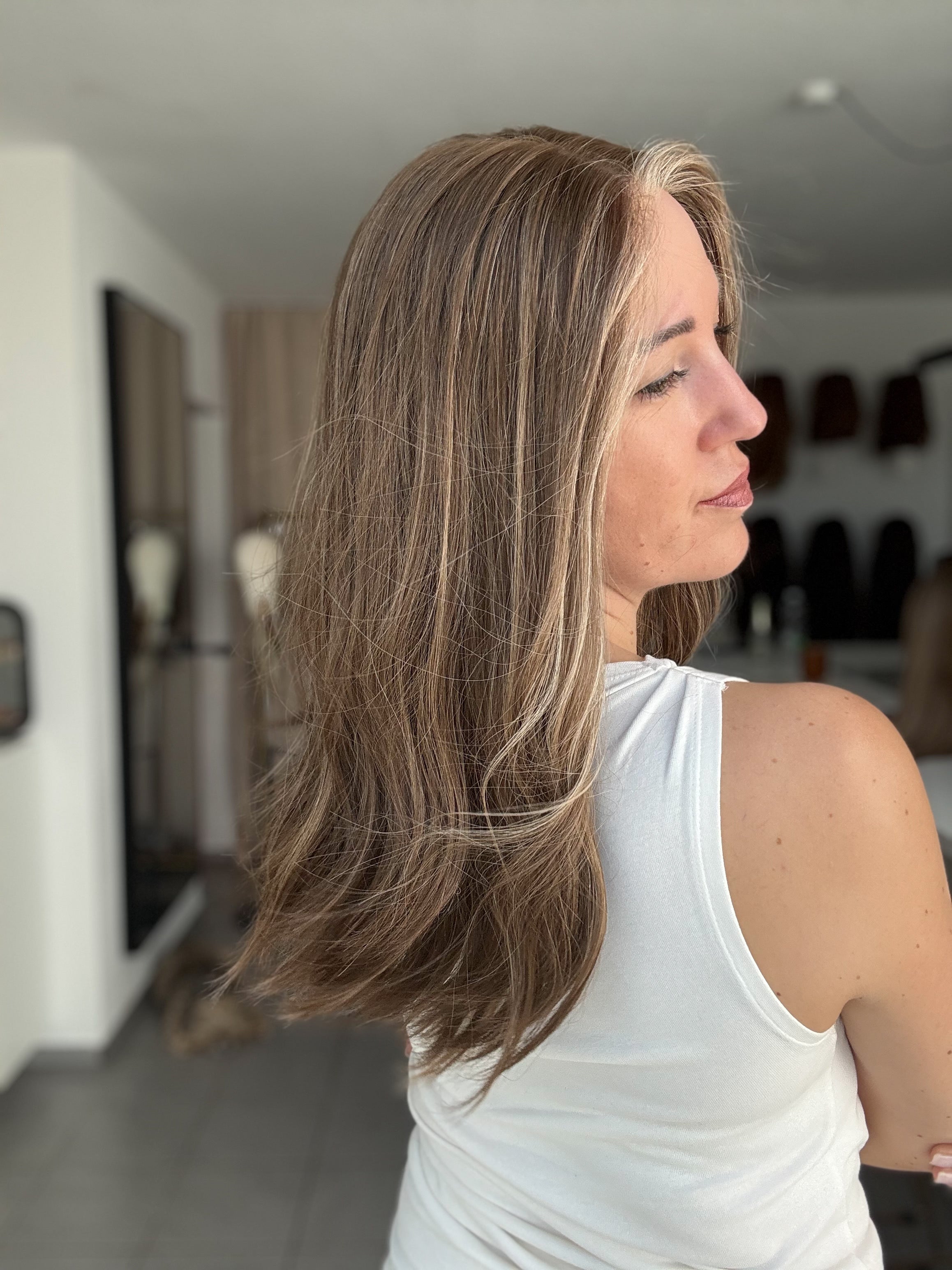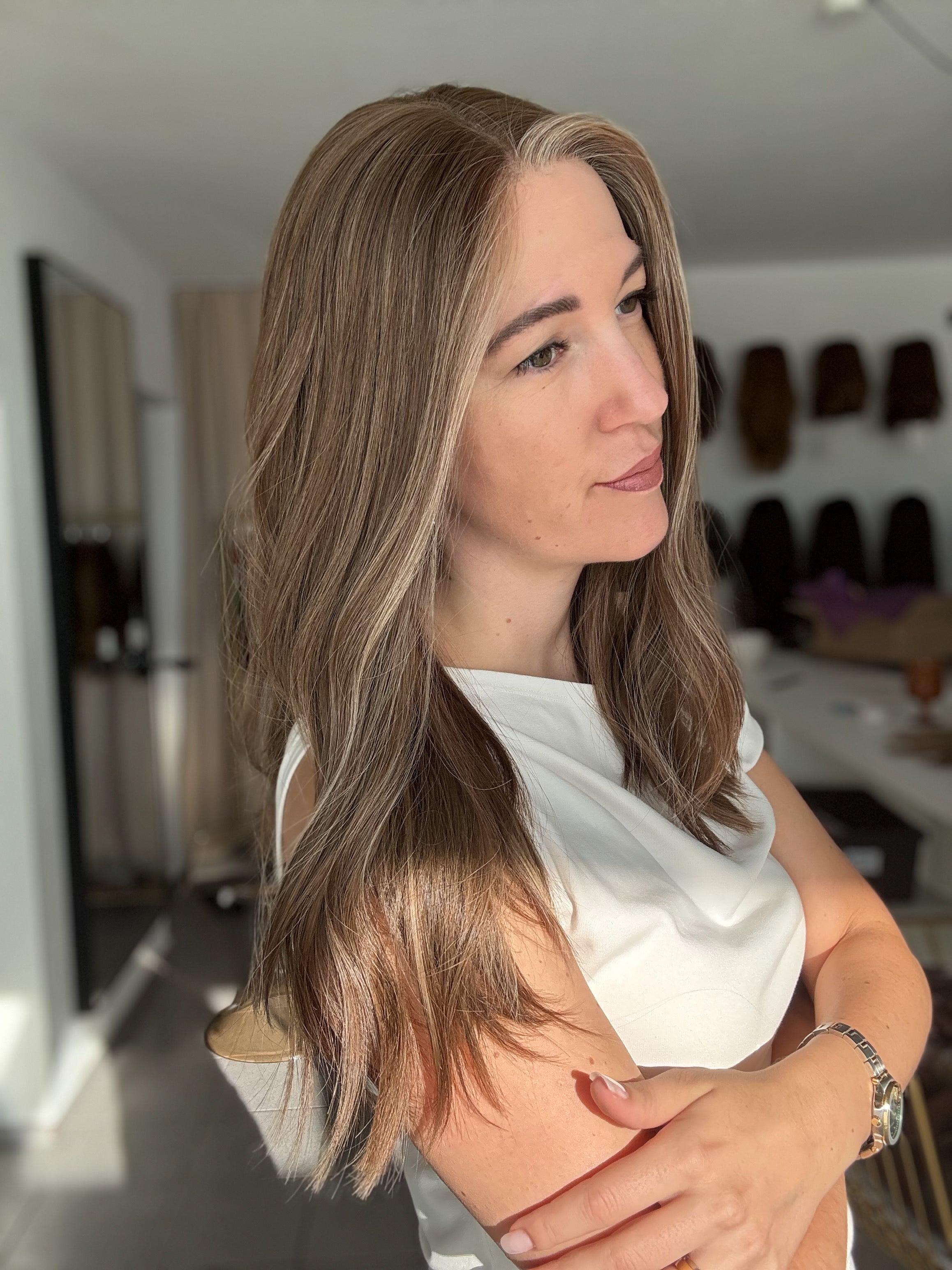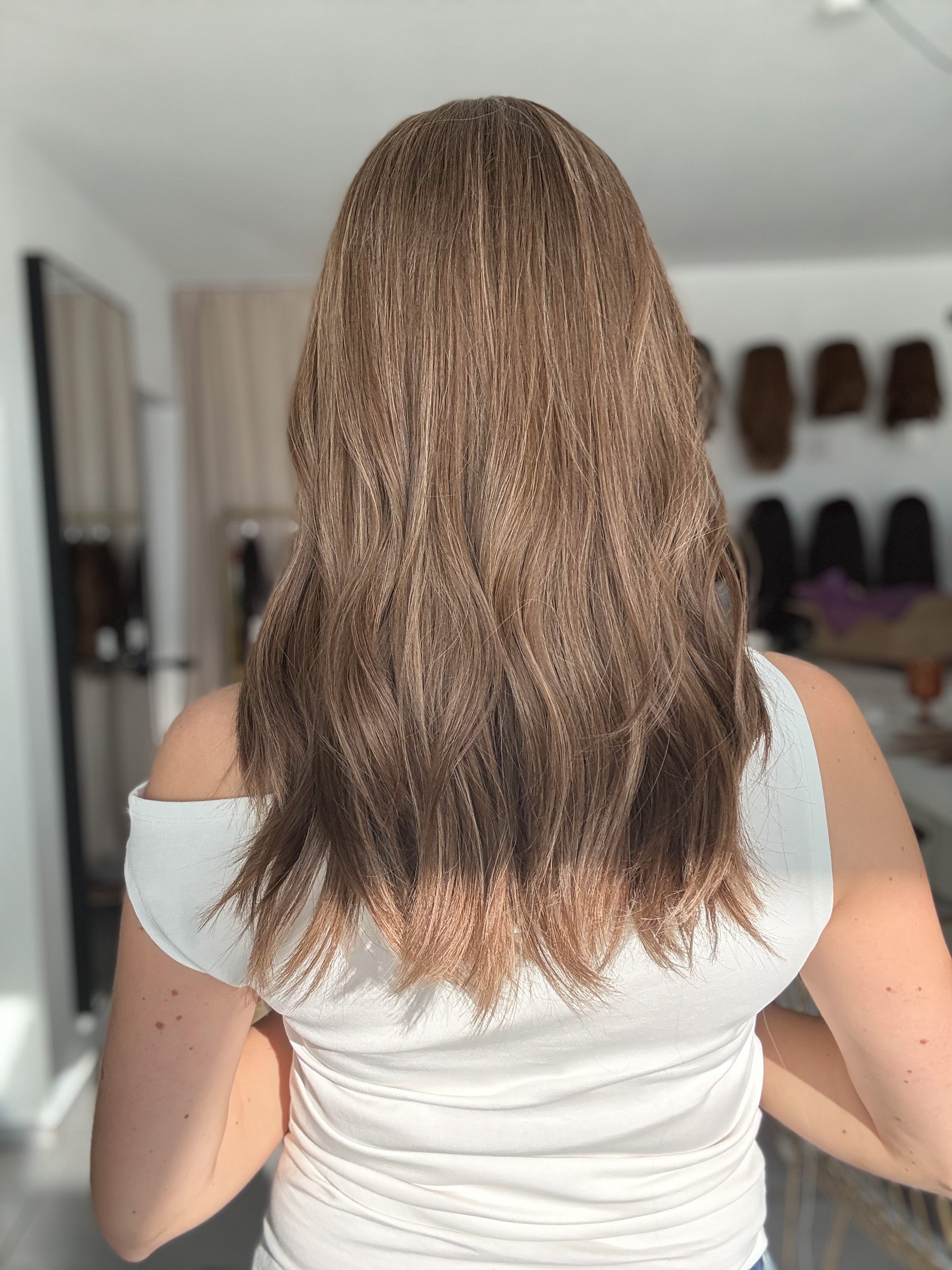 - Farbe: Mittel- bis Hellbraun mit subtilen neutralblonden Highlights und hellem Faceframing (aschig)
