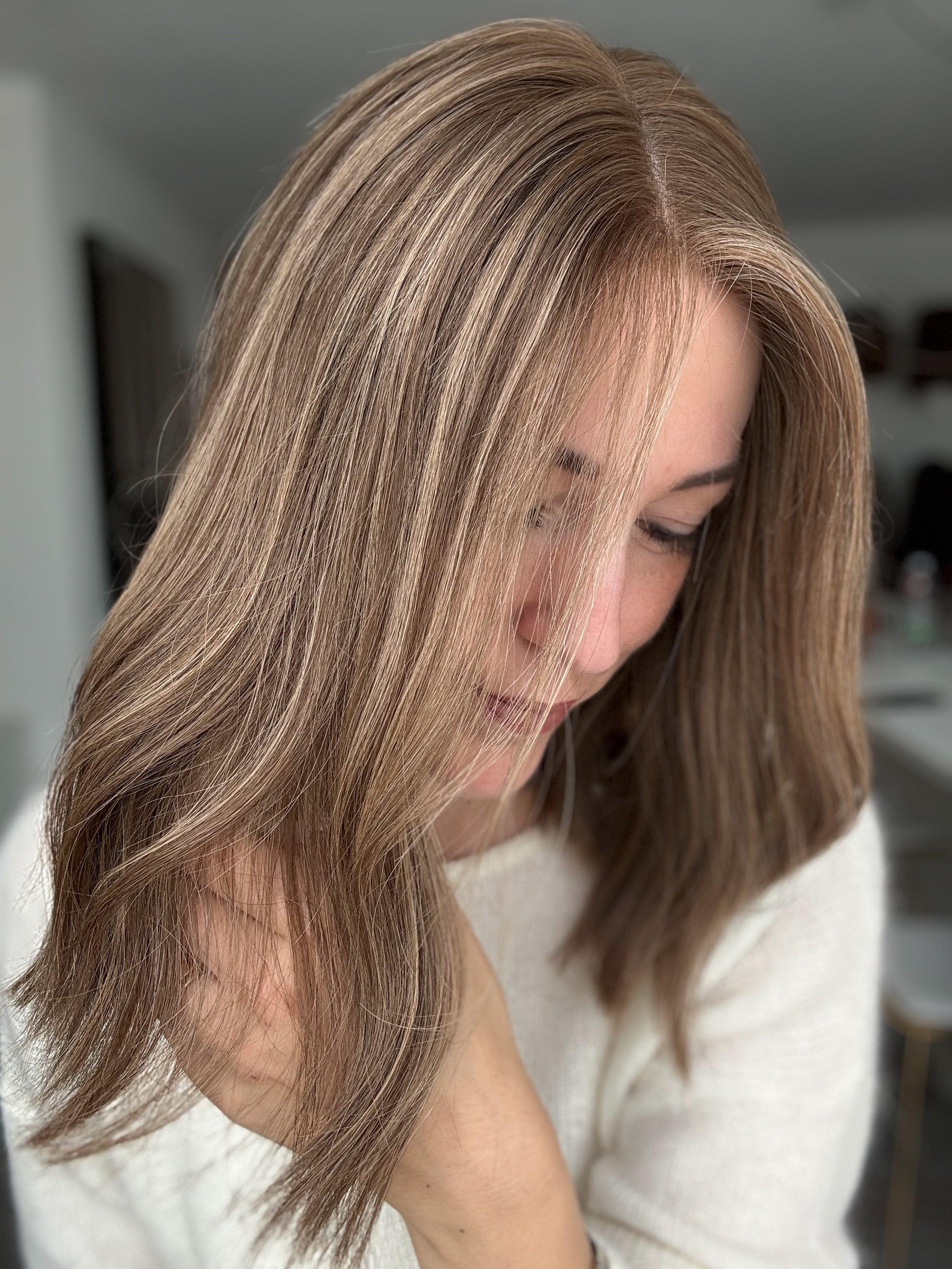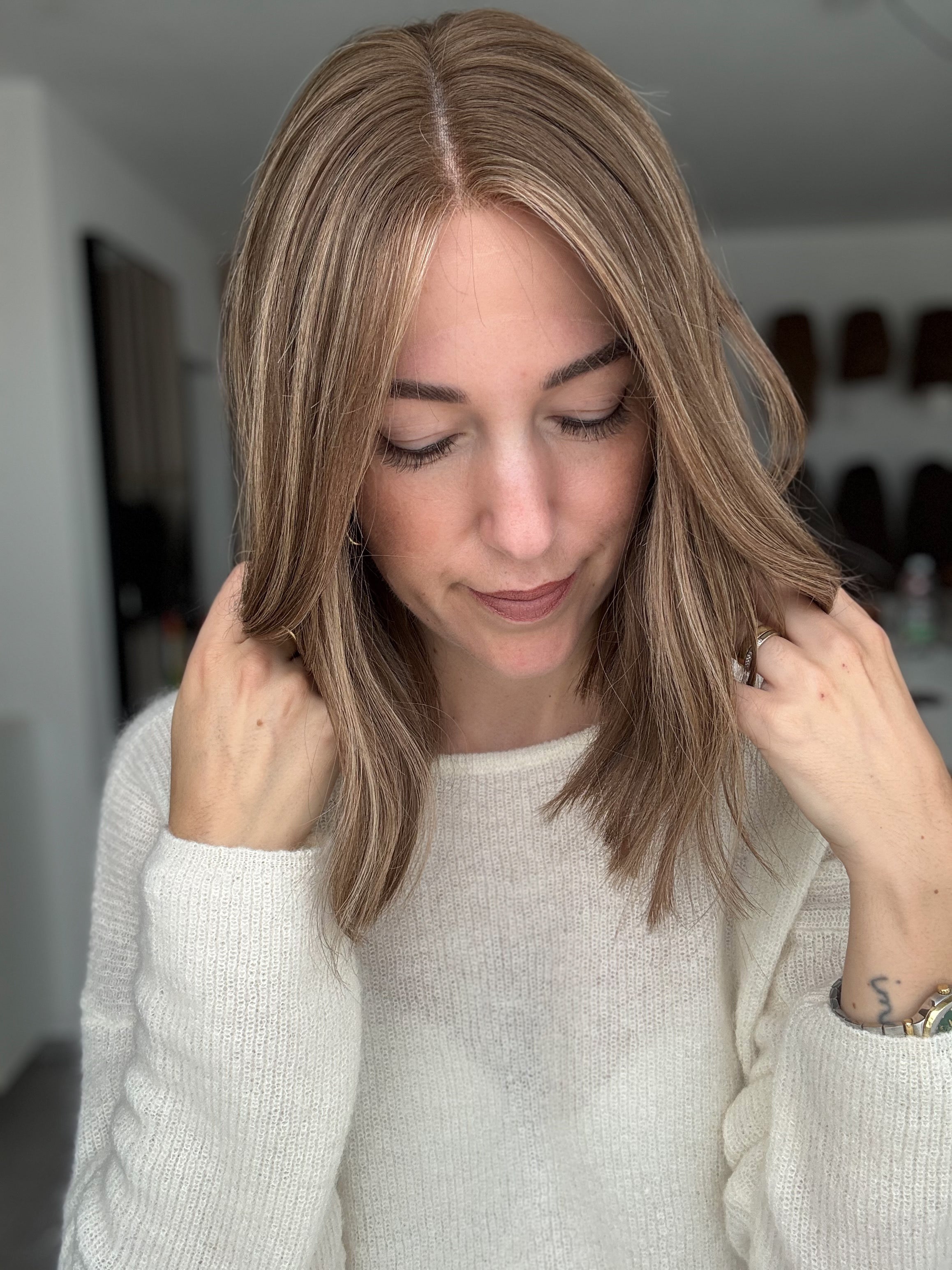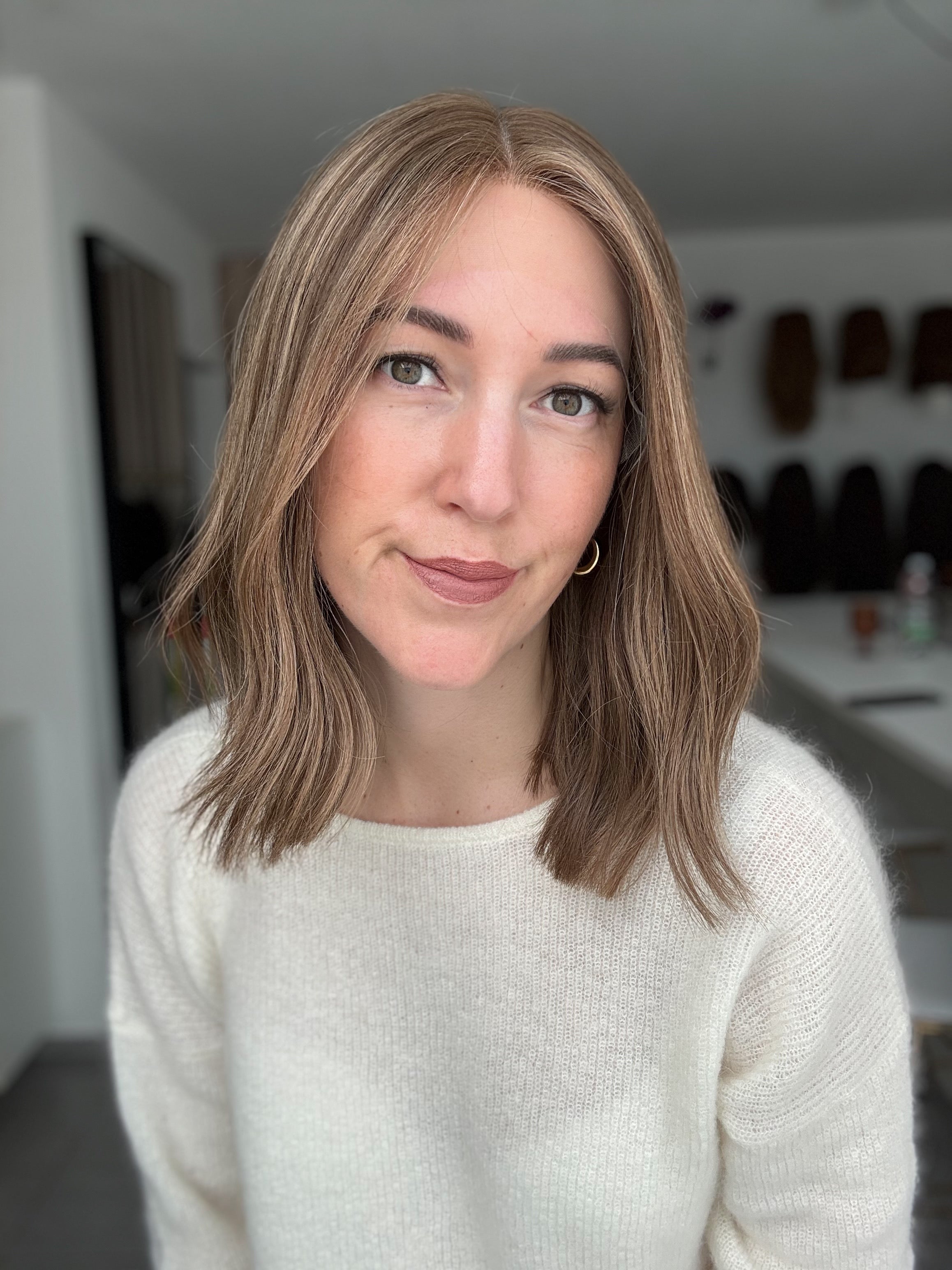 - Farbe: Mittel- bis Hellbraun mit subtilen neutralblonden Highlights und hellem Faceframing (aschig)