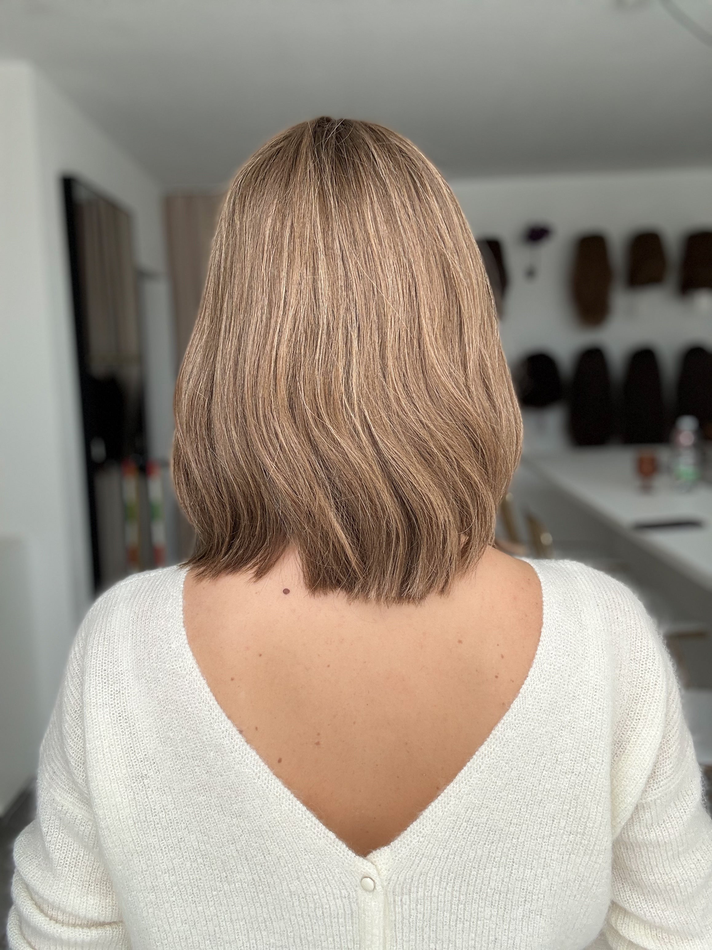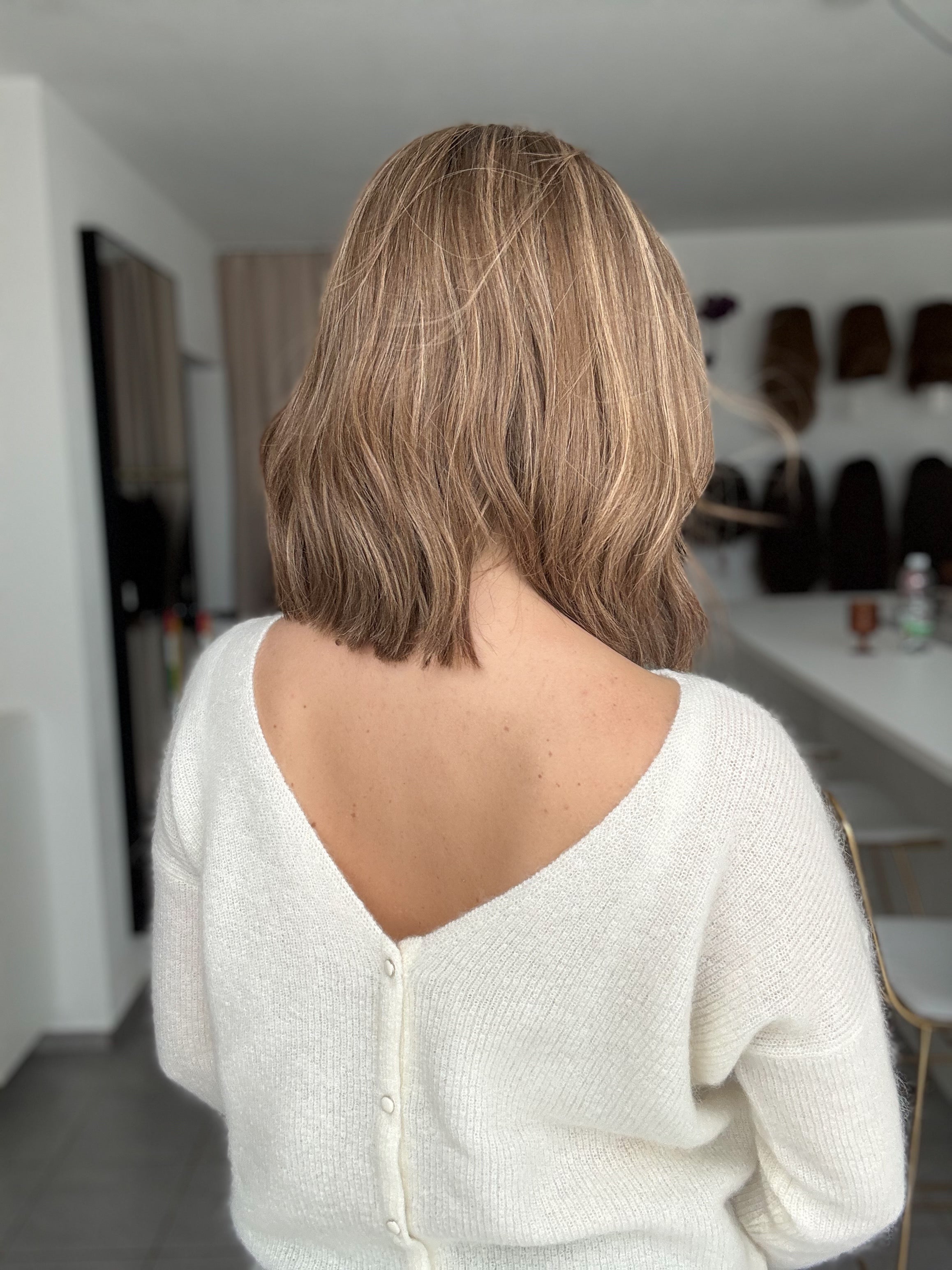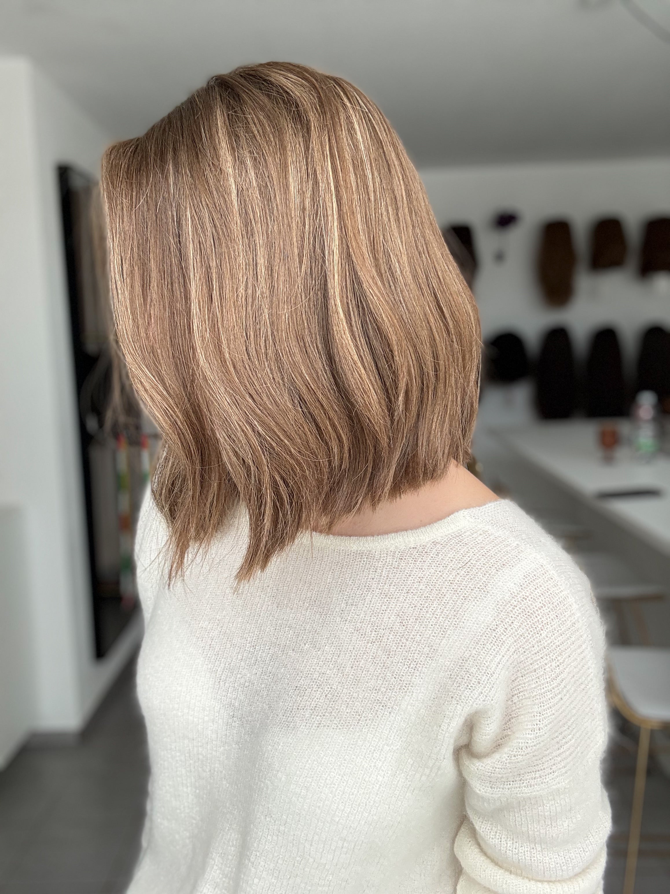 - Farbe: Mittel- bis Hellbraun mit subtilen neutralblonden Highlights und hellem Faceframing (aschig)