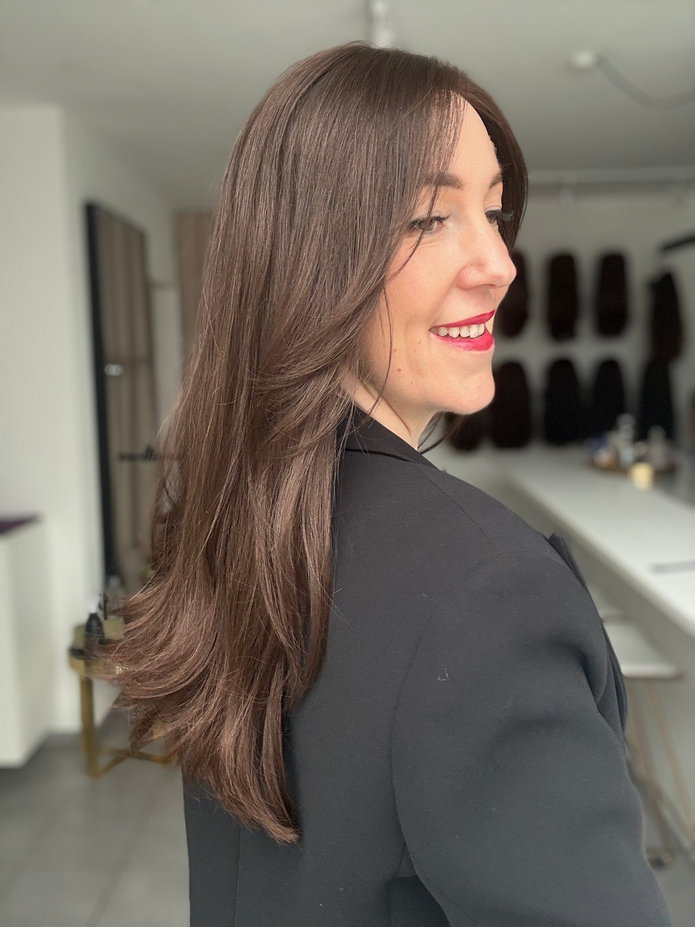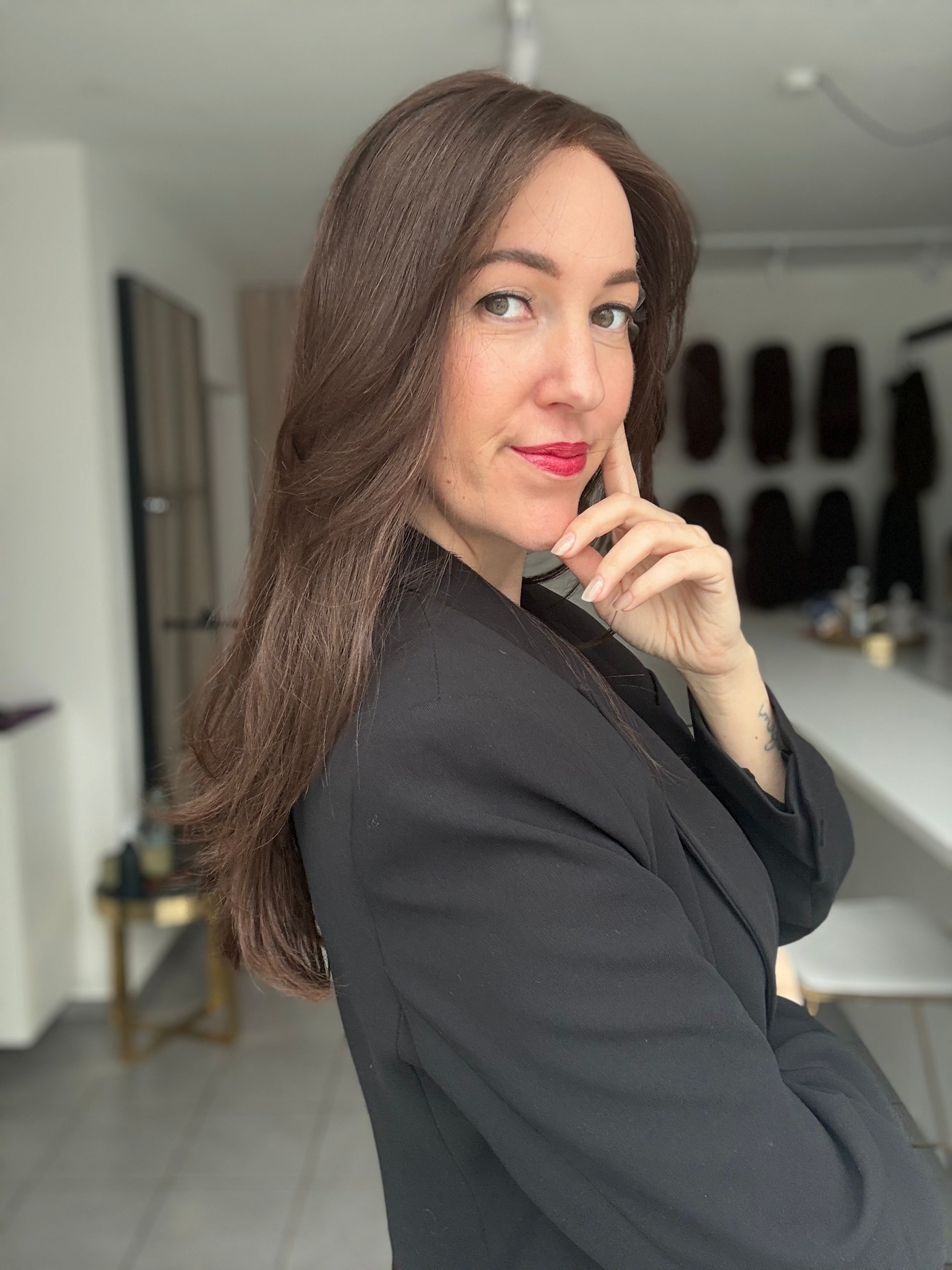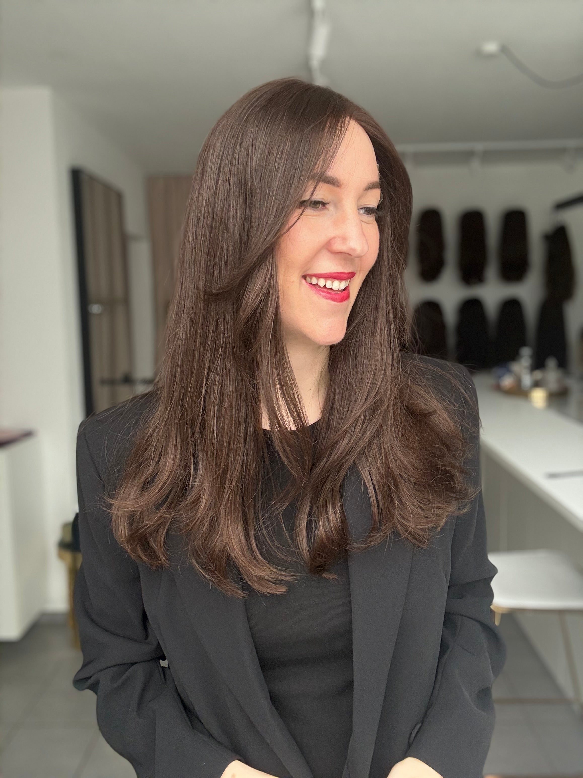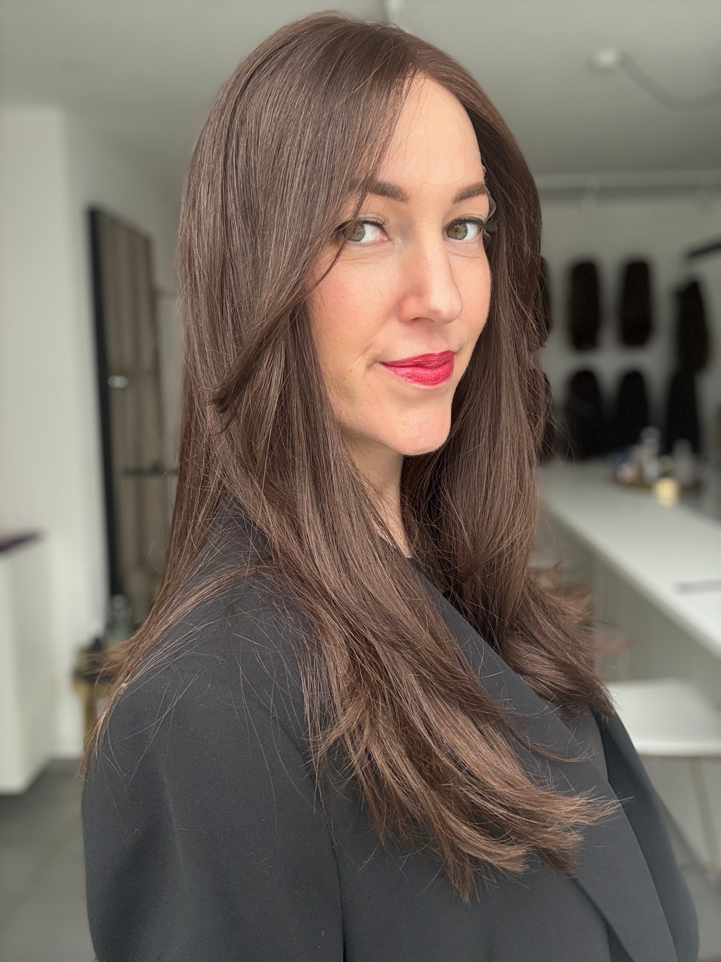 - Haarlänge: ca. 55 cm vom Scheitel bis in die Spitzen gemessen