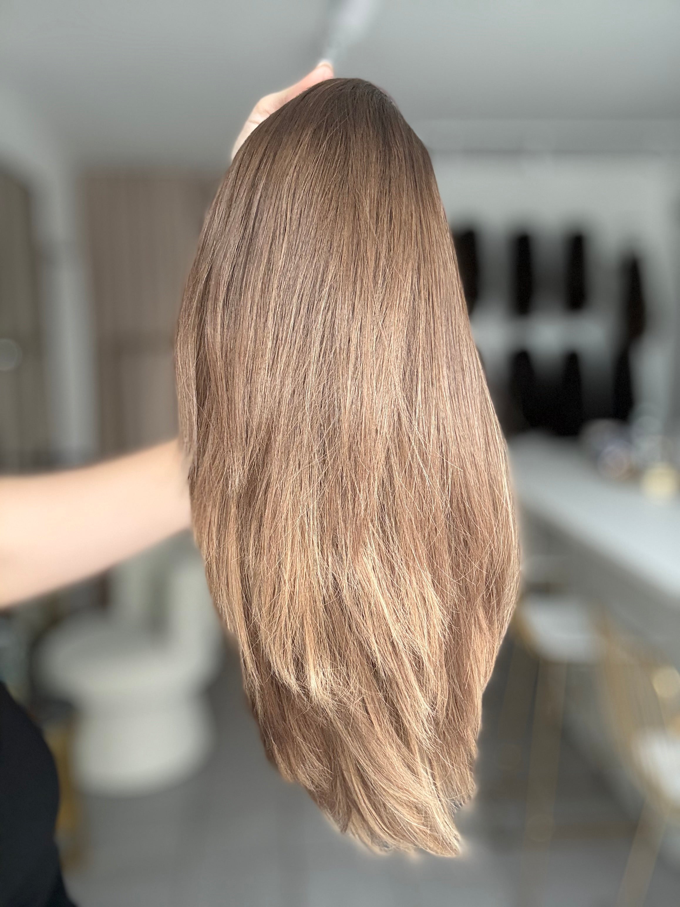 - ca. 40-45 cm Haarlänge gemessen vom Band bis in die Spitzen